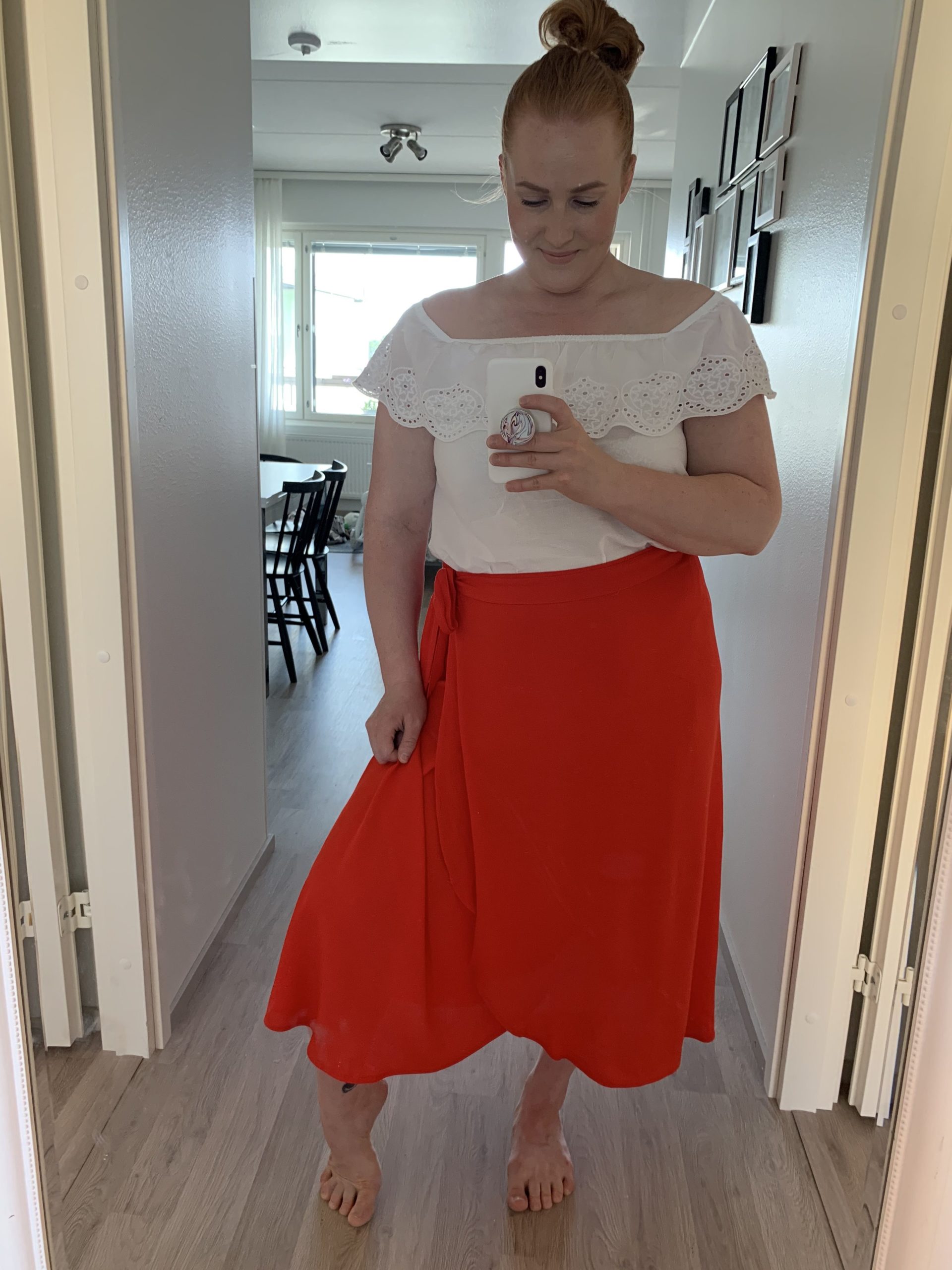 Tämä tuli heti mieleeni. Tämä oli kesän ehdoton lemppari! Tässä asussa tunsin itseni aina tosi hyvännäköiseksi. Punainen ja valkoinen on toimiva yhdistelmä, raikas ja kuitenkin klassinen. Paita on oikeasti odotusajaltani, se on H&M mama -malliston paita, muttei todellakaan haittaa minua! Se on kaunis ja ajaton. Onneksi ostin odotusaikana monikäyttöisiä vaatteita!