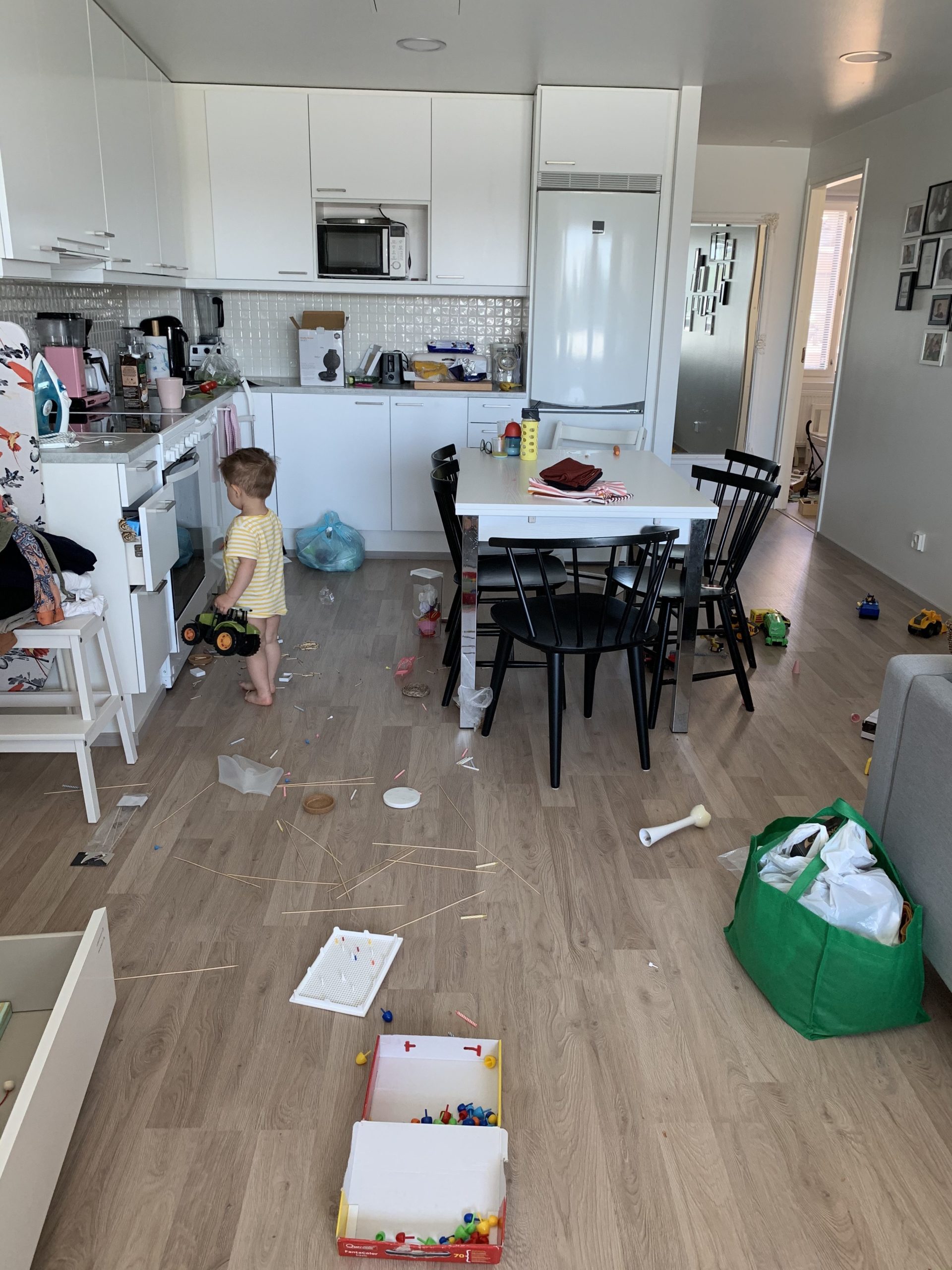 Näissä molemmissa on arki vahvasti läsnä. Ensimmäisessä kuvassa taapero laittaa paikkoja uusiksi, tavarat on levällään ja elämä näkyy. Välillä on kaaos valloillaan ja itsekin jättää tavarat levälleen. Toinen kuva kertoo siitä miten taaperon kanssa viedään roskat. Muovit, pahvit, biojäte ja sekajäte sekä taapero kyytiin ja menoksi!