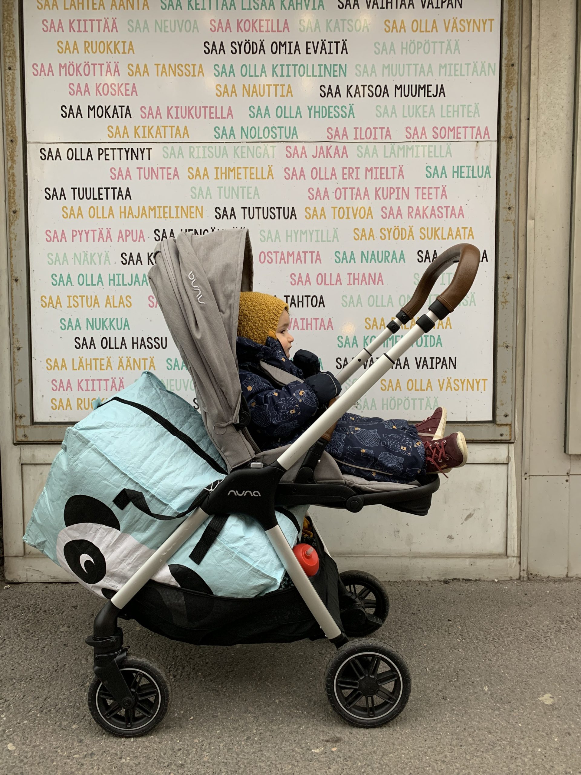 Tämä kuva kyllä naurattaa! Tässä sitä ollaan Tampereella. Sade yllätti, joten vetäsin lapsen sadesuojan päälleni. Menkat yllätti, joten laitoin lapsen vaipan suojaksi. Sellaista se elämä on. Ei pidä ottaa vakavasti