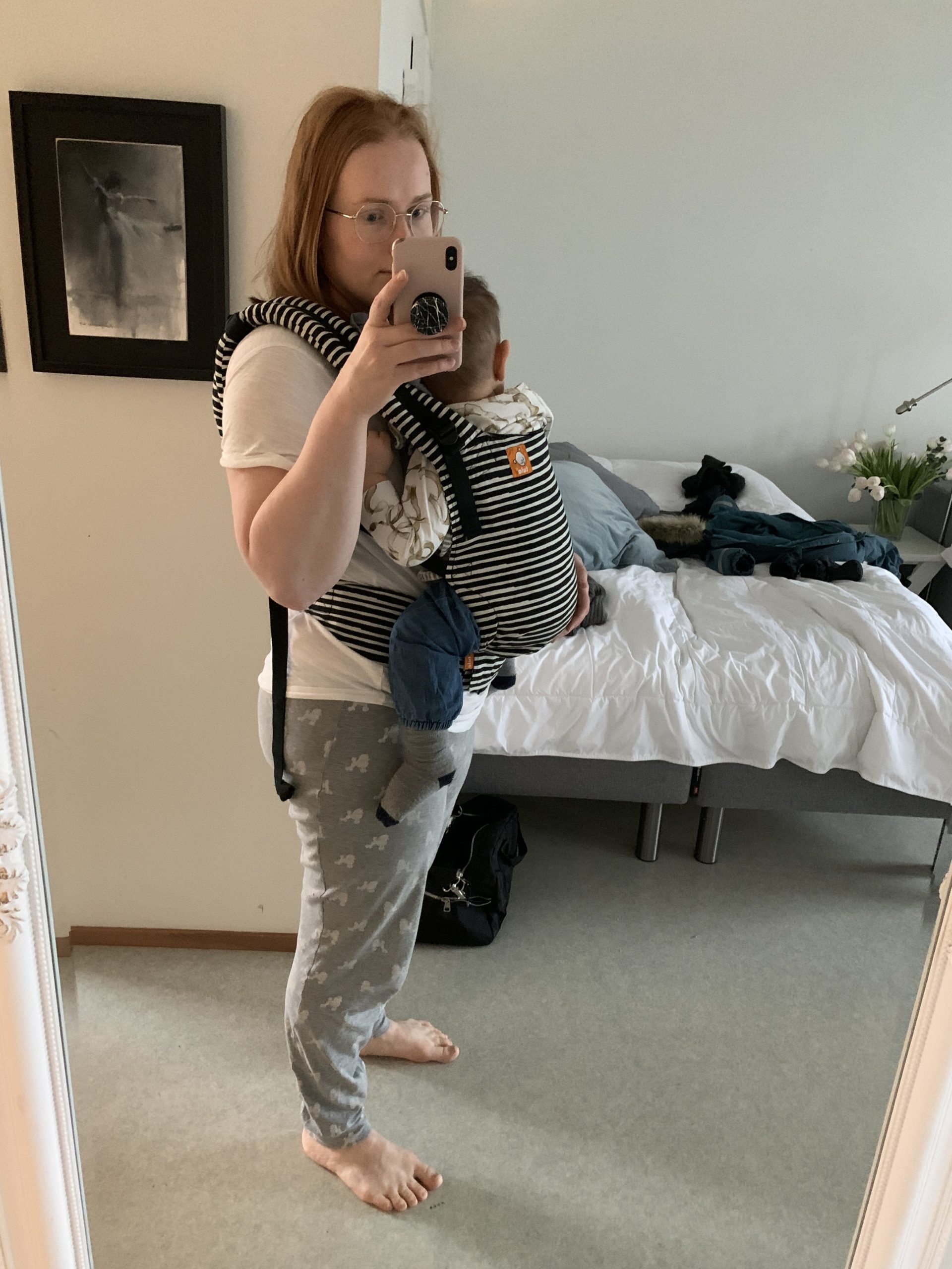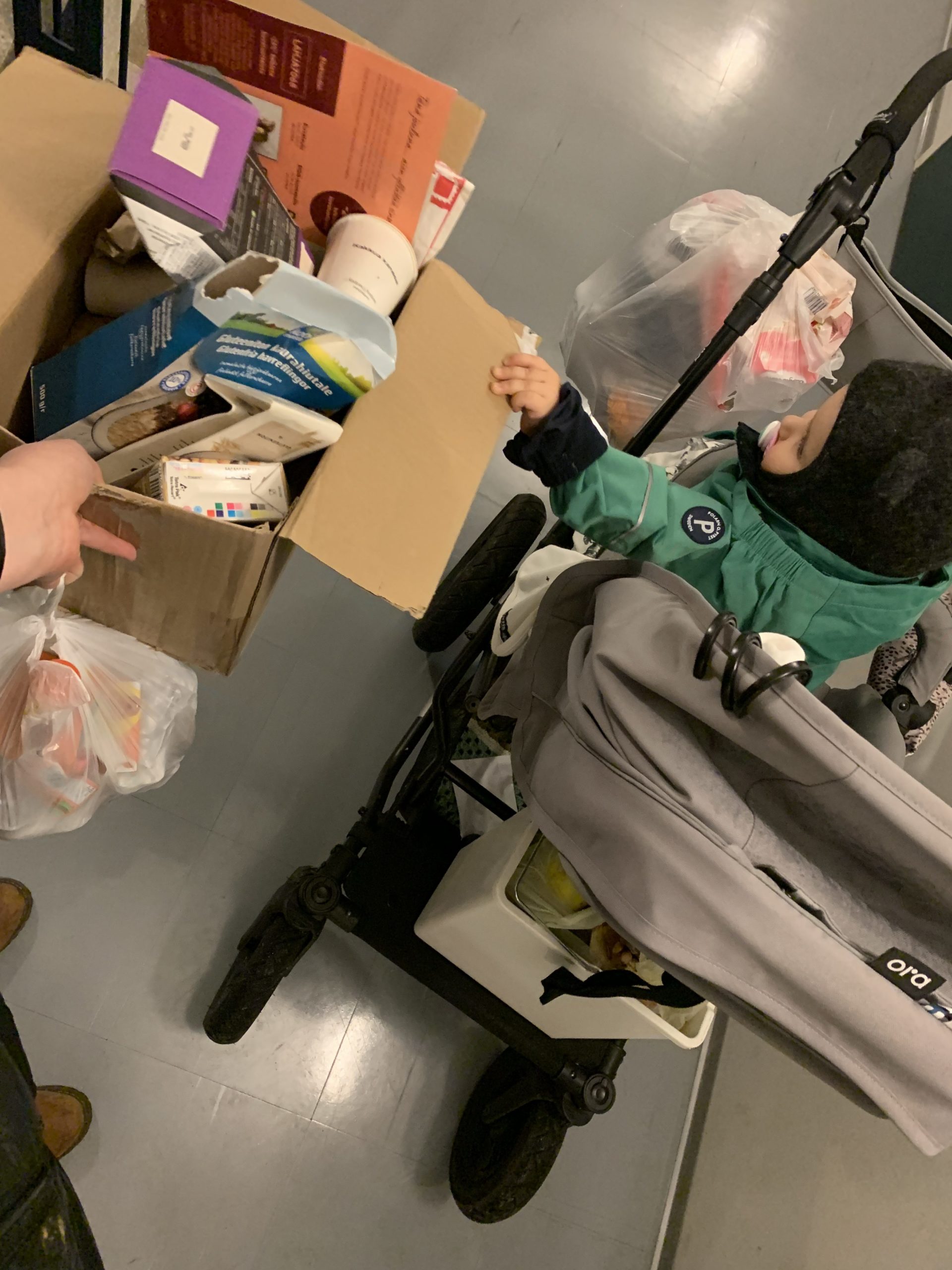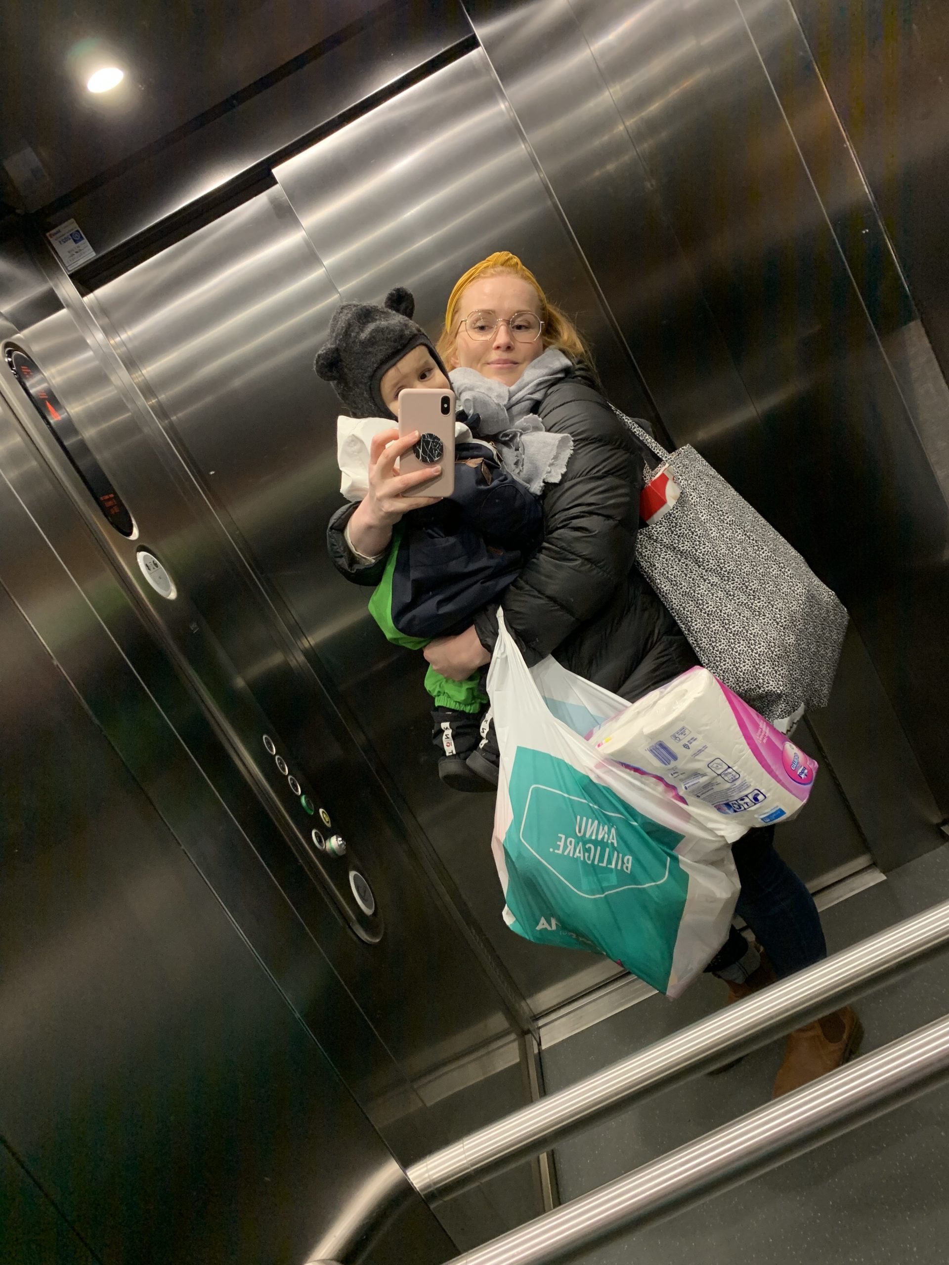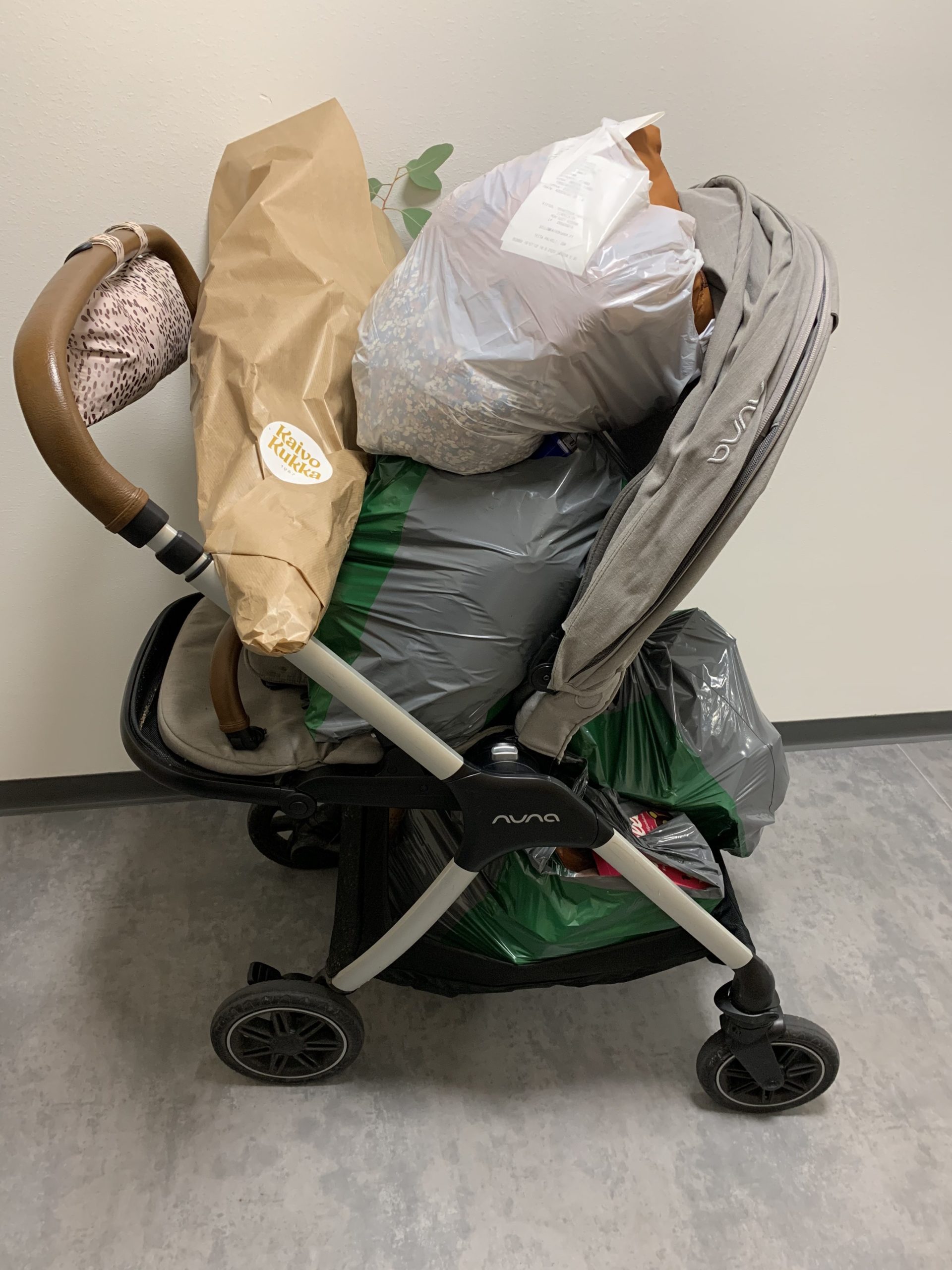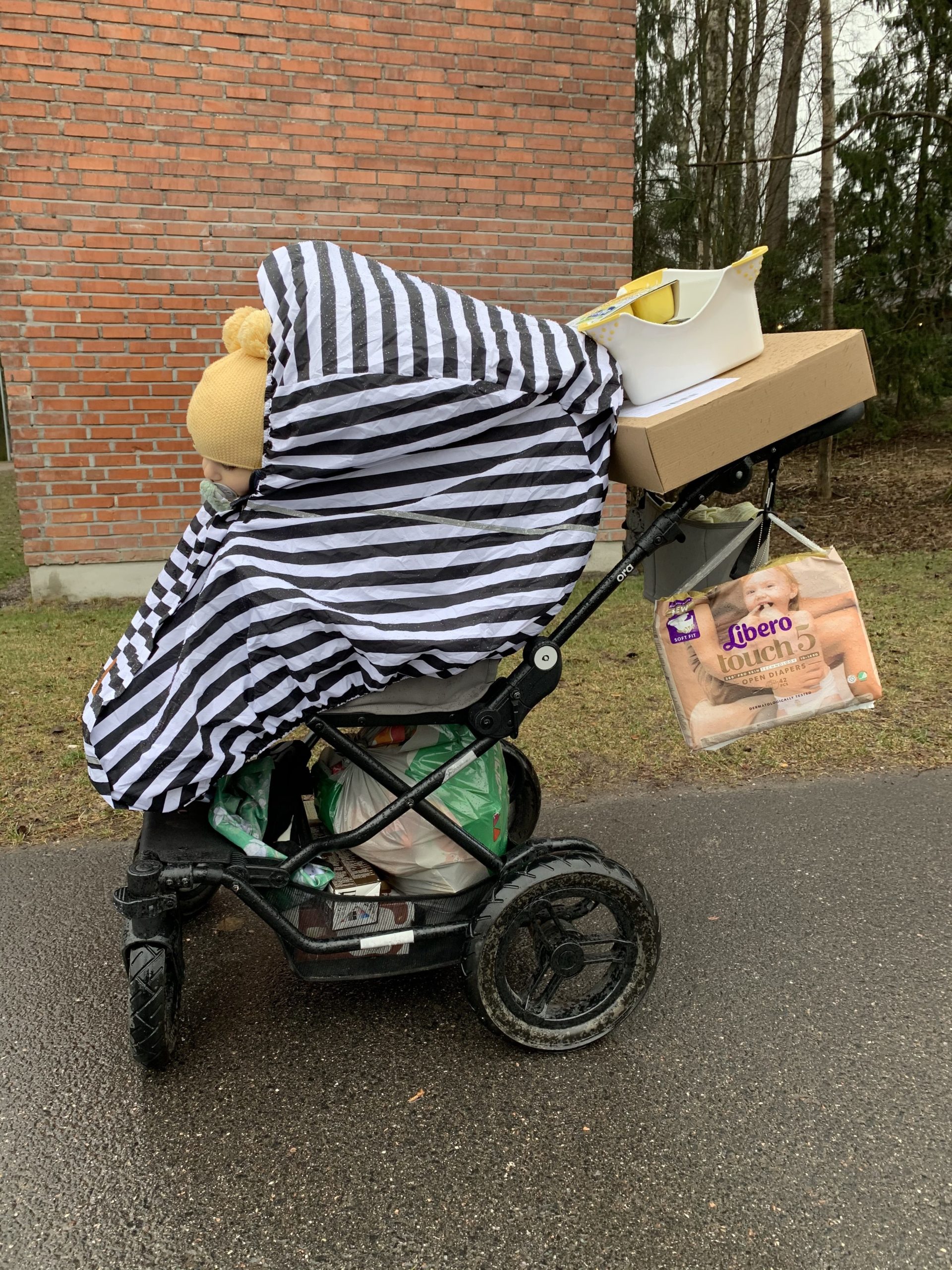 Täytyy sanoa, että olen ylpeä itsestäni, sillä olen taas saanut yhden vuoden lisää äitiyden mittariin. Olen ylpeä, että selvisin tästäkin vuodesta yksinhuoltajana. Olen jaksanut todella paljon ja kun en ole jaksanut, olen silti mennyt eteenpäin. Erityisesti jokainen kauppareissu lapsen kanssa on iso ylpeyden aihe. Kun saan itseni ja tavarat kotiin, huokaisen aina helpotuksesta. Tein sen taas, vitsit olen hyvä! Ensimmäisessä kuvassa kuljetan kirppikselle myyntiin meneviä tavaroita ja muissa kuvissa tulen ruokakaupasta. Vaikka tilasin ruokia pääosin valmiiksi kerättynä, piti ne hakea. Toisinaan tilasin ruoat kotiin asti, mutta väistämättä kaupassa oli välillä asioitava. Usein sitä kantoi tavaroita hiestä märkänä, maski naamalla, silmälasit huurussa ja taapero sylissä.
