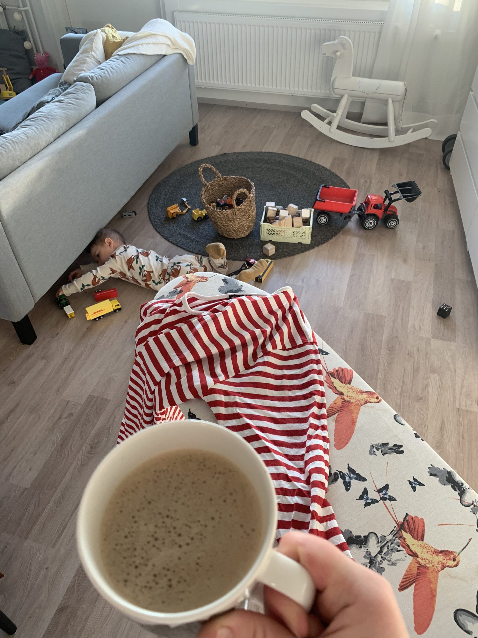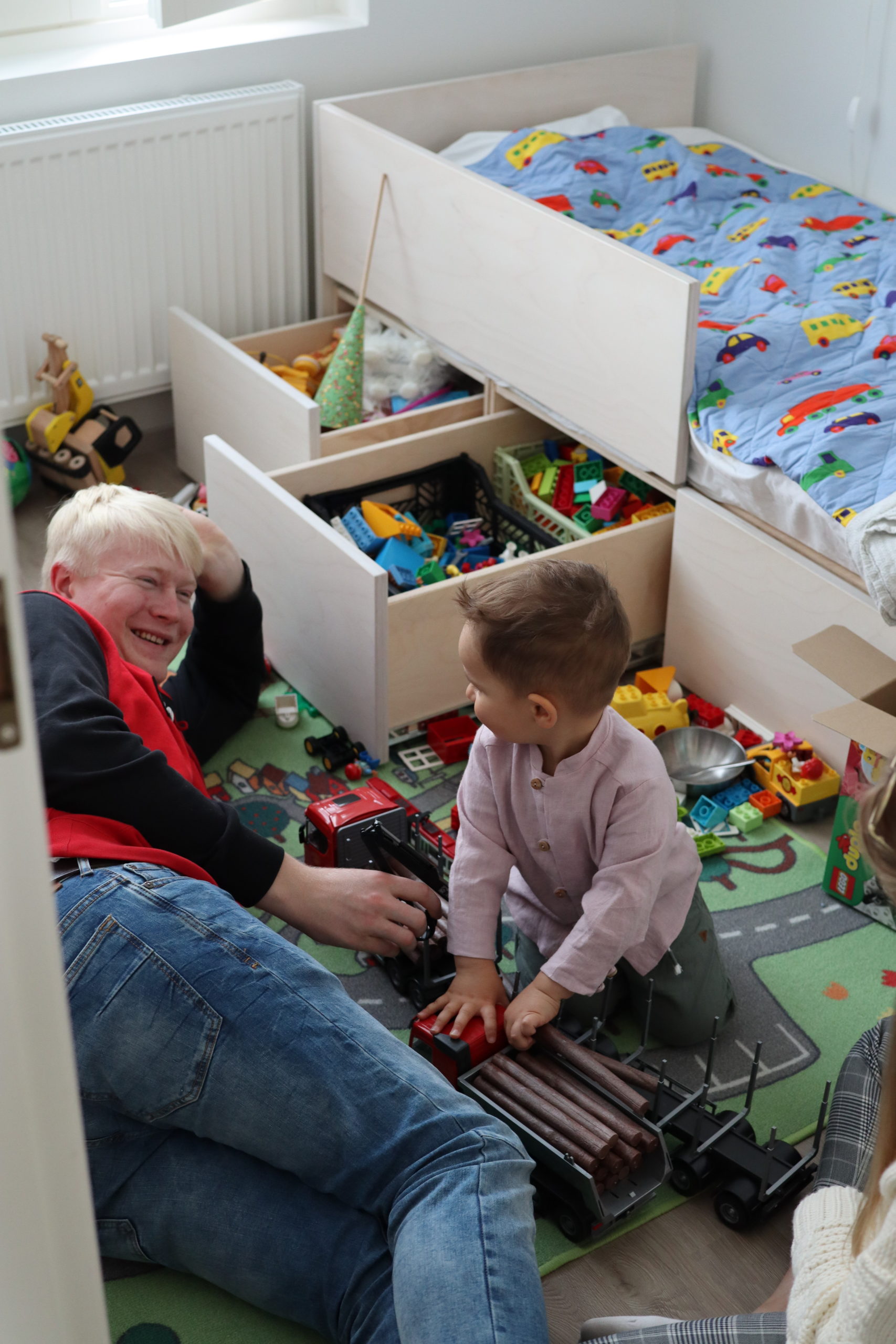 Tämä kuva on Eemin syntymäpäiviltä. Hän sai veljeltäni, kummisedältä, lahjaksi tukkirekan. Sitä sitten yhdessä ihasteltiin. Tästä kuvasta tulee niin hyvä mieli. Miten tärkeitä nämä kaksi ovat toisilleen. Ja miten Eemi ihailee veljeäni. Ja miten veljeni näyttää aivan meidän isältä, kun hän nauraa.