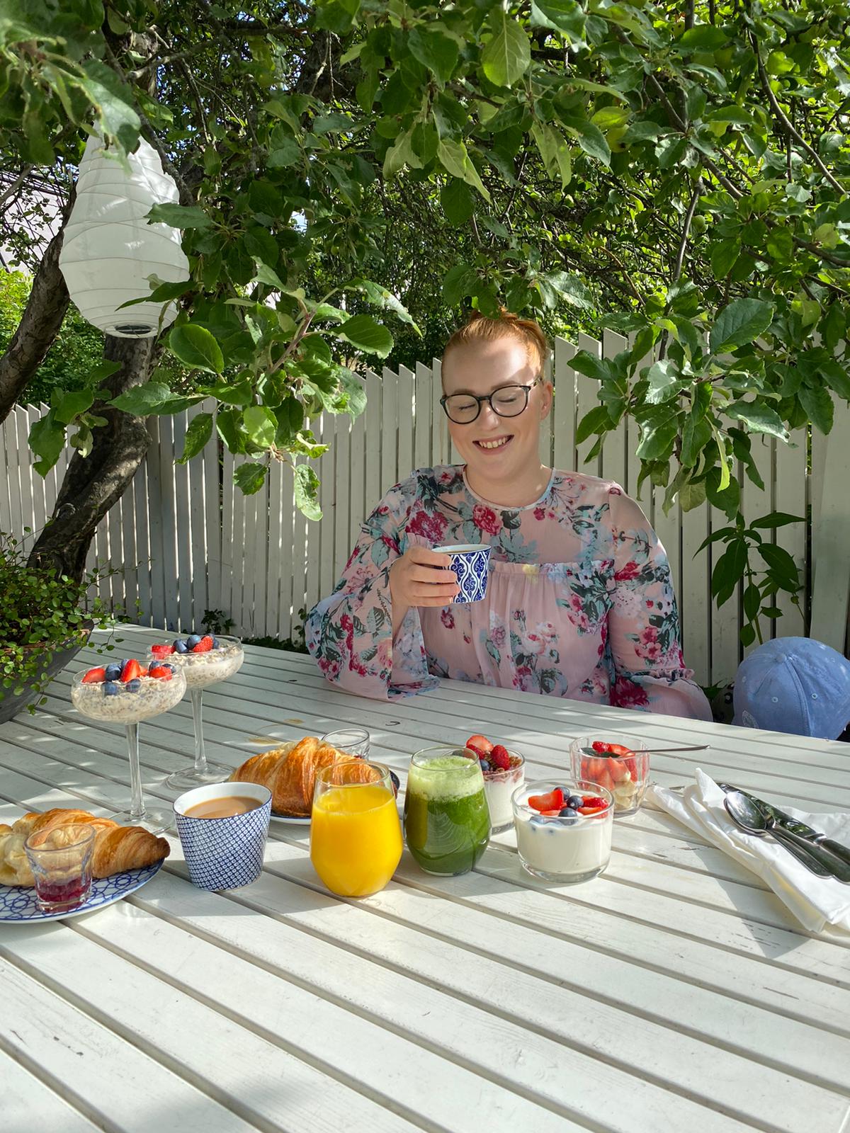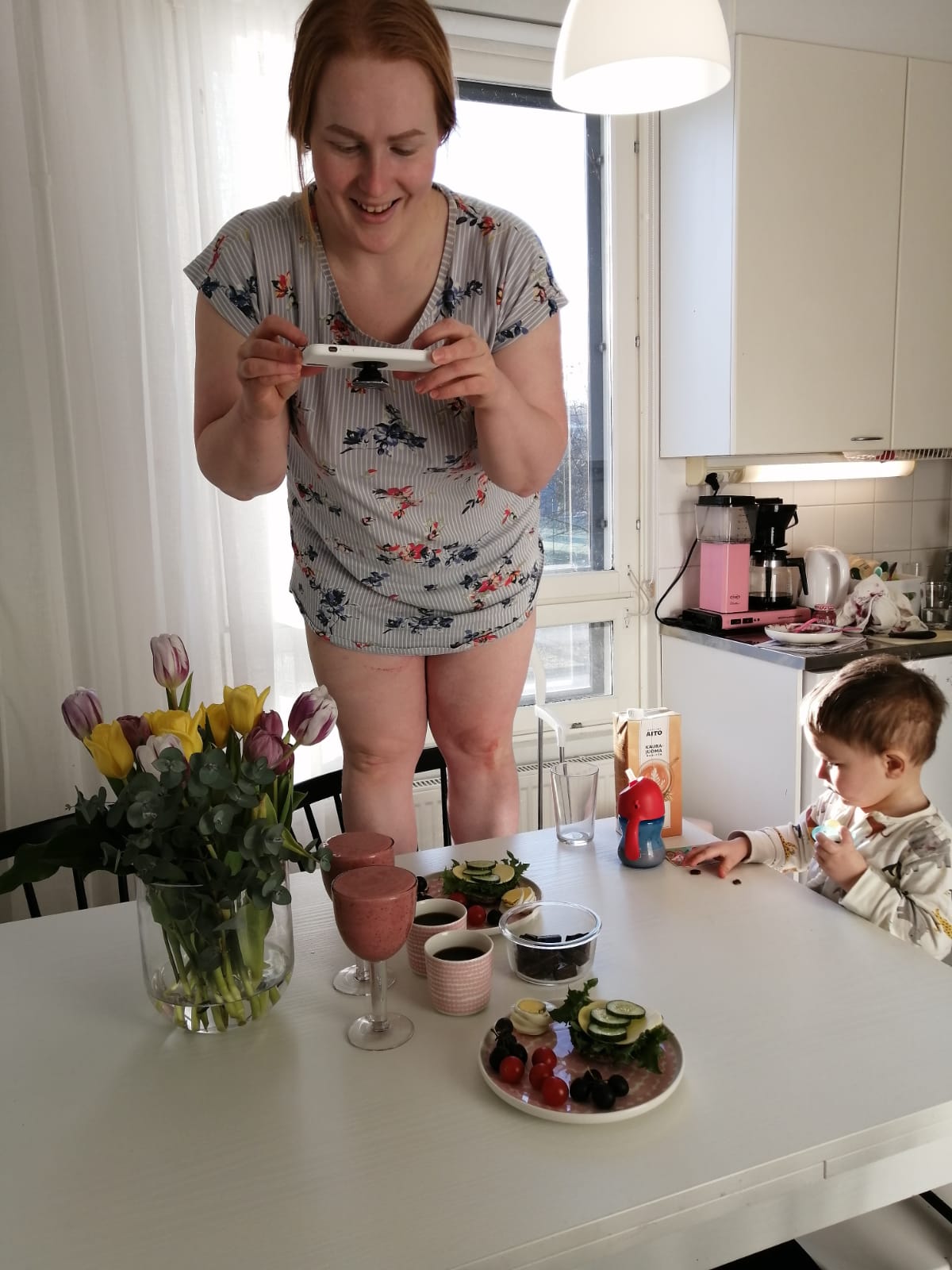 Tälläisiä kuvia on aika vähän, sillä harvoin olen itse ottamassa itsestäni kuvaa, kun teen jotain arkista. Mutta tämän kuvan on ottanut ystäväni, joka oli meillä yökylässä. Tässä olen tehnyt meille juuri aamupalan ja ottamassa siitä kuvaa. Tottakai tämä aamupala piti Instagramiin ikuistaa, vaikka tulikin pyllistettyä ikkunan suuntaan!