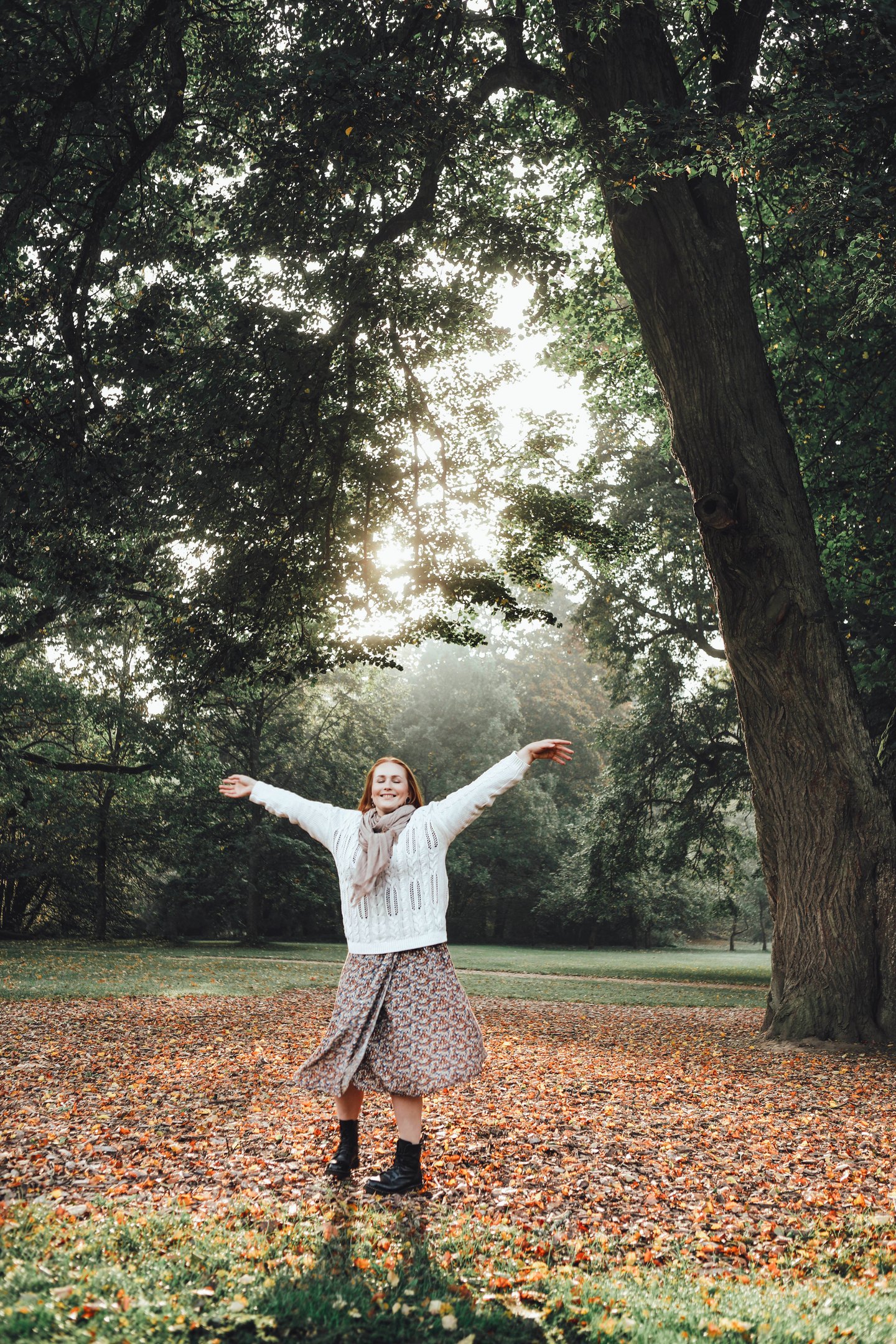 Tämä! Tässä kuvassa näytän niin onnelliselta. Paistattelen syysauringossa ja auringon säde osuu kaulaani. Näyttäen ihan siltä kuin minulla olisi kaulakoru kaulassa. Oikeasti olen onnellinen, että uskalsin jälleen leikkauttaa hiukseni lyhyemmiksi. Se tuntui tänä syksynä aivan erityisen hyvältä!