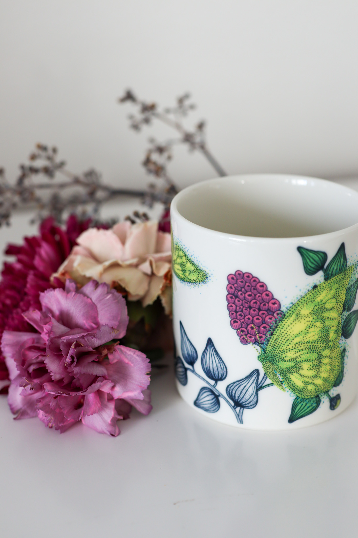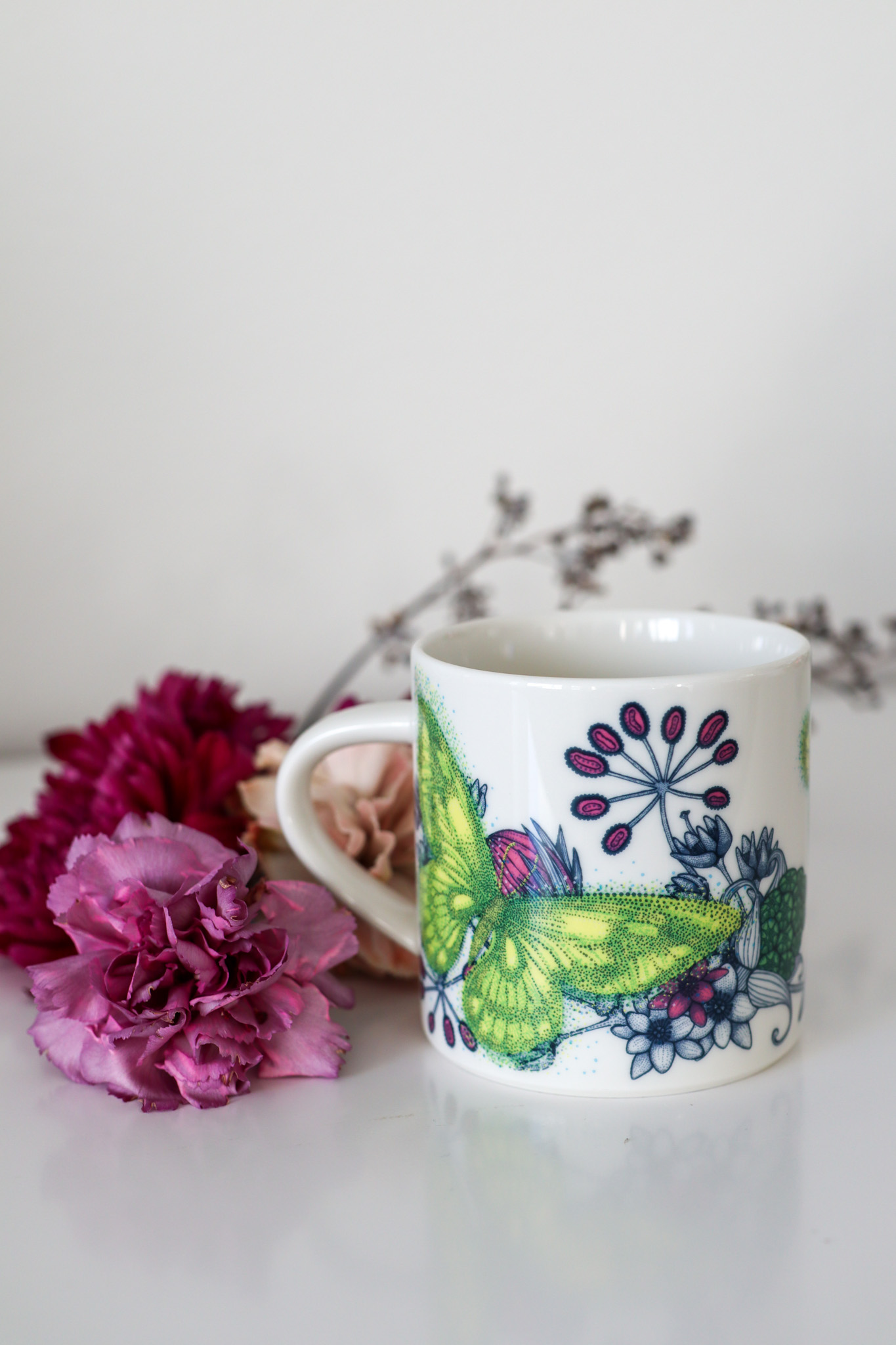 Tämä on Arabian Runo-sarjan Neitoperho-muki, jota on valmistettu 2009-2014. Minulla on vain tämä yksi kappale ja se on yksi suosikeistani, koska siihen mahtuu 3,5 dl kahvia, eli se on vähän isompi muki! Lisäksi se ilahduttaa kuvioinnilla ja värimaailmalla aamujani. Kesällä tämä on aivan ehdoton aamukahvikuppi, mutta sitten taas näin syksyllä se saa kesän mieleen, kun siitä hörii kahvia.