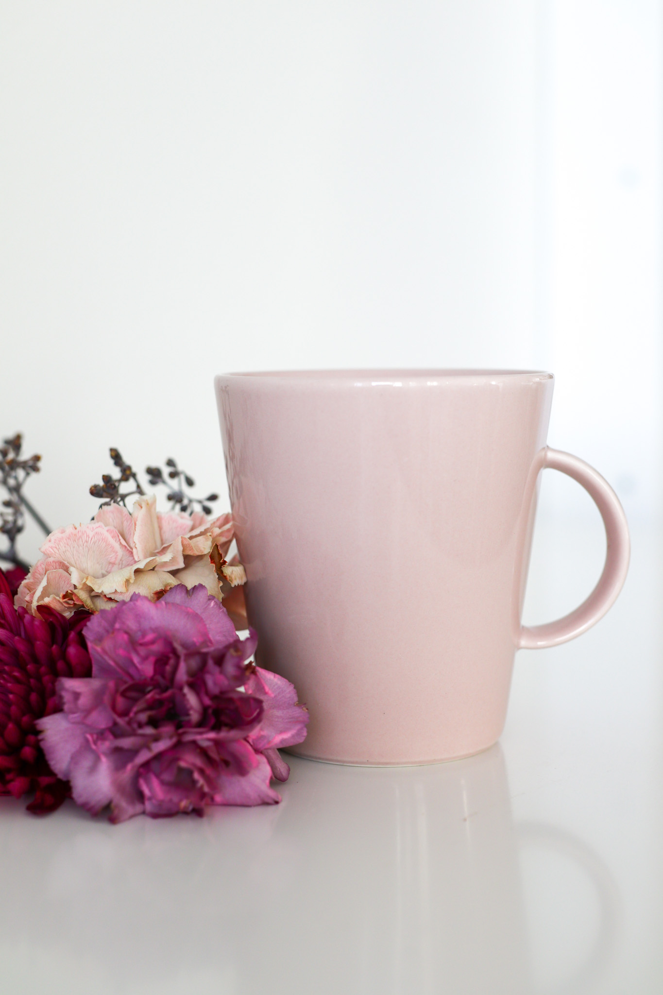 Tämä on ehdottomasti eniten käyttämäni muki. Hempeän vaaleanpunainen Arabian Koko muki, johon mahtuu 0,5 l nestettä! Tästä tulee päivän aikana juotua niin vettä kuin kahviakin. Rakastan isoja mukeja ja juon usein kerralla isosti kahvia.