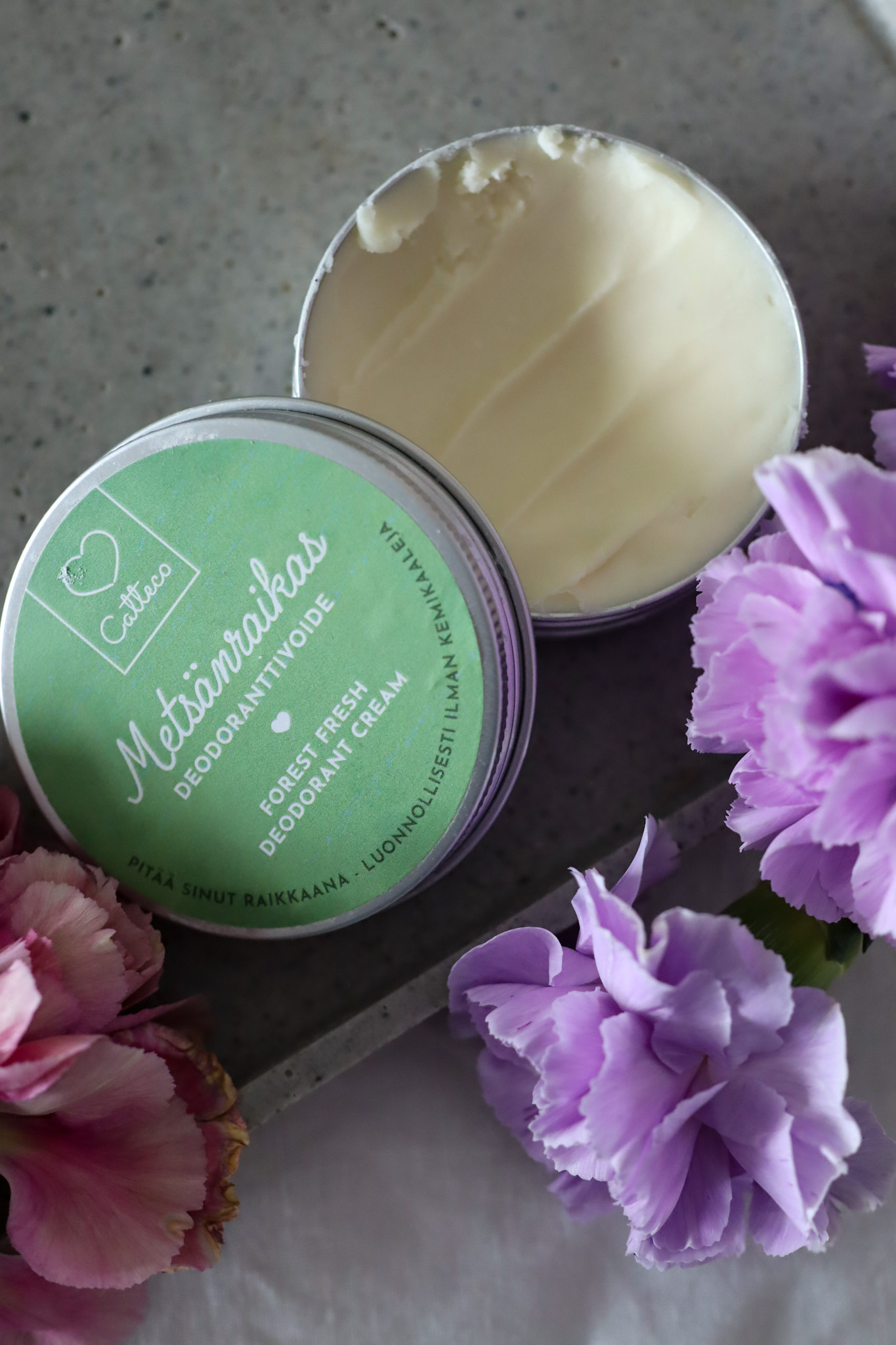 Catteco on kotimainen valmistaja ja heidän deodoranttivoiteet ovat 100% luonnollisia ja 90% ainesosista on luomulaatuisia. Tuoksujakin on 5 erilaista! Ostin tätä ensin ystävälleni lahjaksi. Hän on hehkuttanut tuotetta siitä lähtien. Se on riittoisa ja ensimmäinen luonnollinen deodorantti, joka pitää hänet raikkaana. Niinpä ostin tämän itsellenikin. Minä kuitenkin sain tuotteesta todennäköisesti allergisen reaktion. Kainaloni olivat todella punaiset aina tuotetta käyttäessä, jonka takia oletan, että jokin ainesosa oli liian voimakas herkälle iholleni. Luonnonkosmetiikka on luonnonmukaista alkuperää olevista raaka-aineista valmistettua kosmetiikkaa ja herkän ihon allergiareaktiot ovat mahdollisia.