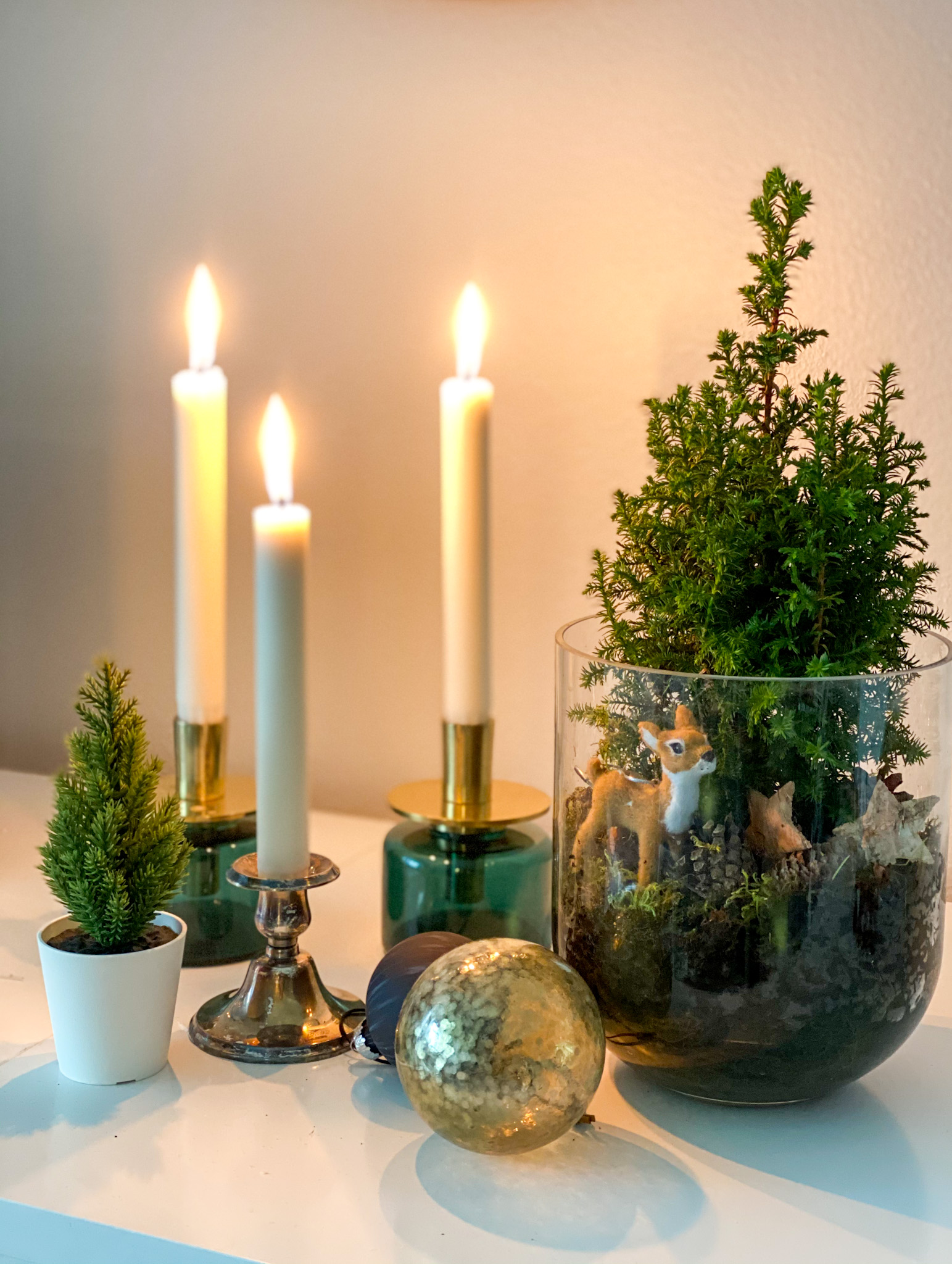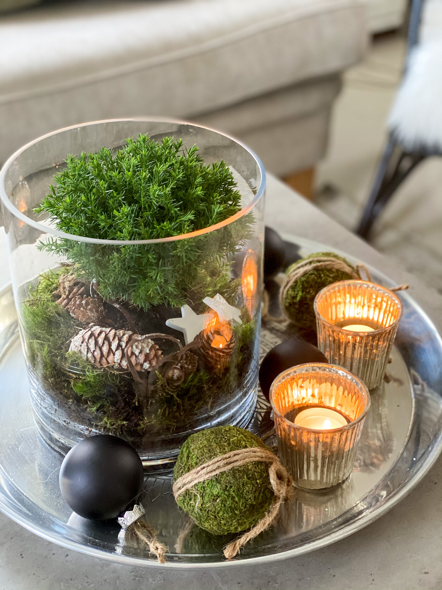 - laita haluamiasi koristeita asetelmaan ja sen ympärille esim. käpyjä sypressin juureen ja jouluista nauhaa maljakon ympärille, jonka sidot kauniiksi rusetiksi, myös paristokäyttöinen valosarja voi tuoda asetelmaan tunnelmaa