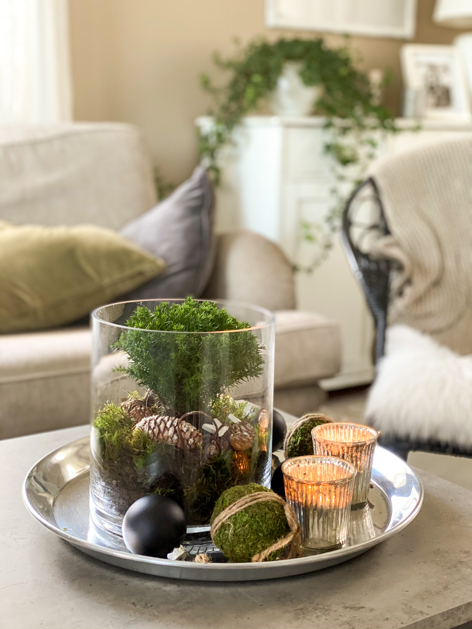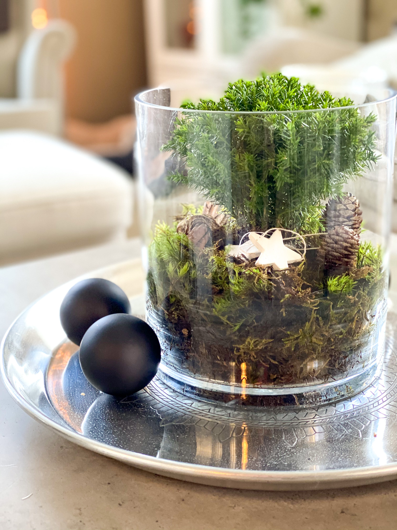 - laita haluamiasi koristeita asetelmaan ja sen ympärille esim. käpyjä sypressin juureen ja jouluista nauhaa maljakon ympärille, jonka sidot kauniiksi rusetiksi, myös paristokäyttöinen valosarja voi tuoda asetelmaan tunnelmaa