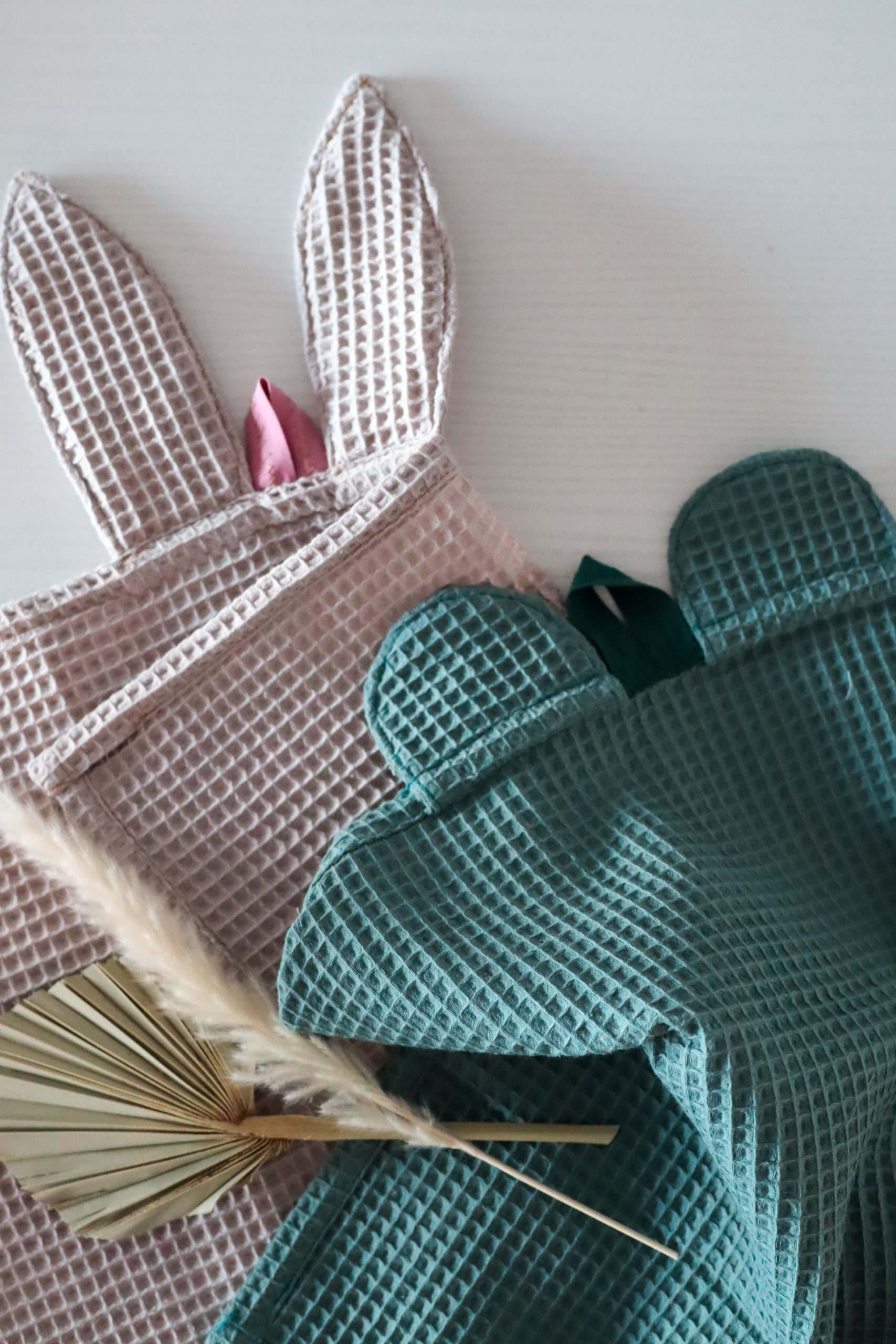 2. Leikkaa vohvelikankaasta eläimenkorvat, esim. pupun tai karhun. Itse piirsin kaavan voi paperiin ja katsoin, että se oli sopivan kokoinen pyyhkeen kokooon nähden. Leikkasisin kaavan avulla vohvelikankaasta 4 korvaa, joissa kaikissa on noin 1cm saumavara.