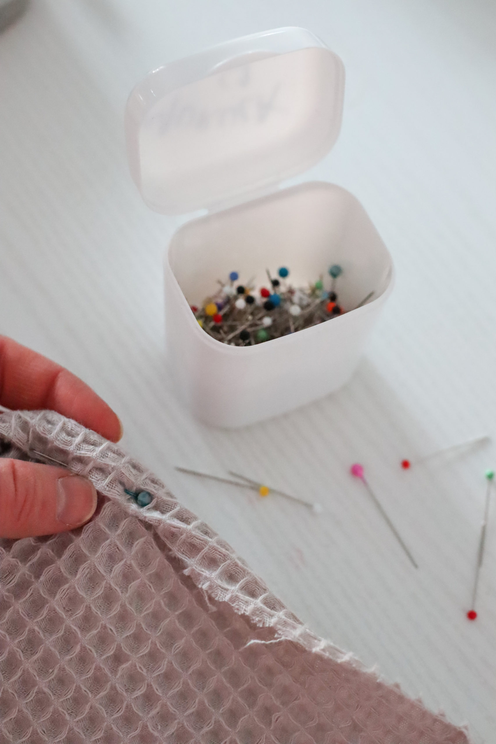 4. Taita pyyhekankaan reunat kaksin kerroin kuten ylläolevassa kuvassa. Käytä apuna nuppineuloja. Itse tein niin, että ompelin sivun kerrallaan suoralla ompeleella, jonka jälkeen käänsin ja nuppineulasin seuraavan sivun, mutta hyvin voi heti alkuun käydä läpi kaikki sivut ja sitten vain ommella hurauttaa ne kerralla läpi, kuhan huomioit vaiheen 5 ennen sitä.