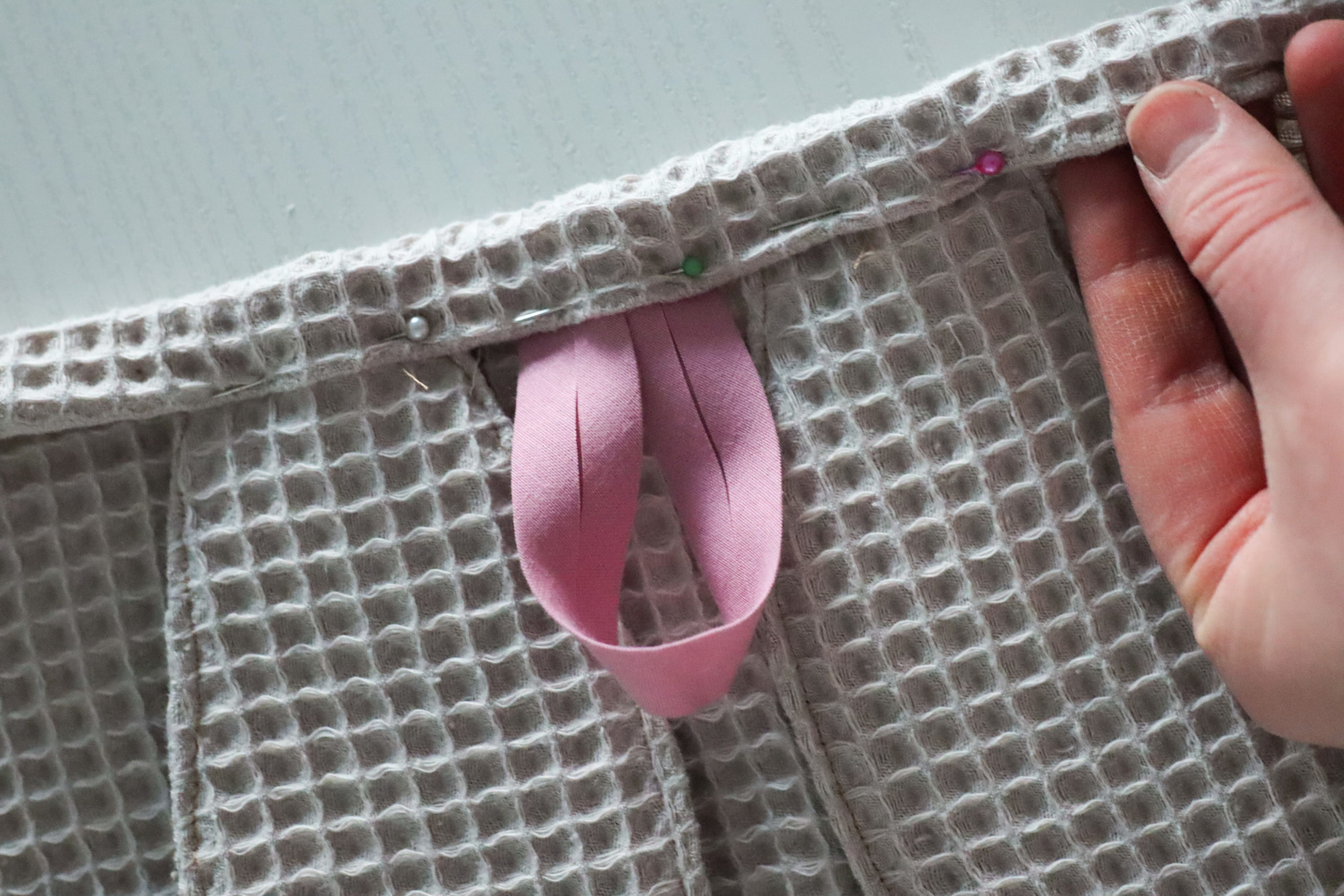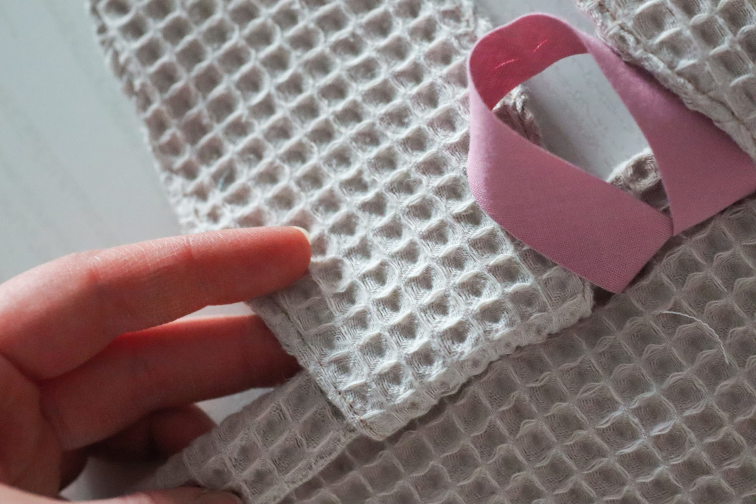 5. Asettele korvat jommallekummalle pyyhkeen pitkälle sivulle alla olevan kuvan mukaisesti. Laita pyyhelenkki keskelle ja korvat sen molemmille puolille. Eli laita lenkki ja korvat taitellun sauman alle nuppineuloin. Korvat kiinnittyvät pyyhkeeseen samalla kun sauma ommellaan suoralla ompeleella.