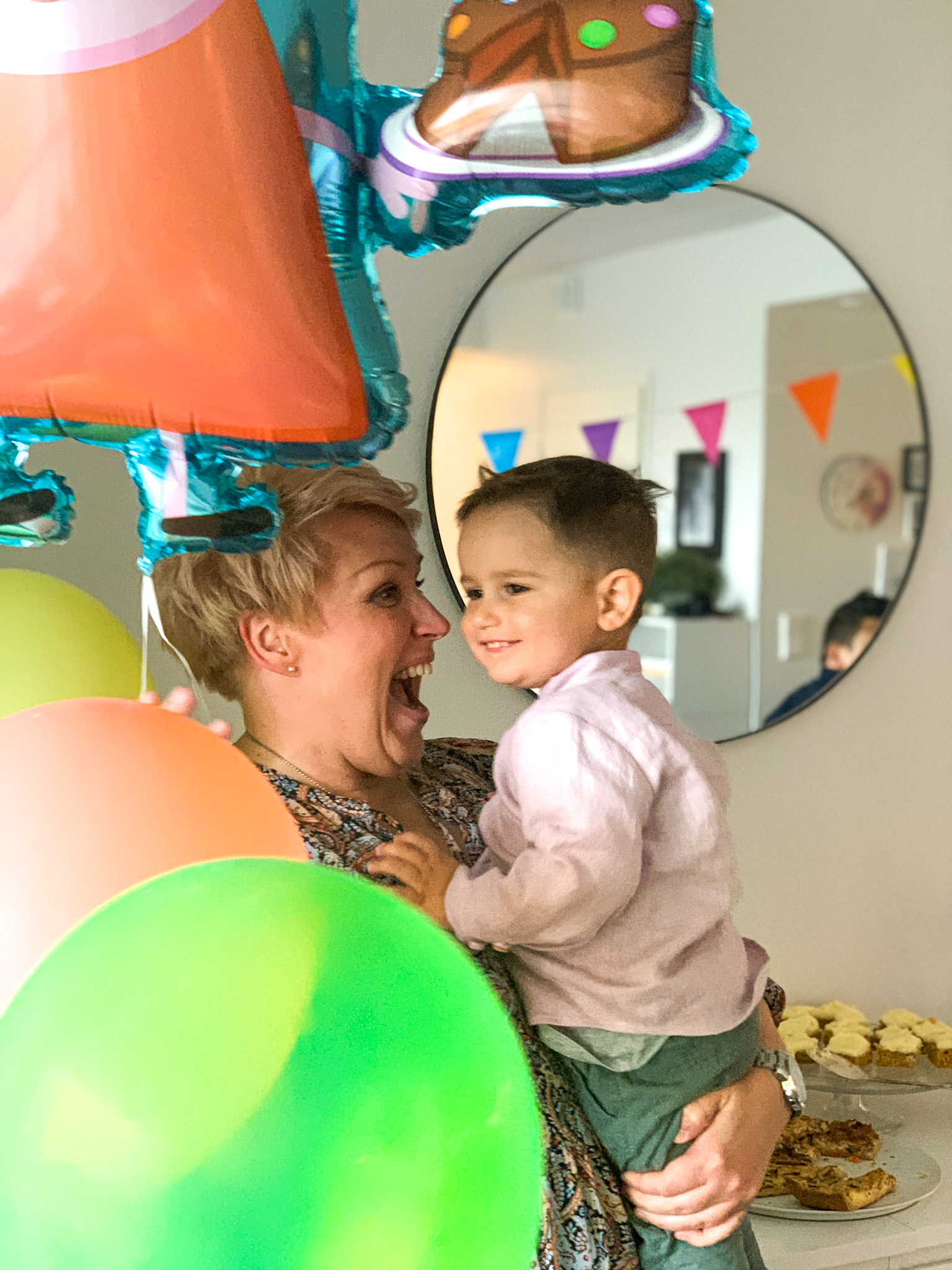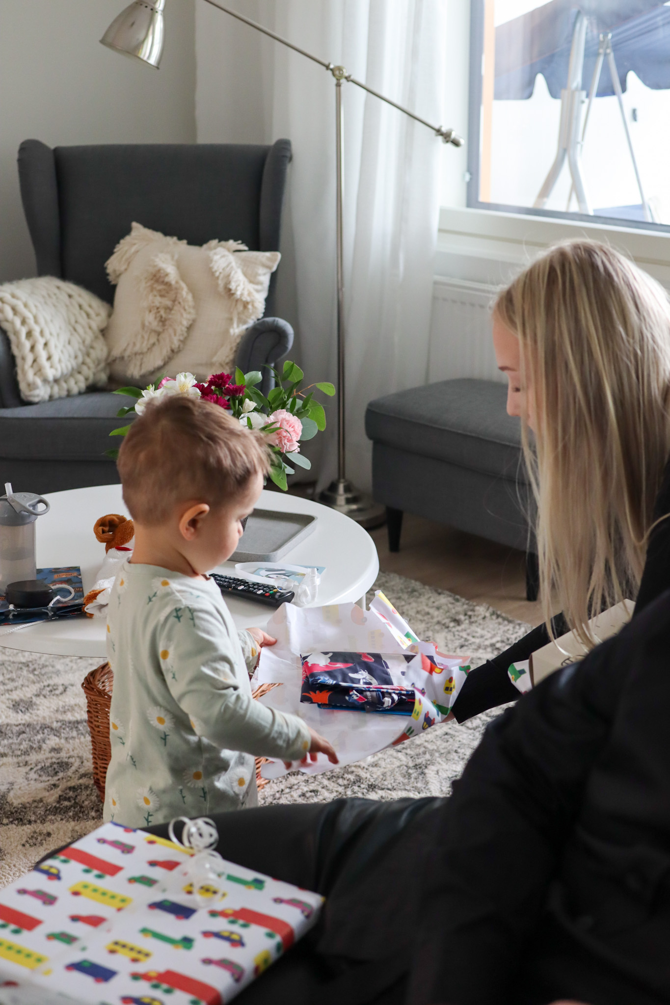 Eemi nautti suuresti läheisistä ja hän oli onnellinen ilmapalloistaan. Hän esitteli hienoja palloja kaikille. Olimme käyneet yhdessä ne ostamassa ja Eemi oli saanut itse valita pallot. Niiden mukaan valittiin sitten servetit ja kynttilä kakkuun. Eemi sai myös ihania lahjoja. Paras oli ehdottomasti minun pikkuveljeni, eli Eemin kummisedän tuoma tukkirekka. Se kyllä sai lapseni säihkymään ja sillä on siitä asti leikitty heti aamusta asti ja viimeisenä illalla. Muut lahjat eivät häntä sen jälkeen kiinnostaneetkaan!