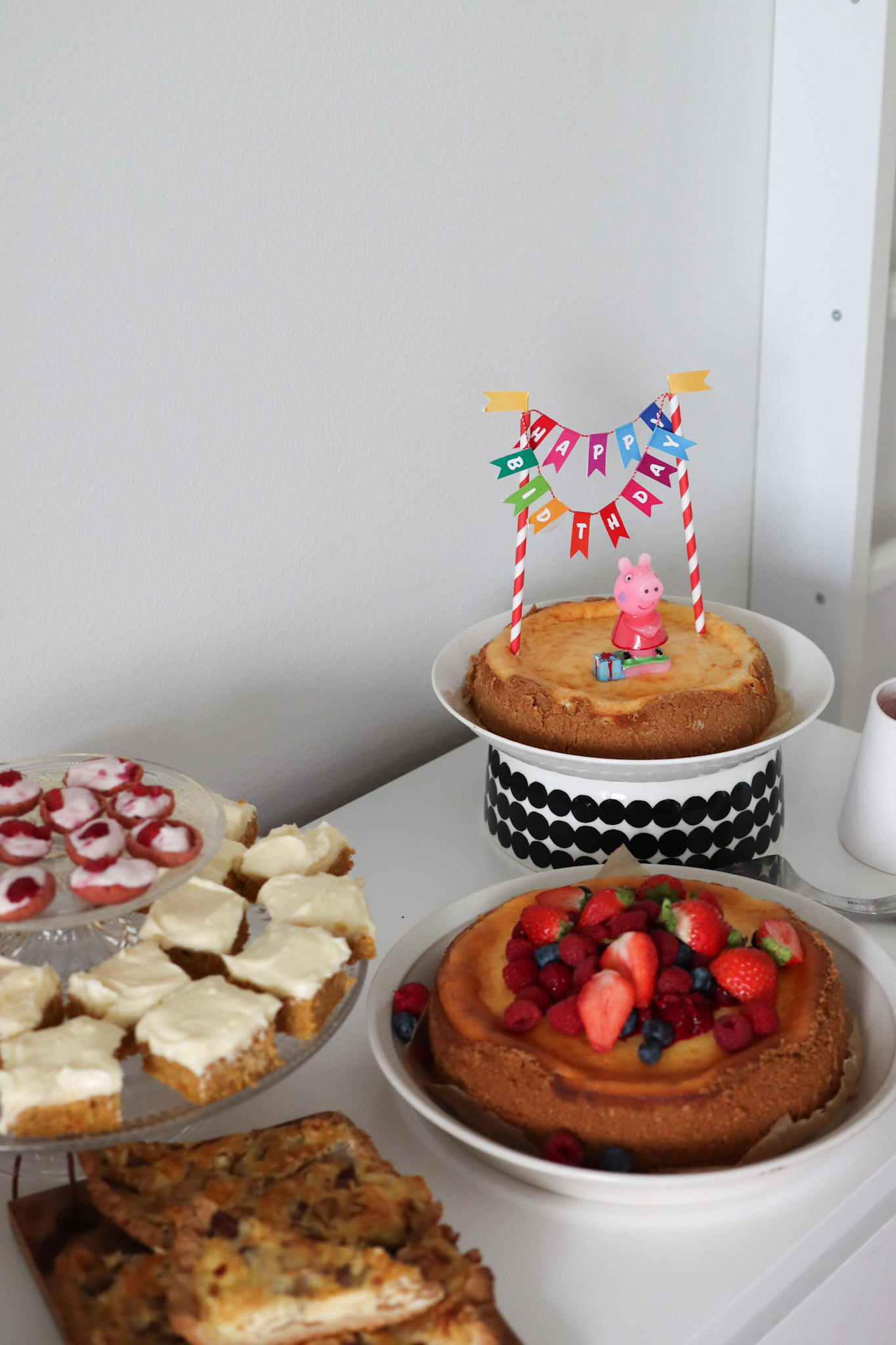 Juhlissa tarjosin itse tekemääni suolaista piirakkaa, croissantteja, cocktailpiirakoita munavoilla, itse tekemääni porkkanakakkua ja itse tekemääni juustokakkua. Lisäksi tarjolla oli kahvia, teetä ja mehua. Maanantain vieraille tein pannukakkua höysteineen. Itse tehdyt tarjottavat olivat gluteenittomia ja osa maidottomia. Se toki nosti myös kustannuksia, mutta koin helpommaksi tehdä kaikille samoja. Kaikki tykkäsivät todella paljon tarjottavista ja erityisesti kakut olivat aivan älyttömän hyviä! Ihan yllätin itseni ja kehuin itseäni, sillä olin omasta mielestäni onnistunut niin hyvin. Vaikka lauantai-iltani menikin kahteen asti yöhön leipoessa! Ja kyllä kirosin, että en muuten koskaan järjestä mitään. Kuitenkin se onni ja ilo oman lapsen silmissä oli niin suuri lahja, että tuo ajatus unohtui nopeasti.