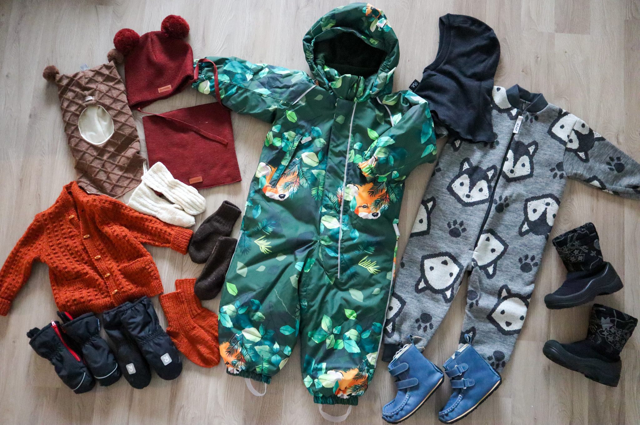 Kuvassa on tosiaan kaikki varusteet muutamia villasukkia ja hanskoja lukuunottamatta. Lisäksi meiltä löytyy erilliset kurahousut, kuratakki ja kumisaappaat. Meinasin, että pärjätään ihan vain yhdellä haalarilla, enkä osta toppatakkiakaan. Meidän käytössä takit ovat olleet melko turhia. Tähän asti olen myös todennut, että ne aina ostamani varahaalarit ovat jääneet käyttämättä. Usein leudommalla ilmalla hätätilanteessa voi pukea kuorihaalarin villapuvun kanssa. Tarvittaessa vielä siihen päälle kurahousut, jos sää sen vaatii. Itse suosin kerrospukeutumista, jolloin ulkovaatteita voi olla vähän ja niitä yhdistelemällä saa sopivia kokonaisuuksia.