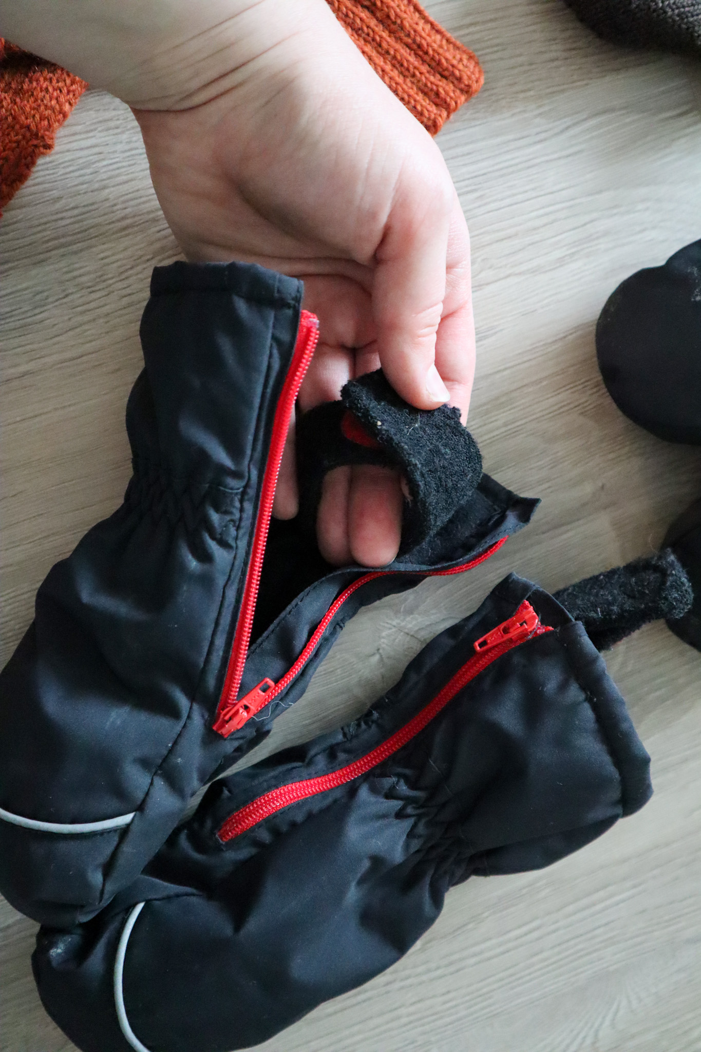 Vetoketju hanskassa on ehdoton ominaisuus, se helpottaa niin paljon pienen käden asettelua hanskan sisään. Toki vetoketjullinen hanska on lähes poikkeuksetta laitettava haalarin alle, sillä päälle ne ei usein mahdu. Kaikki Eemin asusteet ovat villaa tai merinovillaa, paitsi toppahanskat. Minua kiinnostaisi ostaa hänelle talveksi nahkarukkaset vielä näiden olemassaolevien hankojen lisäksi. Ja mahdollisesti siirtyä kokonaan käyttämään nahkarukkasia jatkossakin.