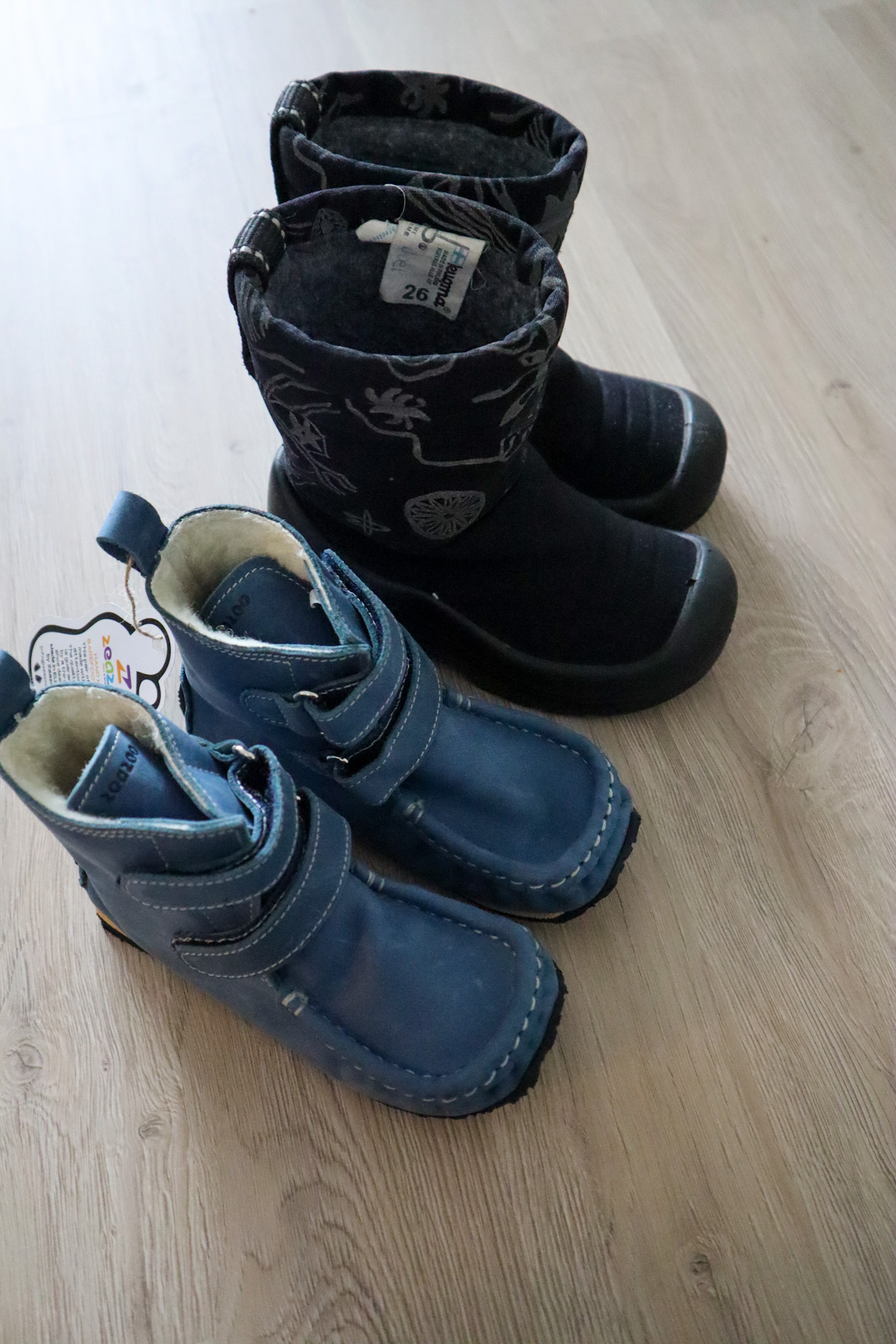 Toiset talvikengät on tosiaan Zeazoo Yeti kengät, jotka ovat nahkaa ja sisältä villaa. Niissä on tasainen ja ohut pohjaa, joka mahdollistaa jalalle mahdollisimman luonnollisen liikkuvuuden. Kengät taipuvat ja niissä on tilaa varpaille. Kyseessä on toiset paljasjalkakengät Eemillä ja olen vasta aiheeseen perehtynyt, eli ihan aloittelijana suositusten mukaisissa kengissä.
