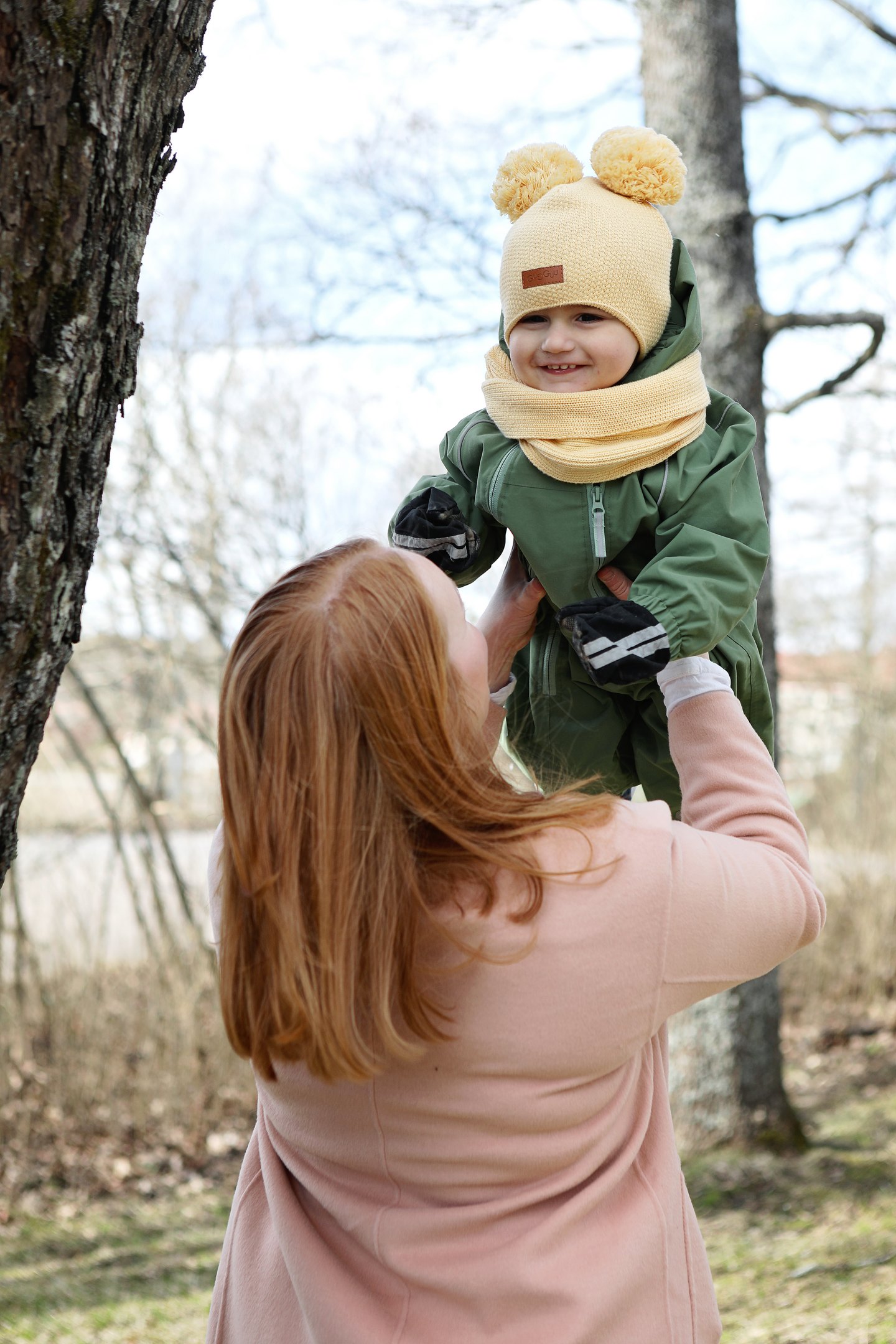 Asusteita onkin sitten monenlaisia! Miten pipoja aina kertyykin niin paljon ja sitten lopulta lapsi huolii päähänsä vain sen yhden päivästä toiseen! Asusteet ovat kaikki meillä olemassa olevia, mitään en ole nyt ostanut. Osa uutena kotiutuneita ja osa sitten kirppiksiltä. Meiltä löytyy isomummon tekemiä villalapasia, jotka ovat ihan loistavia sellaisenaan, kurahanskojen alla tai talvella rukkasten alle, jos on oikein kylmä. Samoin villasukkia on paljon, koska isomummo on innokas! Eemiltä löytyy Kivat merinovillalapsia kahdet, ohuet ja paksut.