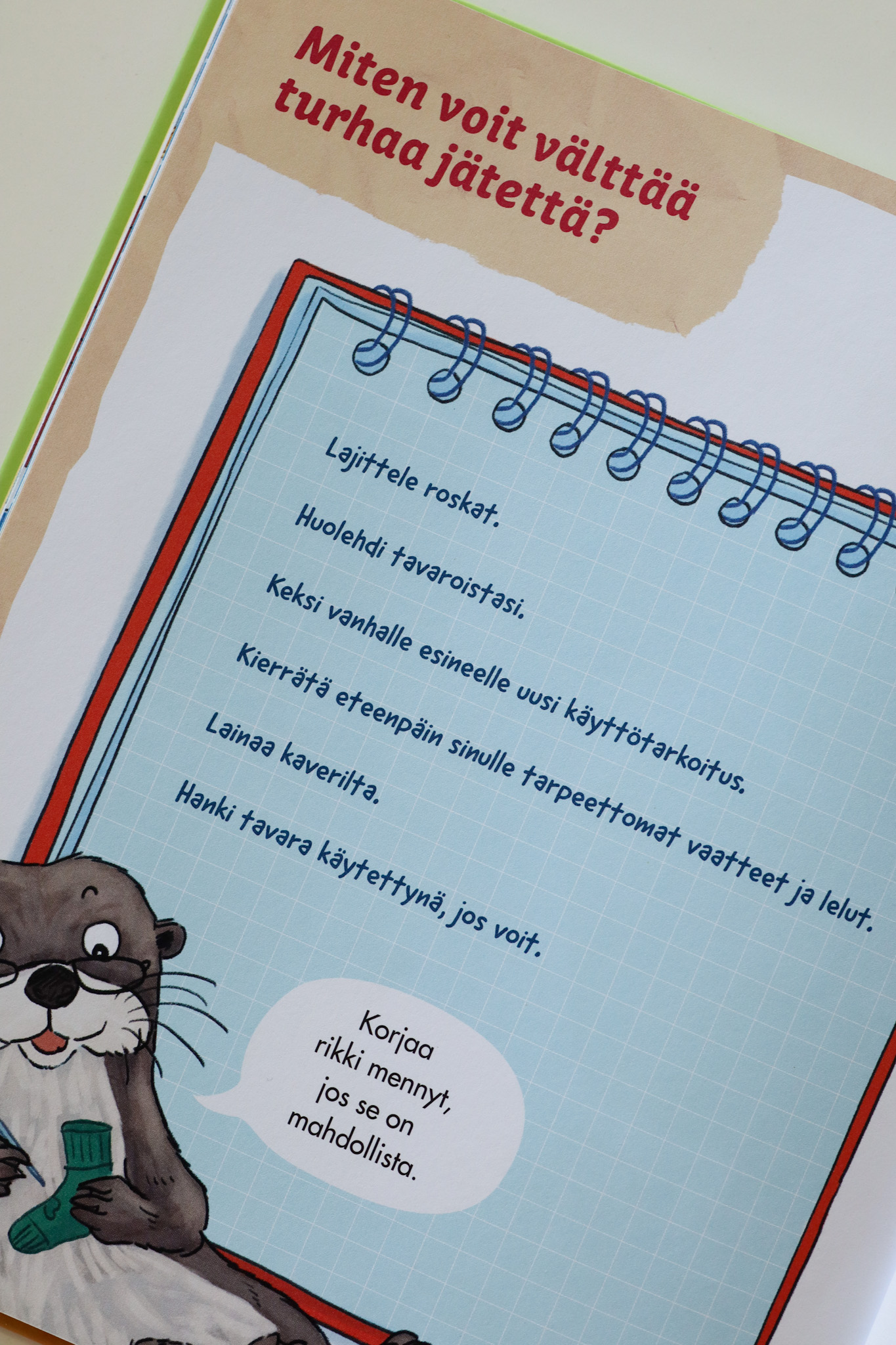 Erityisesti Elsa ja Lauri kierrättävät -kirja on hyvin ajankohtainen ja sen kautta kierrätystä on helppo tehdä näkyväksi lapsella. Kirjassa karsitaan leluja, joka on aika vaikeaa ja viedään ylimääräistä tavaraa kirpputorille myyntiin. Perhe vierailee kierrätyskeskuksessa ja laativat kerrossängylle myynti-ilmoituksen nettiin. Kirjan lopussa pohditaan hyvin kattavasti sitä, miksi meidän tulee kierrättää ja mitä konkreettisia toimia jokainen voi tehdä ilmastonmuutoksen eteen. Uskon, että kirja innostaa lapsia ja sitä kautta meitä aikuisiakin tekemään parempia ratkaisuja ympäristön eteen.