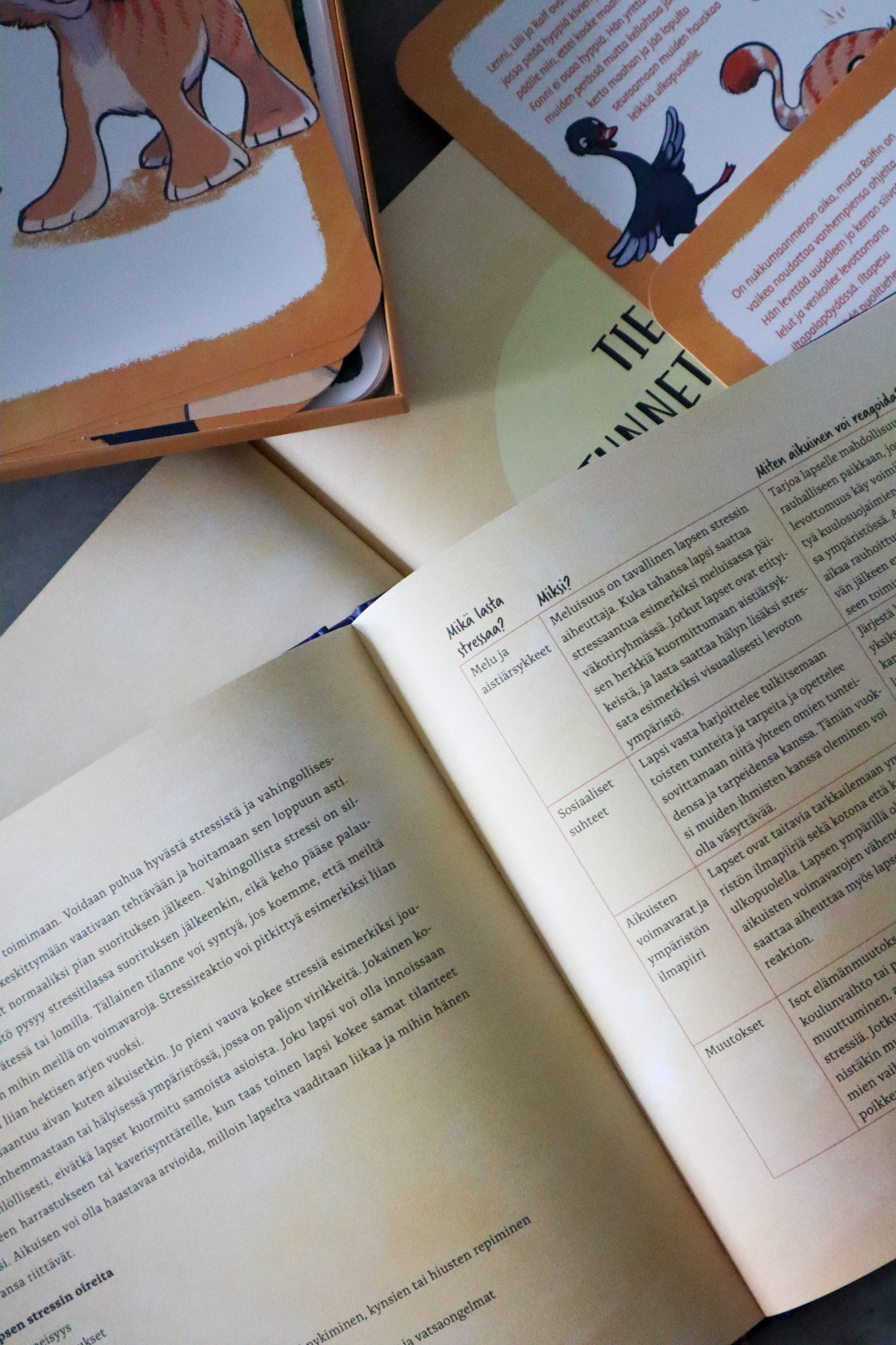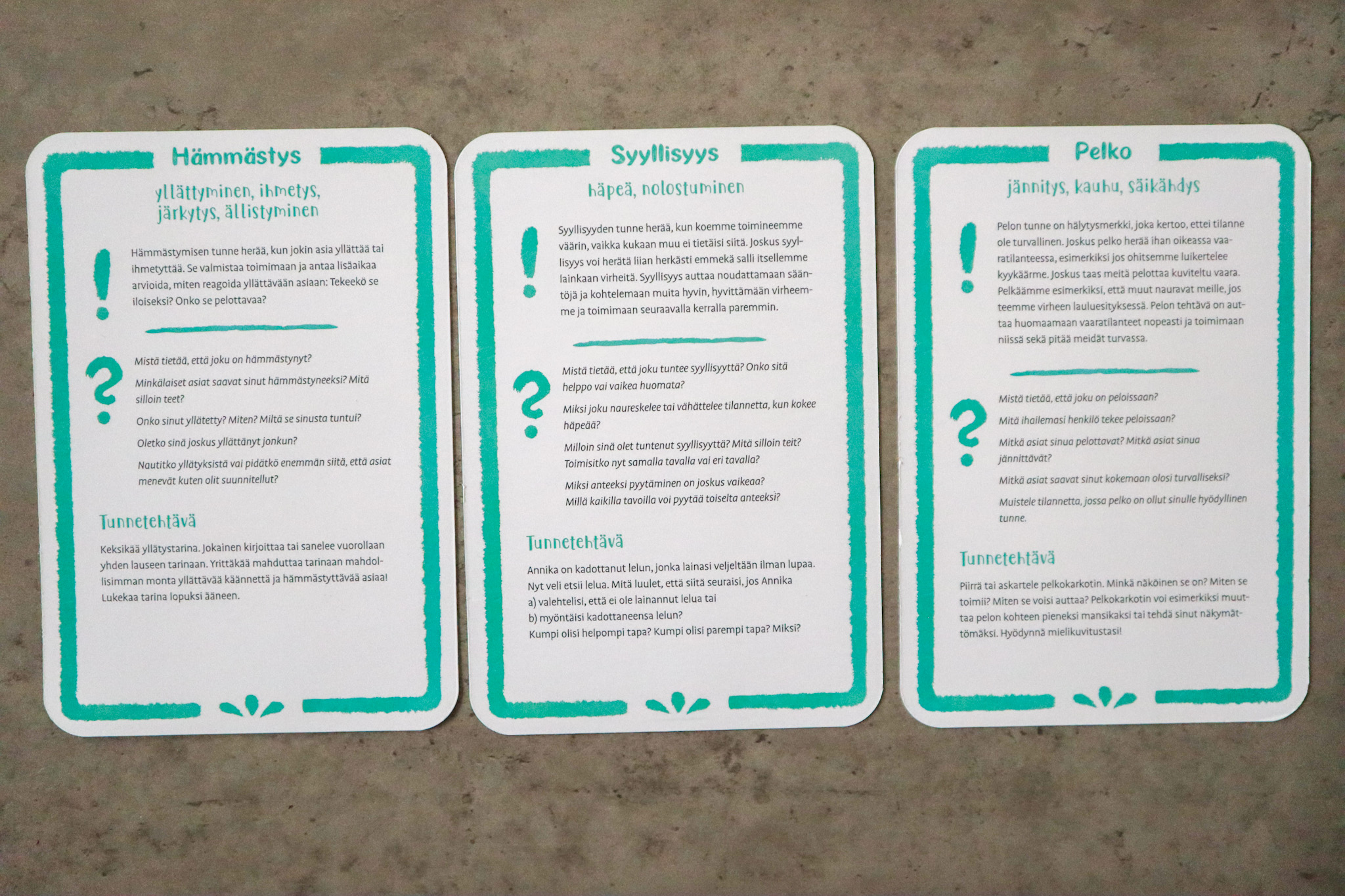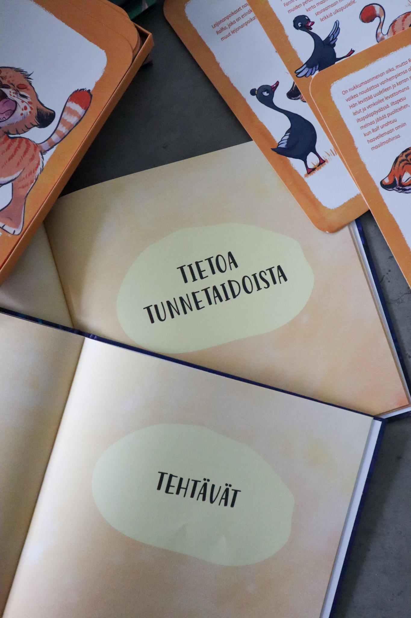 Kirjojen eri osissa käsitellään erilaisia tunteita. Mielestäni jokainen perhe ei tarvitse jokaista näistä kirjoista, vaan kirja kannattaa valita sen mukaan, mitä osa-aluetta oman lapsen kanssa olisi hyvä harjoitella.Kirjan kannessa on aina kerrottu mitä taitoa kyseisessä kirjassa harjoitellaan. Fanni ja suuri tunnemöykky on yleisesti tunnetaitoihin johdattava kirja, josta voi olla hyvä lähteä liikkeelle. Kirjoja on lainattavissa myös kirjastosta. Tunnetaitokortit ovat kiva lisä kirjasarjaan ja niitä voi käyttää jo pienemmänkin lapsen kanssa. Laatikossa on tunnekortteja sekä pulmakortteja, joissa on aina jokin tilanne ratkottavaksi. Korttien takana on aina kysymyksiä ja tehtäviä. Kortit sopivat mielestäni hyvin matkoille tekemiseksi, odottelutilanteisiin tai keskustelun herättäjäksi.