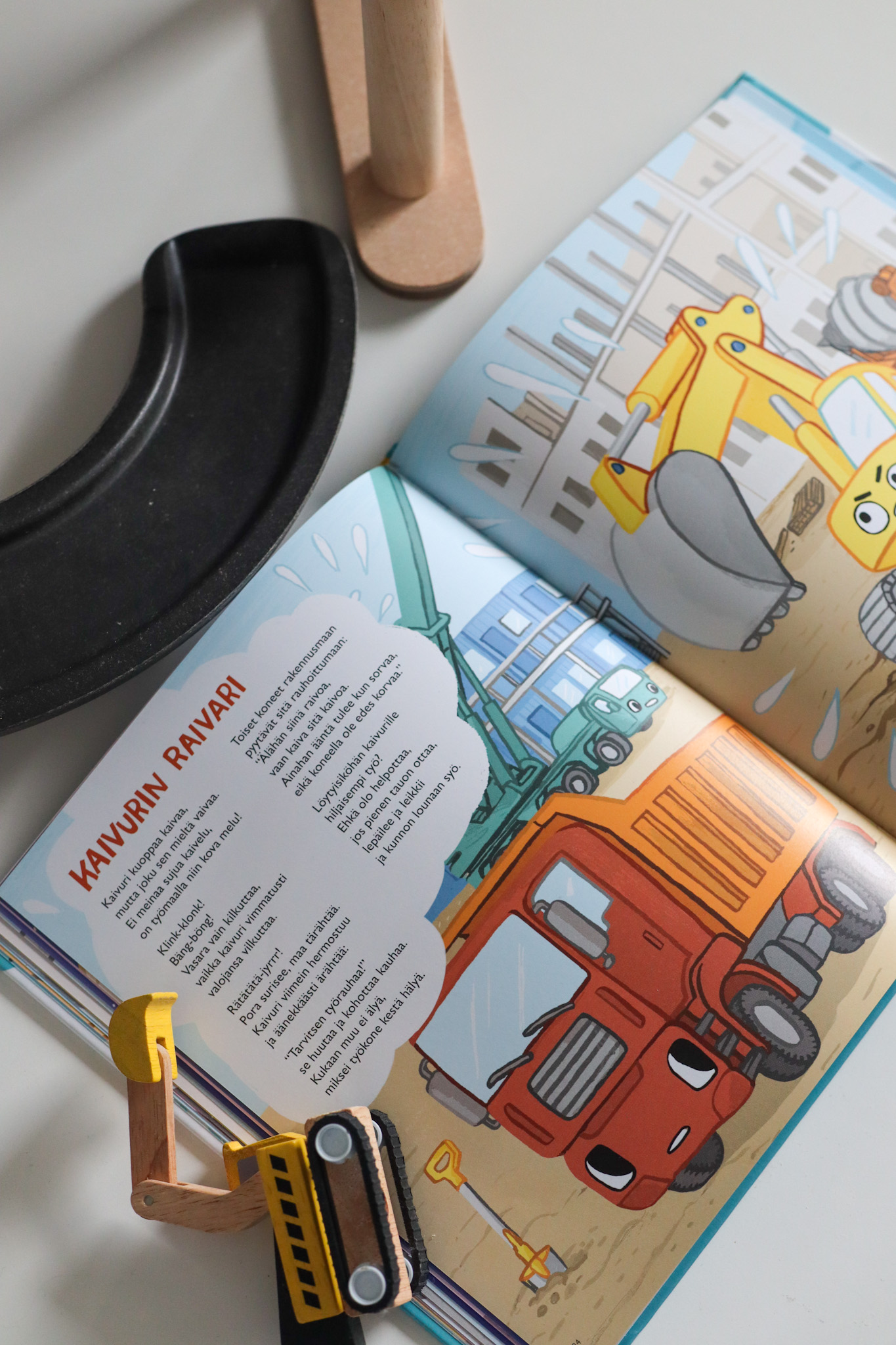 Postiluukusta kolahti paketti. Tartuin siihen innokkaana. Sen on varmasti oltava se kirja, ajattelin! Tiesin jo, että tulen pitämään tästä kirjasta todella paljon. Lapseni tulee pian viereen. Hänen silmänsä tarttuvat kannessa komeilevaan kaivuriin ja hän haluaa kirjan itselleen. Annan kirjan hänelle ja pian hän sanoo: ”äiti lukee”. Ja niin äiti lukee ja lukee uudelleen. Tiesin, että tämä kirja vallottaisi meidät molemmat.