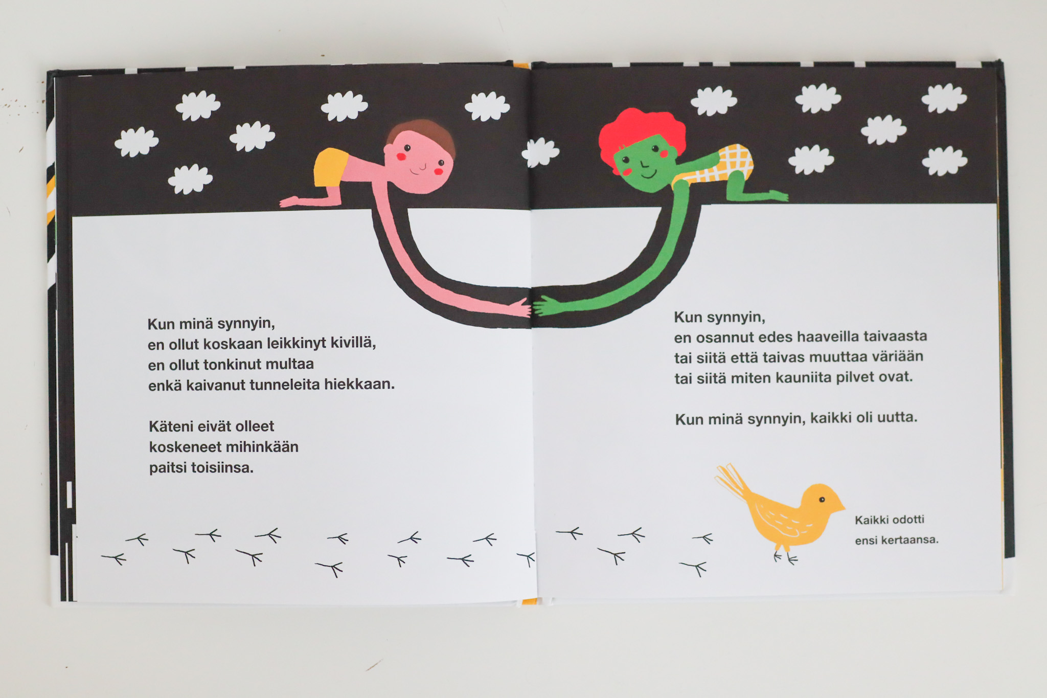 Kun minä synnyin -kirja on Isabel Minhós Martinsen kirjoittama ja Madalena Matoson kuvittama. Sen on julkaissut Suomessa Etana Editions (2019). Muistan nähneeni kirjan Eemin ollessa vauva. Ihastuin siihen ensi vilkaisulla, mutten ostanut sitä. Eemi saikin sen sitten myöhemmin 1-vuotislahjaksi ystävältäni. Olemme lukeneet tätä Eemin kanssa jo yli vuoden päivät ja olen vakuuttunut, että se on yksi ihanimmista kuvakirjoista mitä tiedän! Kirja valittiinkin Frankfurtin kirjamessuilla 100 erinomaisen kuvakirjan näytelyyn (Outstanding Picture Books) vuonna 2018.