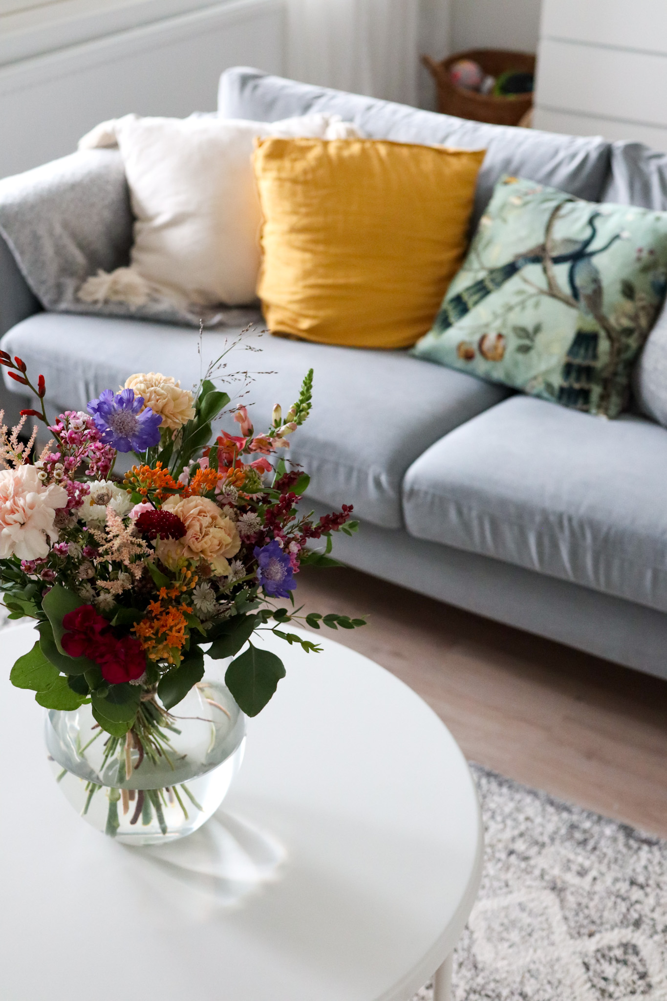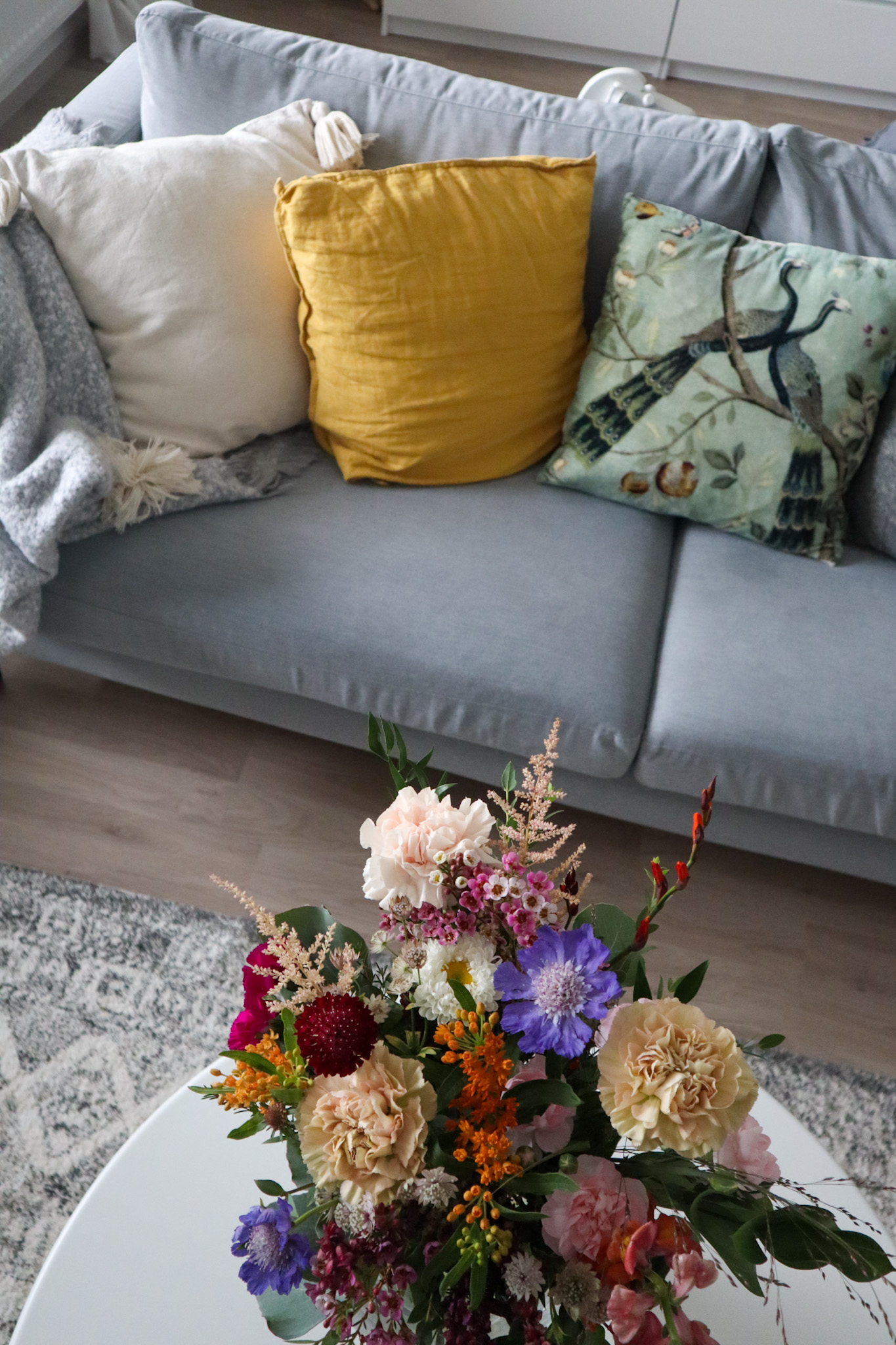 Onpa kaunis tuo kukkakimppu! Teidän kotihan on upea. Me asutaan neljästään 49 neliössä, ja liian tavaramäärän ja vähäisten voimavarojen takia koko ajan on ihan älytön sotku. Ei muuten tule kutsuttua vieraita.