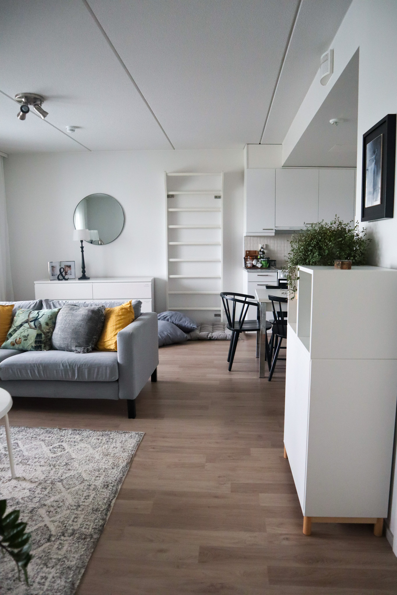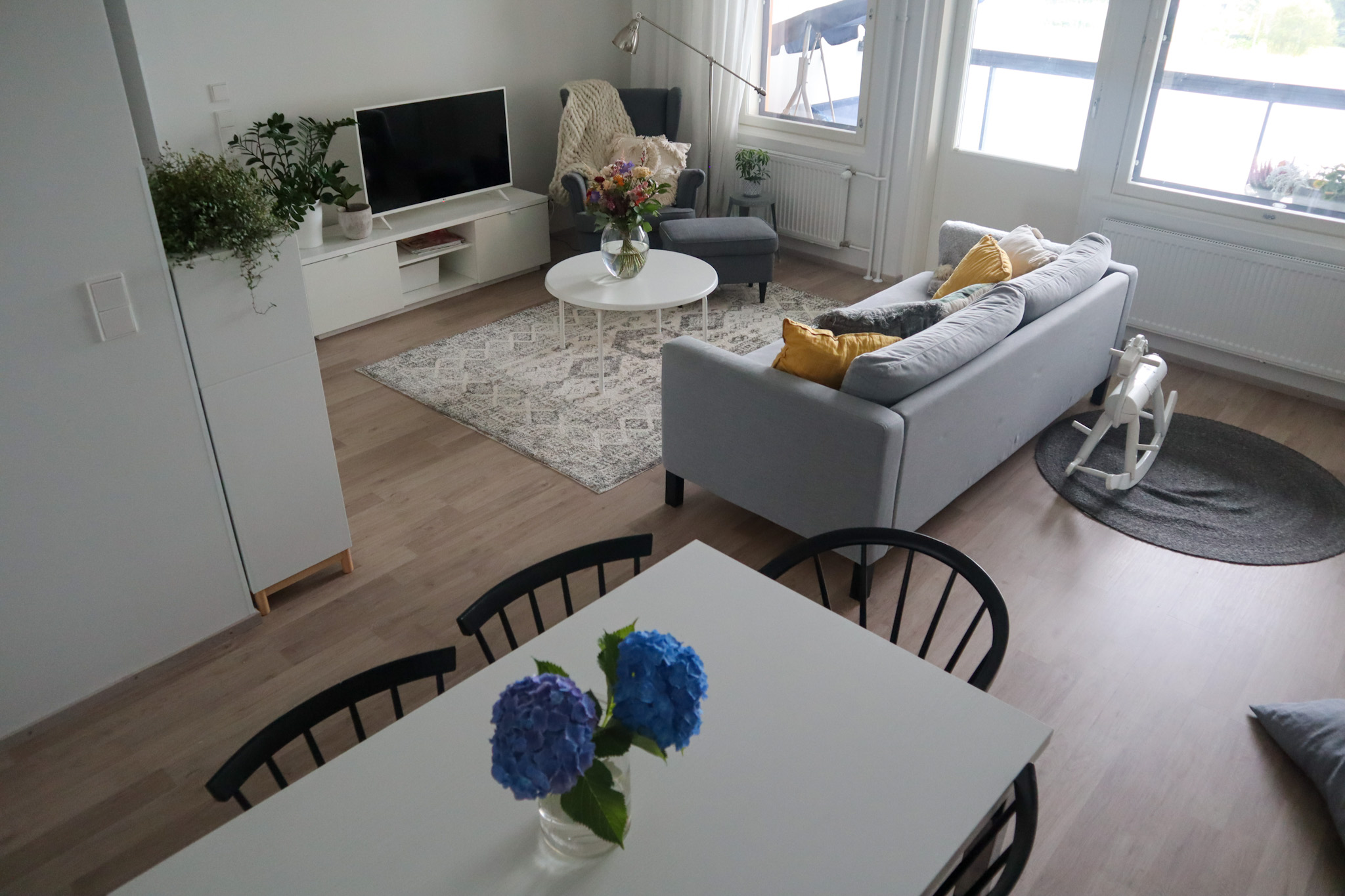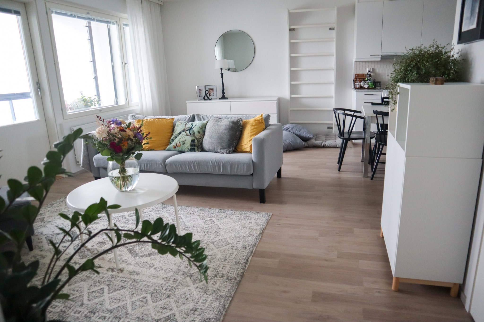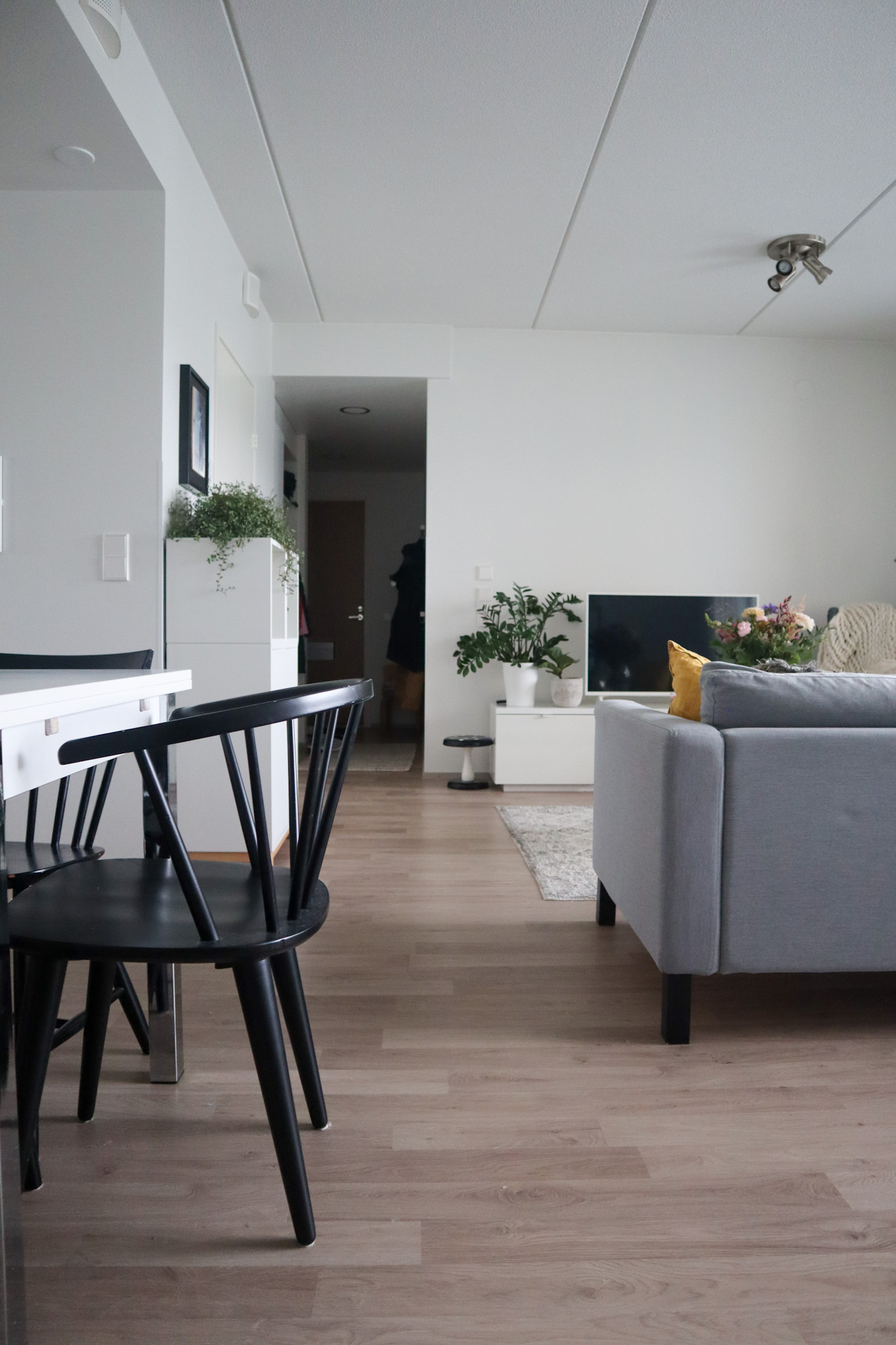 Blogissa on vilahtanut kuvia kodista ja Instagramissa olen esitellyt kodin pariinkin otteeseen. Nyt kuitenkin tälläinen virallisempi katsaus meidän olohuoneeseen ja avokeittiöön. Olemme tosiaan vuokralla 65 neliöisessä kolmiossa. Kerrostaloasunto on uudiskohde, jonka ensimmäiset asukkaat olemme. Meillä on hyvin pieni eteinen, joka muutamassa kuvassa näkyykin. Lisäksi meillä on tosi hyvän kokoinen vessa, jota ei näy kuvissa ja valtava parveke. Parvekkeella on pihakeinu ja neljän hengen pöytä. Se on koko kesän ollut kovalla käytöllä ja lasituksen takia toimii syksylläkin! Mielessäni se tietysti on täynnä valoja ja lyhtyjä, mutta katsotaan saanko mielikuvan ikinä toteutukseen!