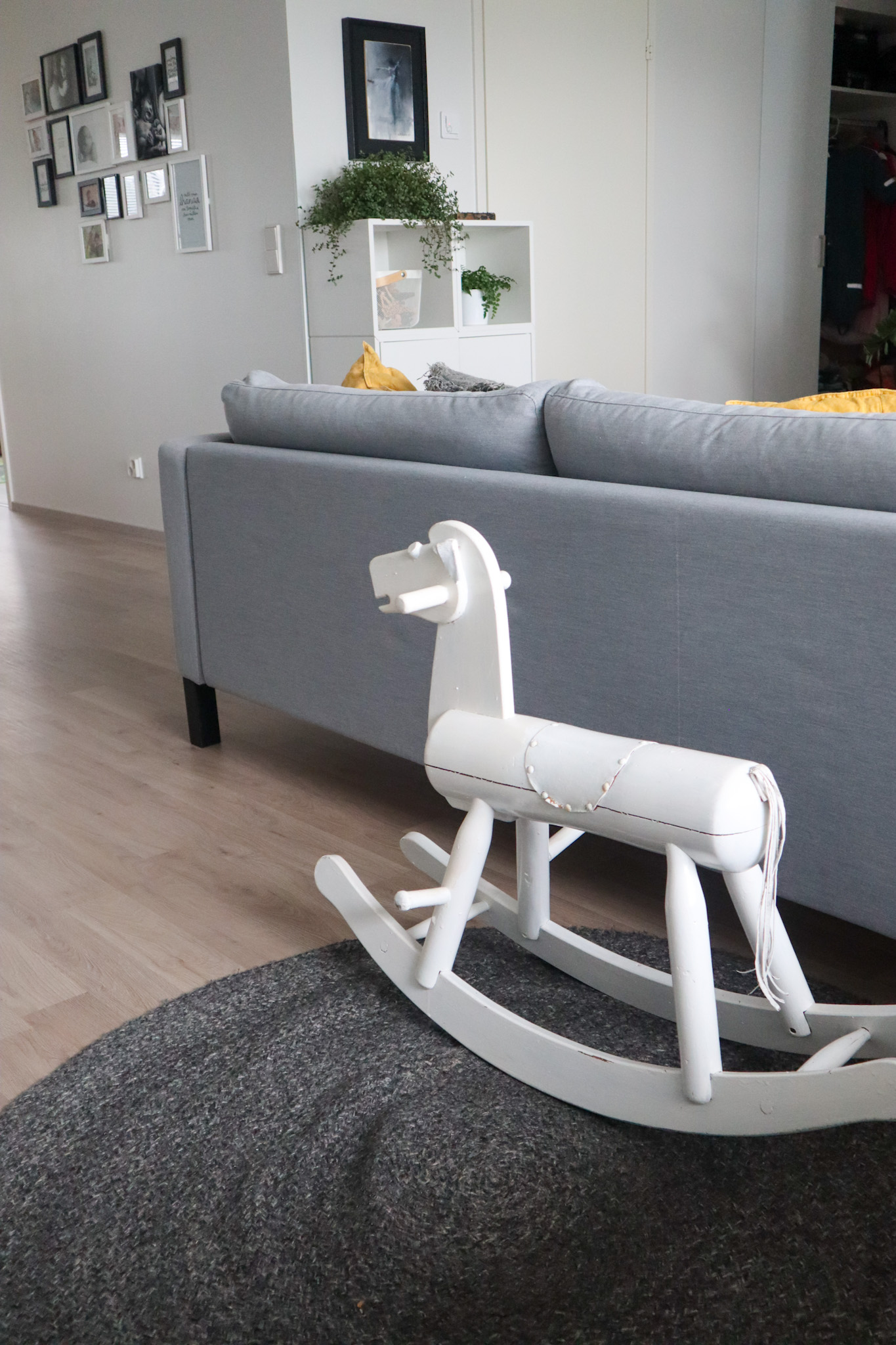 Puinen keinuhevonen on minun vanhani. Olen saanut sen äidiltäni 1-vuotislahjaksi. Eli sillä on pian ikää jo 28 vuotta. Sen alla on pyöreä villamatta, joka on Casa Stockmannin.
