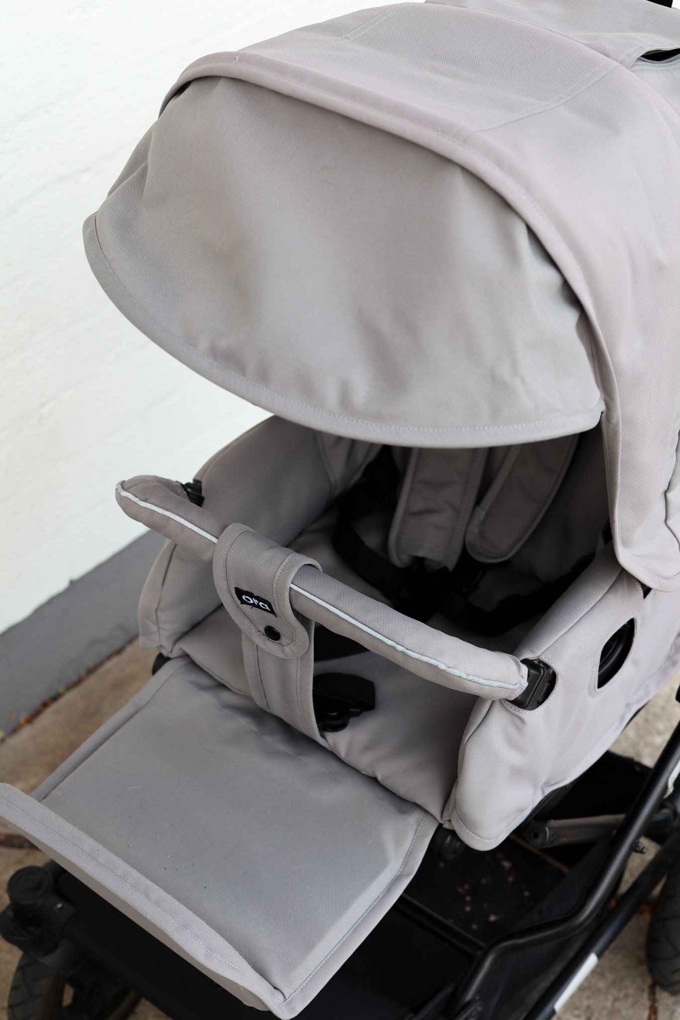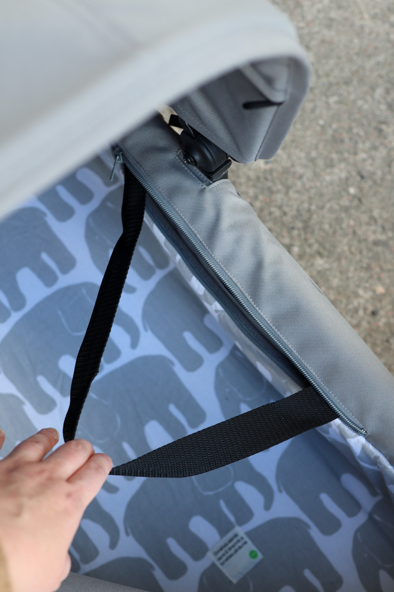 Vaunukopan ja istuinosan kuomu on todella tukeva ja tulee riittävän pitkälle. Molemmissa kaikki kangasosat on irrotettavissa ja pestävissä, joka on mieletön juttu. Vaunukopan osat olen kerran pessyt ennen varastointia, mutta istuinosaa on saanut pestä useammankin kerran. Osat on helppo laittaa paikoilleen pesun jälkeen. Kankaisiin ei ole lisätty terveydelle haitallisia lisä- tai käsittelyaineita ja niille on myönnetty Öko-tex Standard100 -sertifikaatti. Ulkokankaat on lisäksi Bio Eco Finish -kostauskäsiteltyjä. Kankaat kestävätkin hyvin vettä, enkä ole aina tihkusateeseen sadesuojaa laittanut.