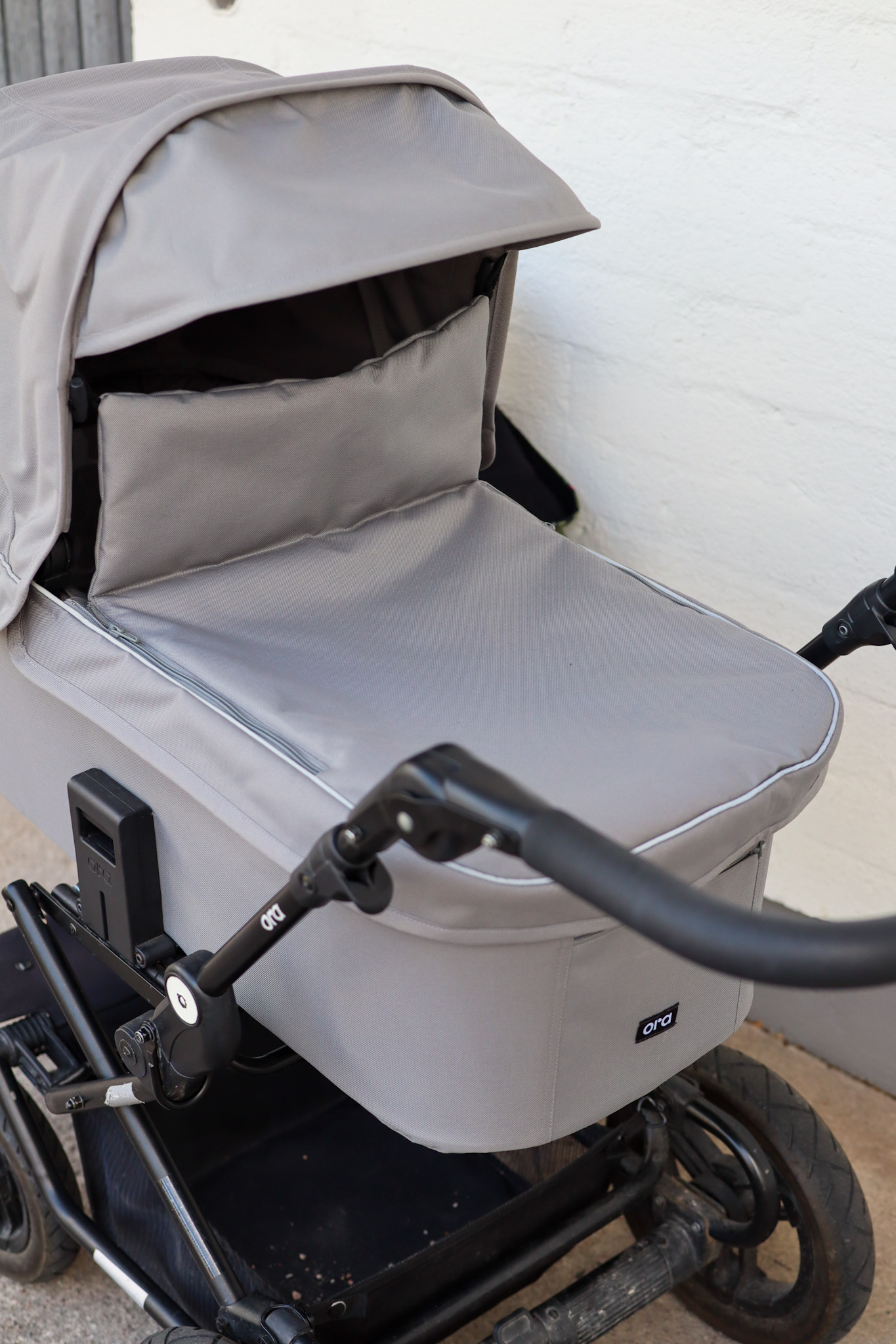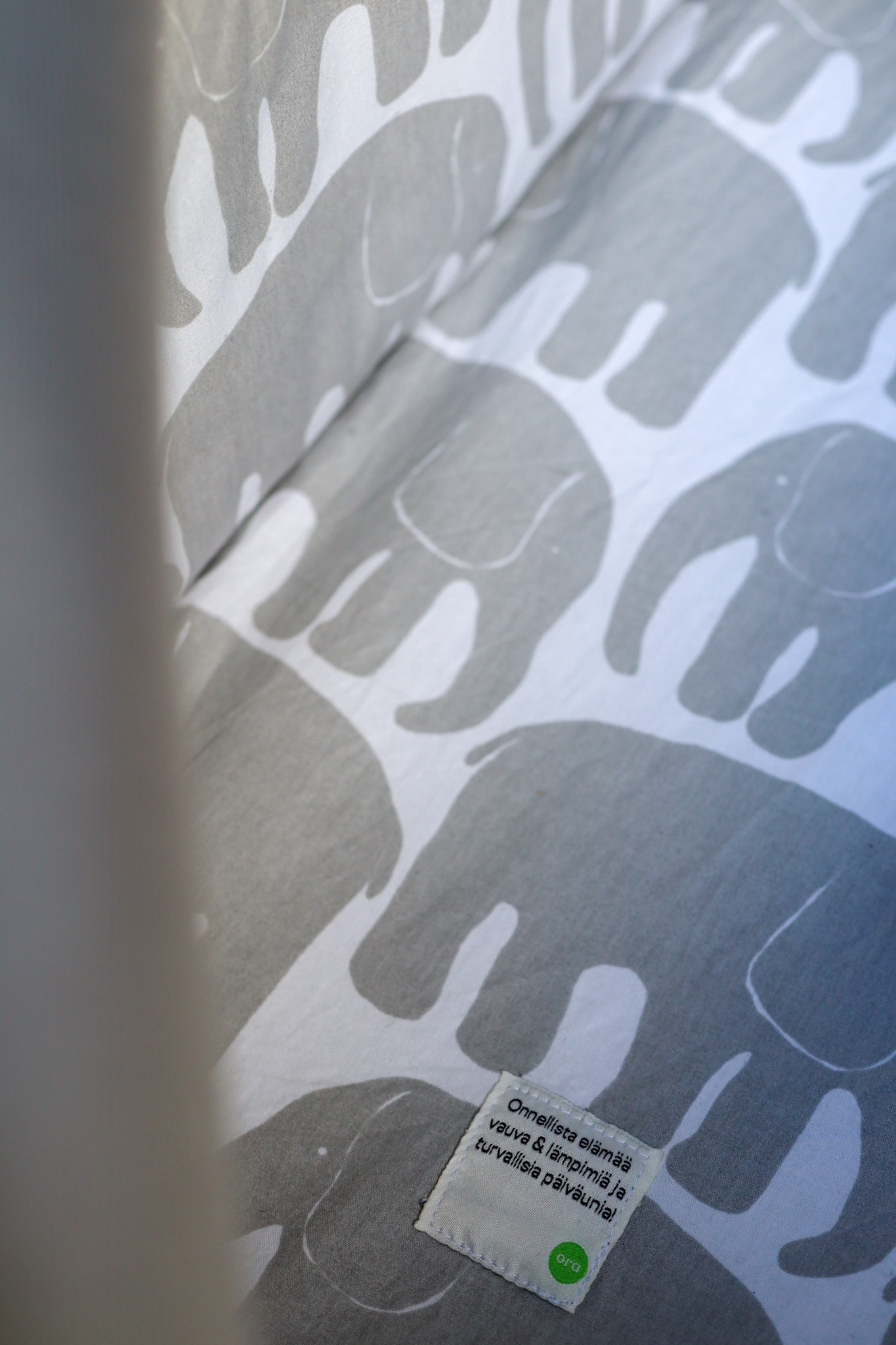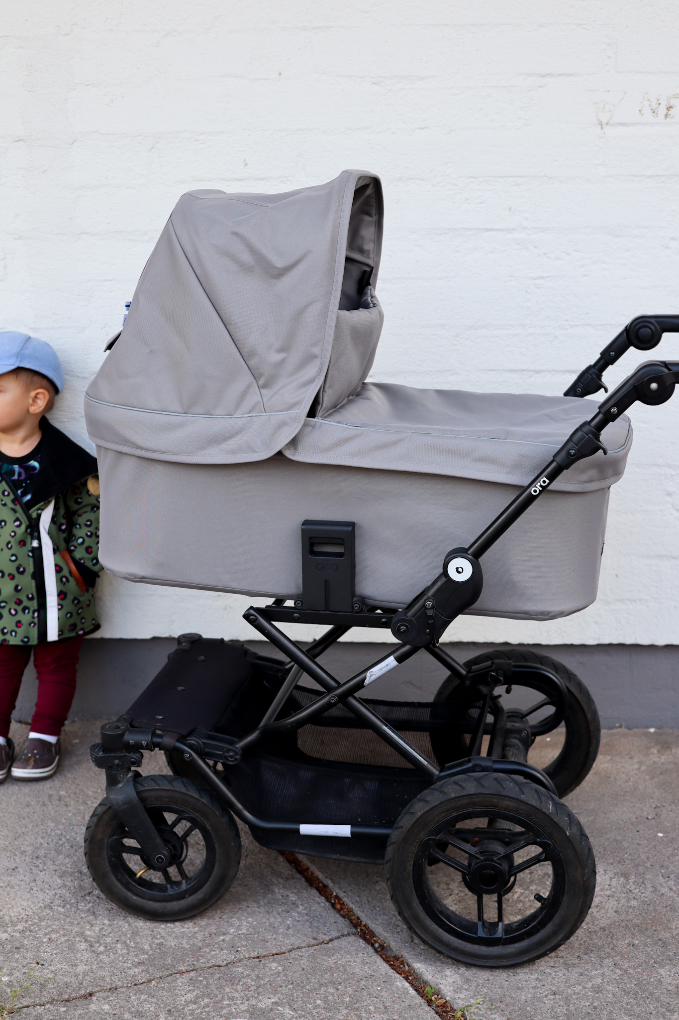 Ora on ainoa kotimainen vaunujen ja rattaiden valmistaja, eli tämän kotimaisemmiksi ei voi mennä. Oran tarina alkaa vuodesta 1957 Porista, jossa vaunut ja rattaat edelleen suunnitellaan. Minulla itselläni on lapsena ollut Oran rattaat, joten tuntui todella ihanalta valita omalle lapselle myös Orat. Meillä käytössä oleva malli on nimeltään Ora Onni -yhdistelmävaunut ja ne ommellaan tilaustyönä Oran omelimossa Porissa. Onneja on kahdessa värissä, mustikka ja luoto. Nämä ovat luoto-sävyä ja vaunukopassa on Finlaysonin harmaa Elefantti-kangas. Vaunukoppan sisäosiin saa valita mieleisensä kankaan.