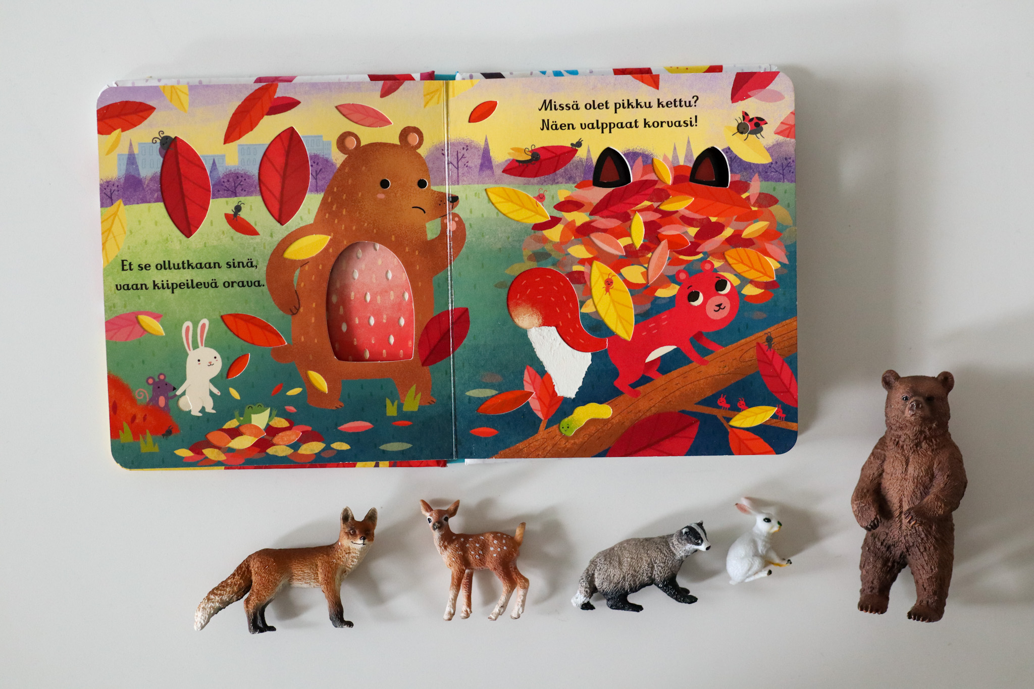 Kirjan kuvitus on ihana. Siinä on kauniita, kirkkaita värejä, joita pienikin näkee ja osaa ihmetellä. Kirjan on kuvittanut Sam Taplin. Kirjassa on pieni tarina, johon kuvitus luonnollisesti yhdistyy. Lukija pääsee etsimään muiden eläinten kanssa pientä kettua, joka lopulta löytyy äidin kainalosta. Kirjan on kirjoittanut Emily Dove.