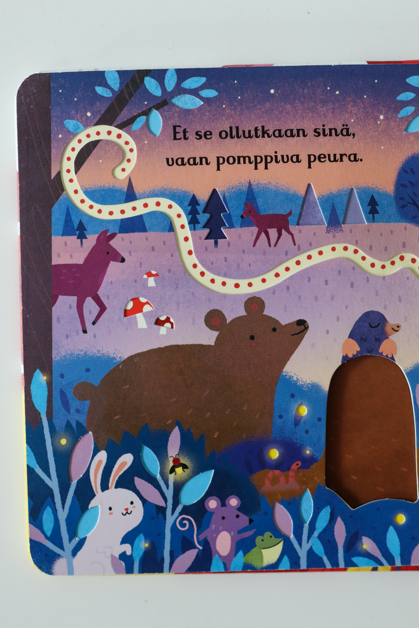 Itseäni ihastuttaa kirjan moniaistillisuus. Siinä paksut kannaet ja paksut sivut, joita voi hyvin maistellakin. Siinä ei ole luukkuja, jotka voisi mennä rikki käsittelyssä, mutta siinä on aivan ihania koloja ja reikiä, joita voi tunnustella pienillä sormilla. Paksu kirja on pienille sormille paras, ne pystyvät tarttumaan sivuihin ja kääntämään sivuja itse. Kädet saavat hienomotorista treeniä lukiessa.