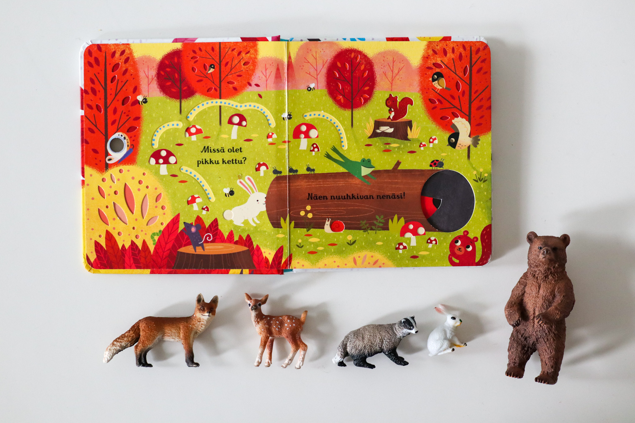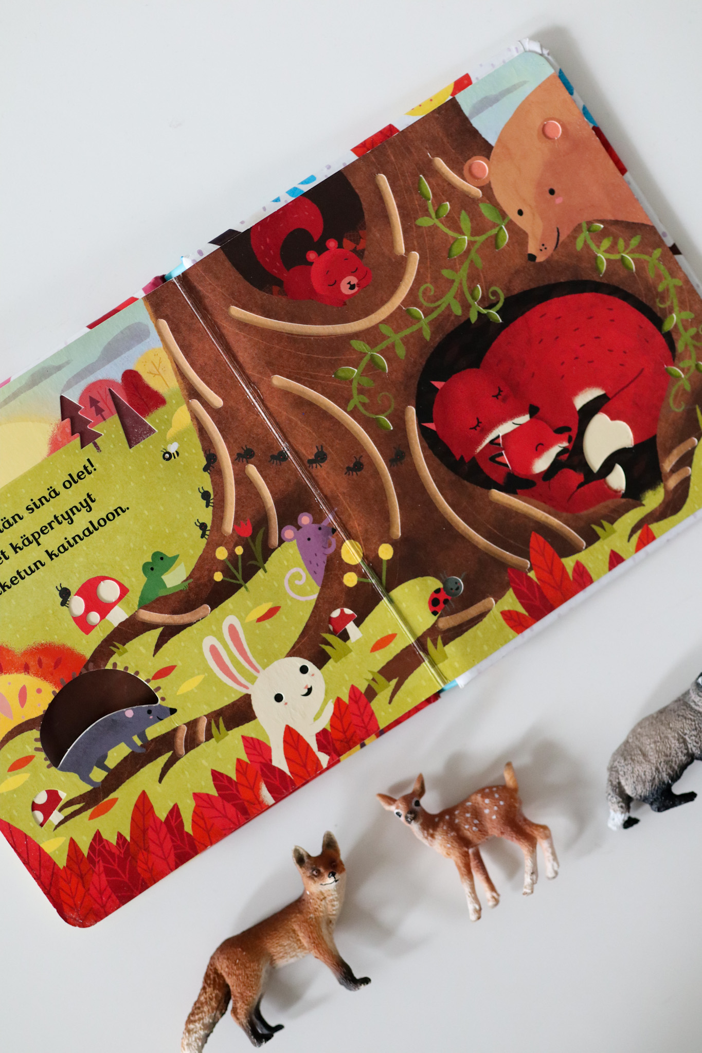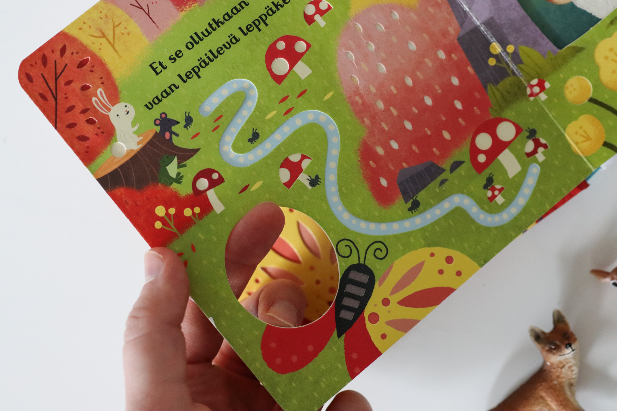 Itseäni ihastuttaa kirjan moniaistillisuus. Siinä paksut kannaet ja paksut sivut, joita voi hyvin maistellakin. Siinä ei ole luukkuja, jotka voisi mennä rikki käsittelyssä, mutta siinä on aivan ihania koloja ja reikiä, joita voi tunnustella pienillä sormilla. Paksu kirja on pienille sormille paras, ne pystyvät tarttumaan sivuihin ja kääntämään sivuja itse. Kädet saavat hienomotorista treeniä lukiessa.