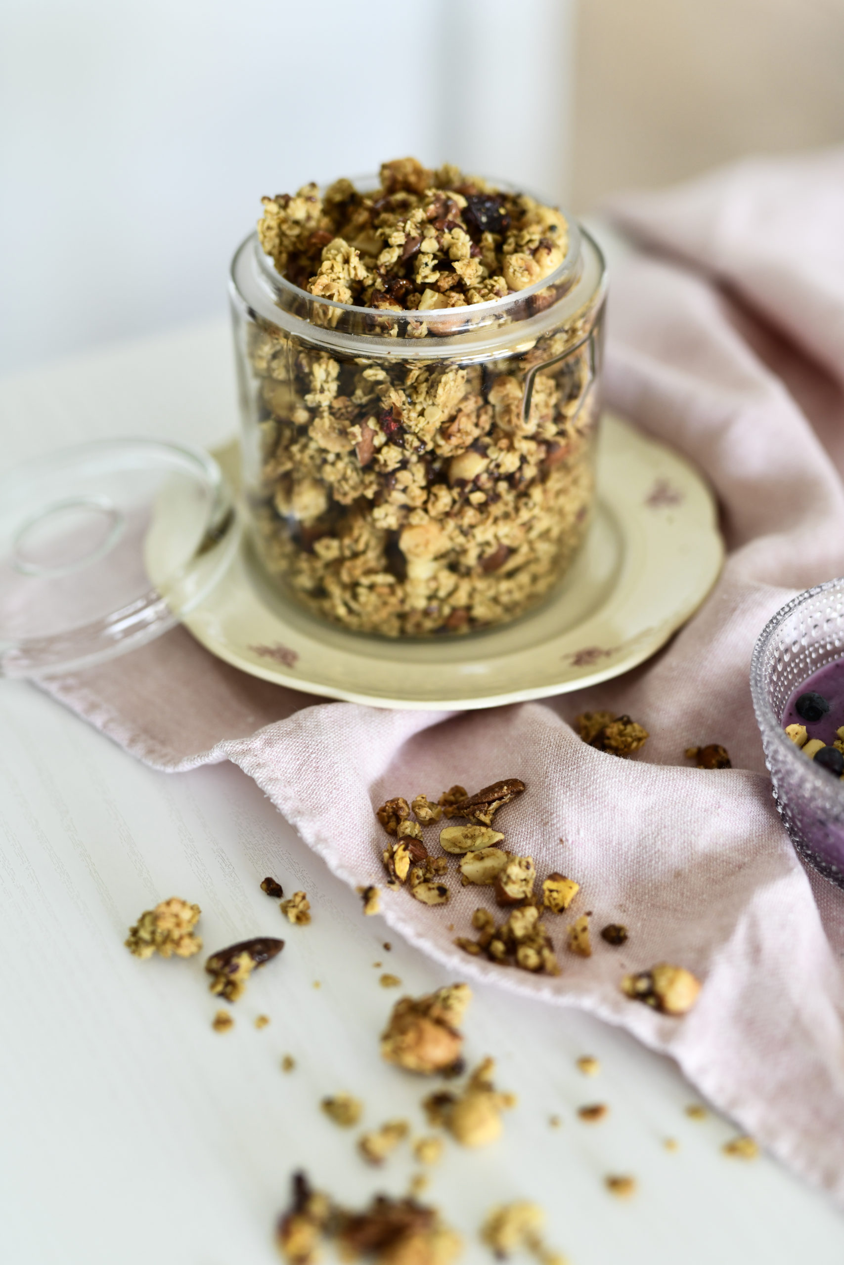 Olen halunnut granolasta rapeaa ja sellaista paakkuista isoilla sattumilla. Olen halunnut granolasta kunnon överiherkkua, pähkinöillä, kuivatuilla marjoilla ja tummalla suklaalla. Ja tämä on just sellaista herkkua, jota tarjoaa mielellään viikonloppujen aamupalahetkillä, välipalavieraille tai syö itse suoraan purkista! Sopii jugurtteihin, maidon kanssa ja sellaisenaan.