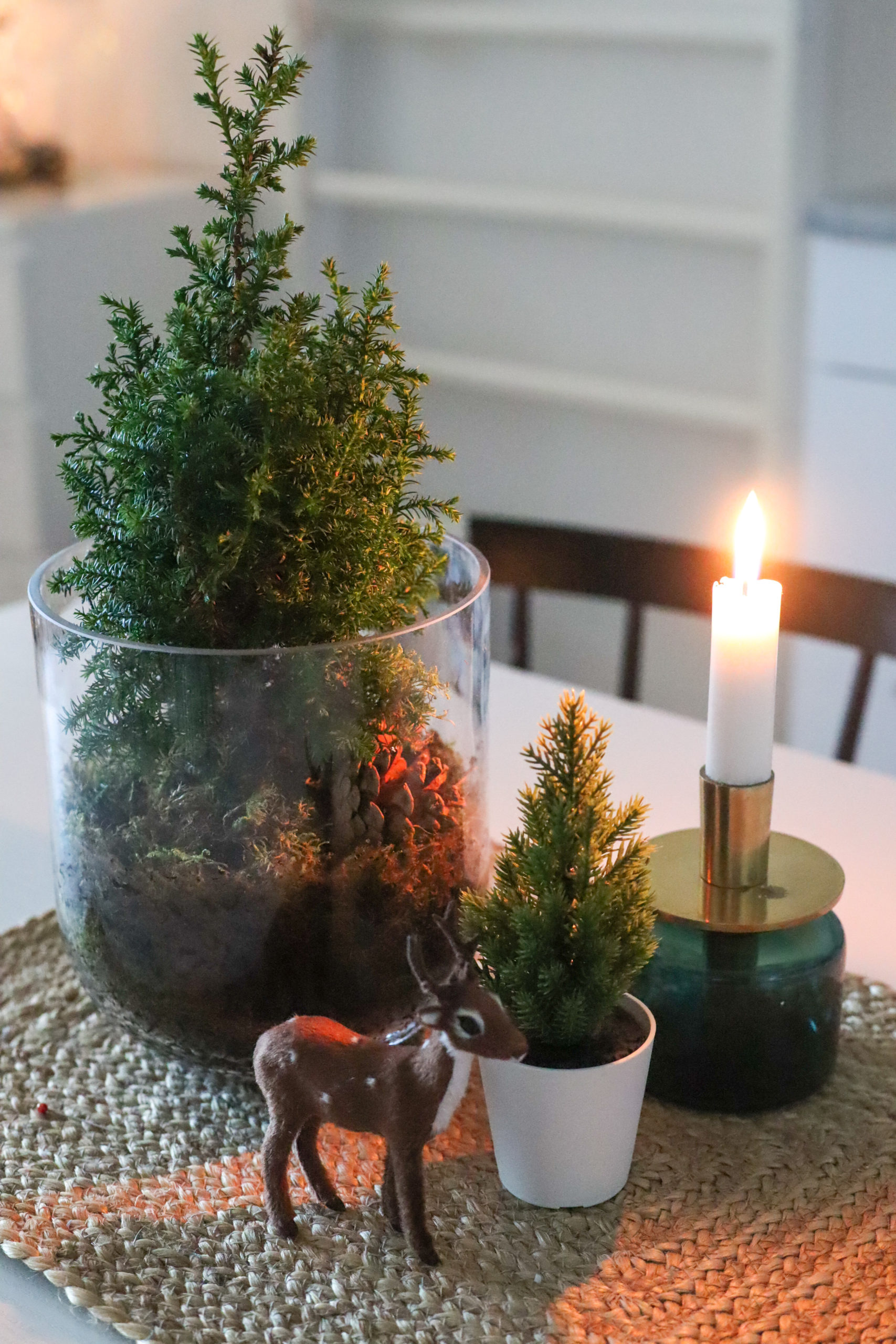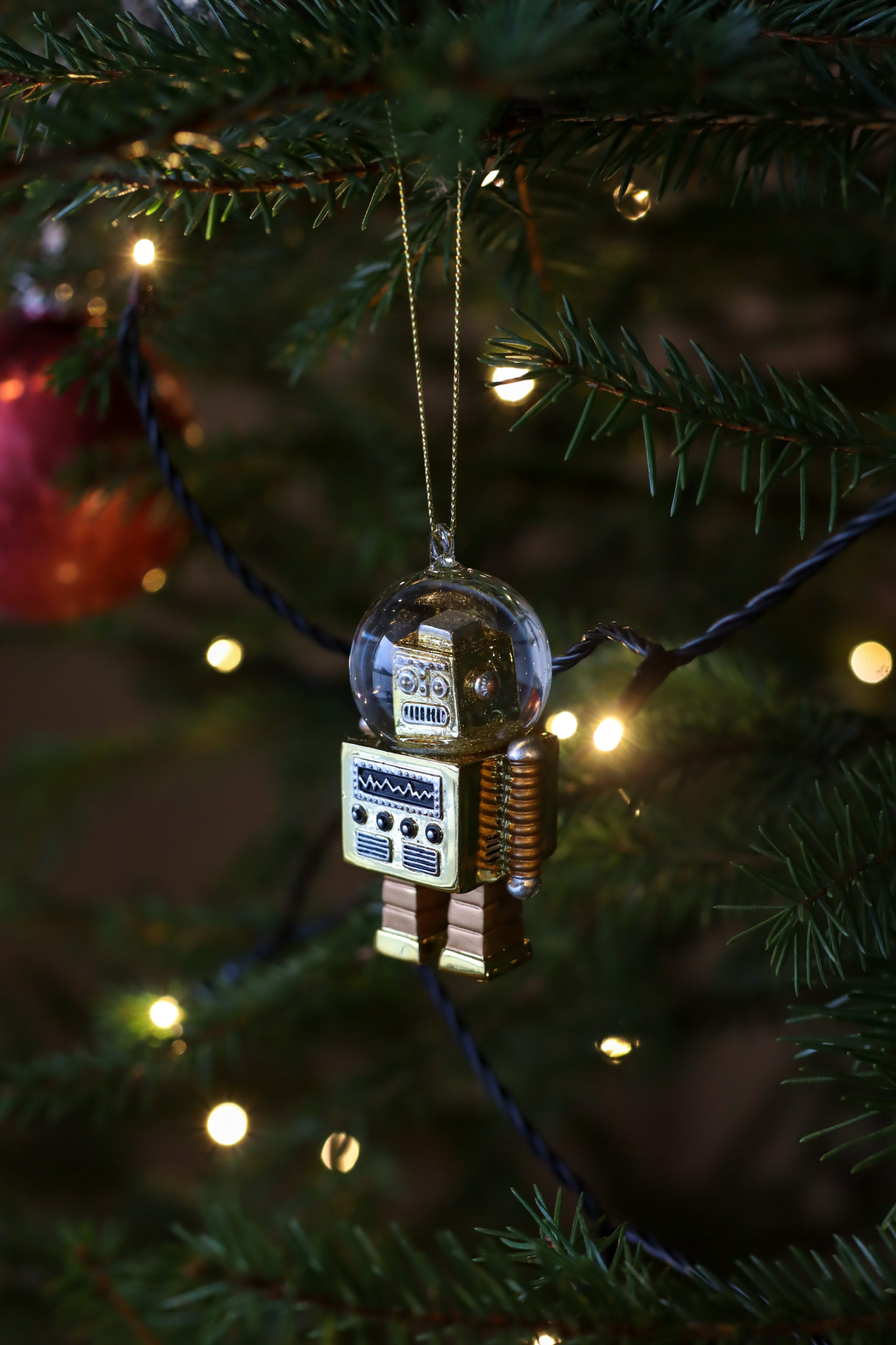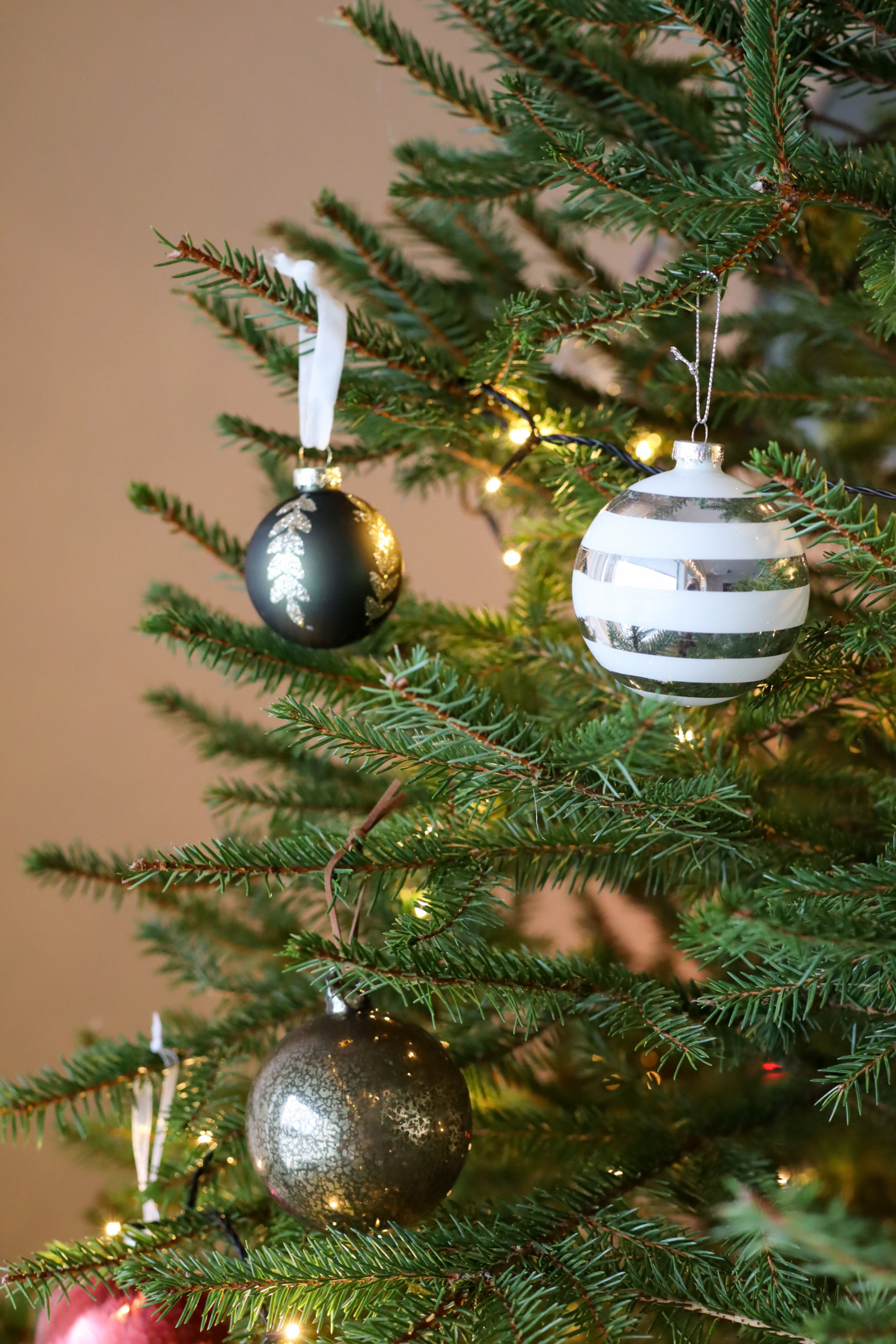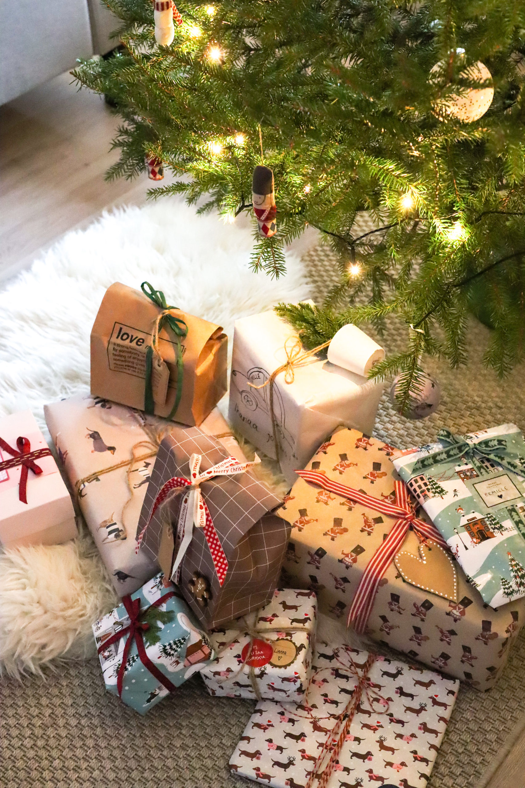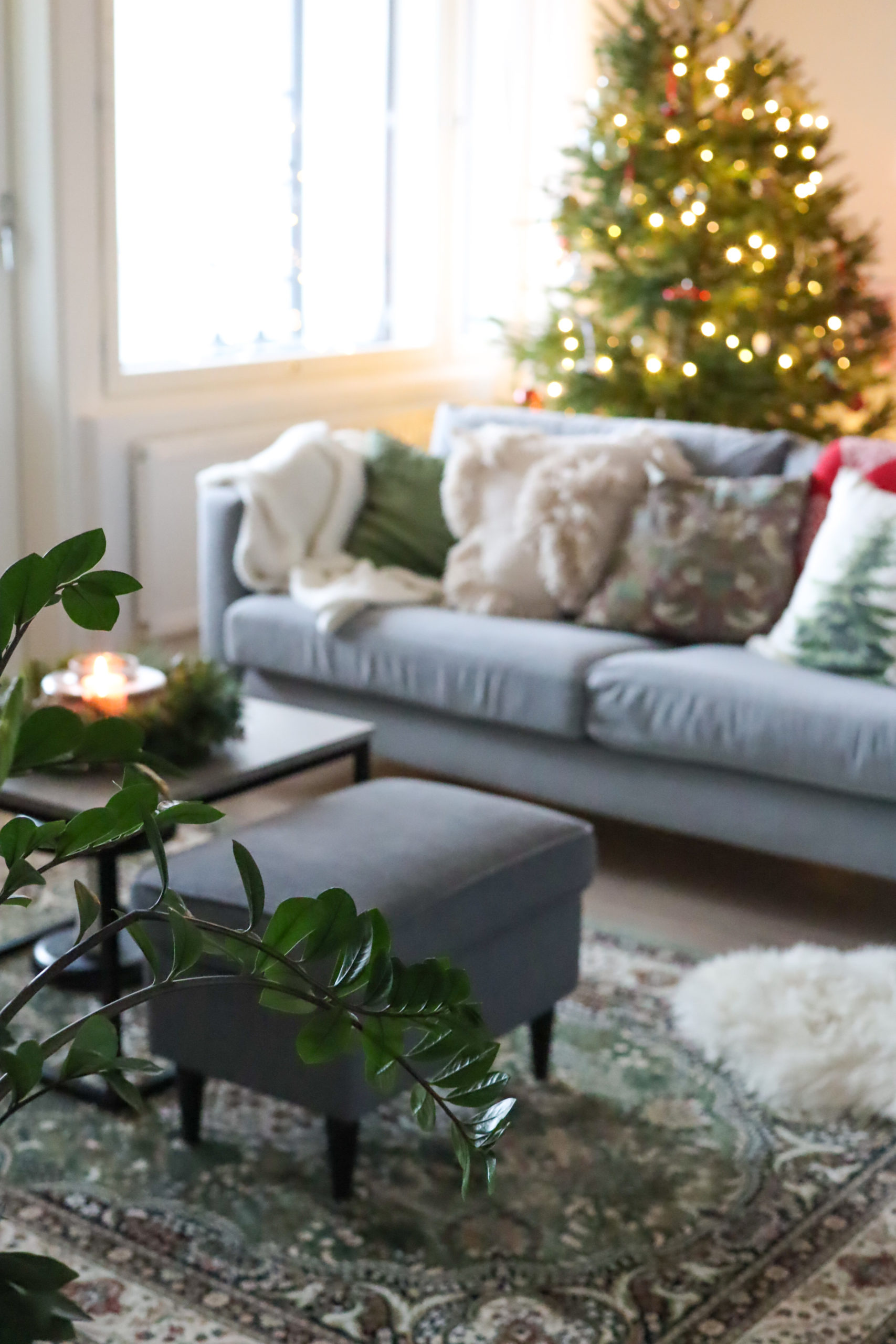Tänä vuonna toteutui myös haave aidosta joulukuusesta. Viimein meillä on koti johon kuusi mahtuu. Kävimme sahaamassa sen paikalliselta tilalta ja toimme kotiin. Se sai ylleen jouluvalot ja muutti kotimme todelliseksi joulukodiksi. Sohvan punaisen viltin ostin 16-vuotiaana. Olin joulun ajan töissä ystävien sisustusliikkeessa ja käytin osan palkastani kotimaiseen villapeittoon. Tuntuu hurjalta, että se on jo 12 vuotias ja olen säilönyt sitä siitä asti. Joulutyynyt löytyivät äidiltäni, kuusenjalan sain mummolta ja kuusenkoristeita olen ostellut joka vuosi. Minulla on jo pitkään ollut tapana ostaa joka joulu yksi koriste. Nyt perinne on saanut lisäyksen, sillä olen ostanut oman joulukoristeen myös Eemille jokaisena hänen joulunaan, joista tämä on kolmas.