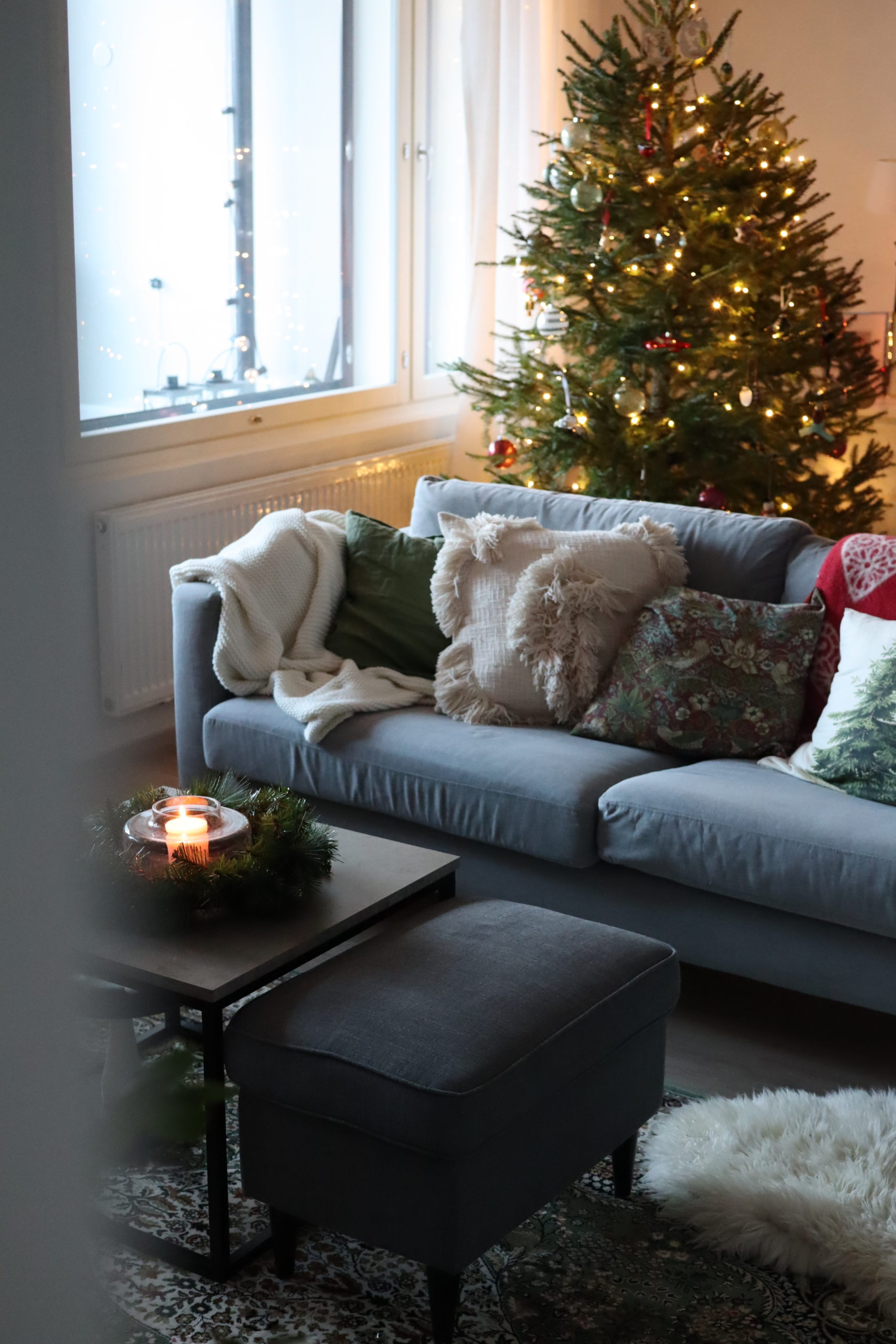 Joulusisustus on pitkälti tehty vain vaihtamalla tyynynpäällisiä ja laittamalla kynttilöitä sekä jouluvaloja jokapuolelle. Ei mitään sen suurempaa, mutta silti ihanaa ja tunnelmallista. Nautin meidän kodista nyt tosi paljon, se on ihana joulukoti!