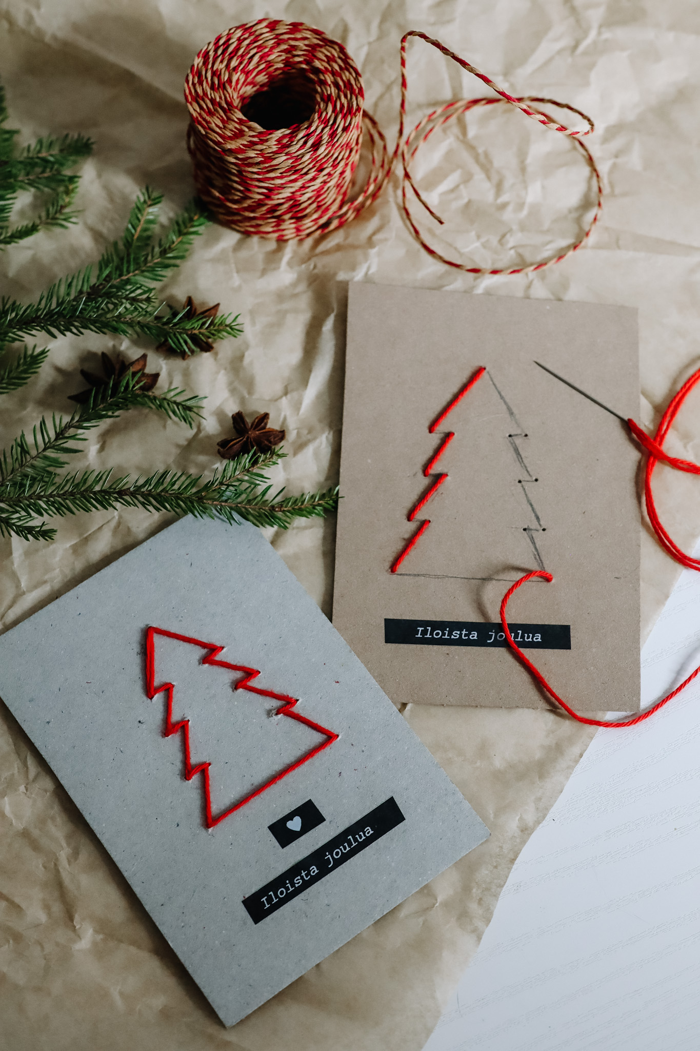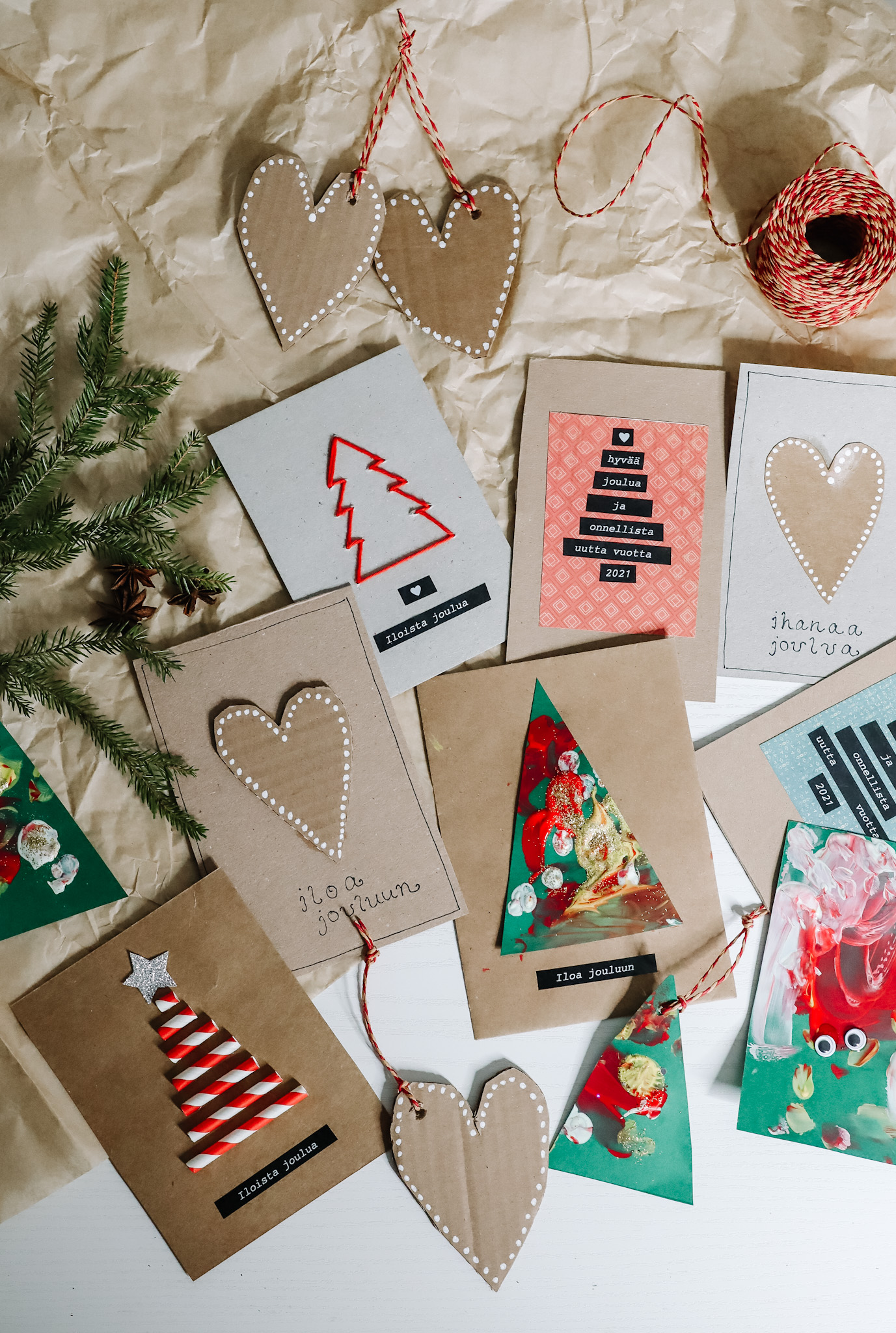 Tänä vuonna korttien lähettäminen tuntuu erityisen tärkeältä ja joulupostia lähteekin monille sukulaisille, joita emme ole tavanneet aikoihin ja tänä vuonna vielä vähemmän. Normaalisti ei tule läheteltyä joulukortteja kaukaisemmille sukulaisille, mutta nyt koen sen ilahduttavan itseäni lähettäjänä ja varmasti myös saajaa. On se ihan eri juttu kuin viestin lähetys whatsappissa. Itsetehdyt joulukortit lähtee myös Eemin päiväkodin aikuisille kiitos viestin kera.