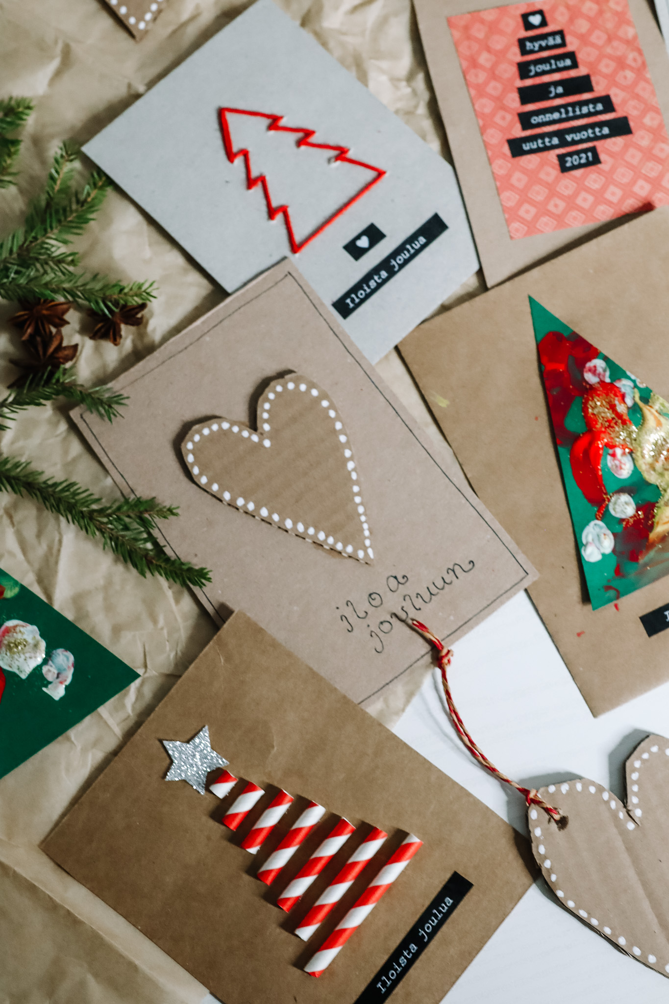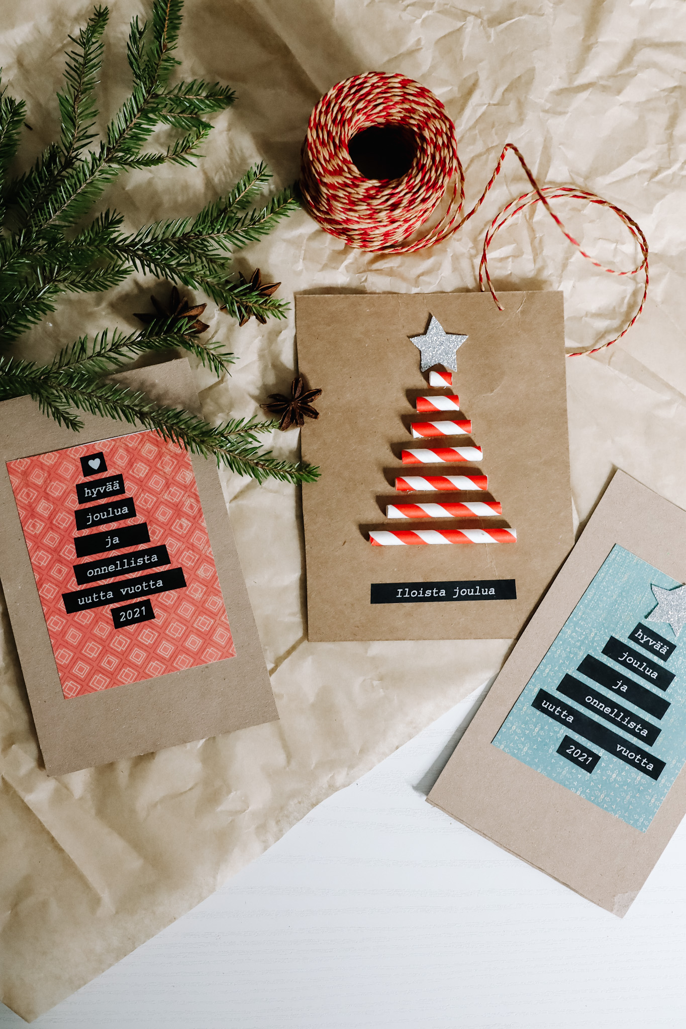 Yksi kortti syntyi paperipillista. Leikkasin punavalkoisen pillin eri pituisiin osiin ja liimasin korttipohjaan kuusen muotoon. Tosi simppeli ja hauska!