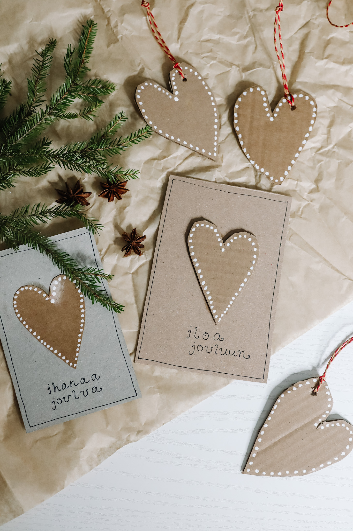 Näihin kortteihin leikkasin pahvilaatikosta sydämiä. Koristelin ne valkoisella tussilla ja liimasin korttipohjaan, johon kirjoitin vielä mustalla tussilla joulun toivoitukset. Lisäksi syntyi myös muutama pakettikortti!