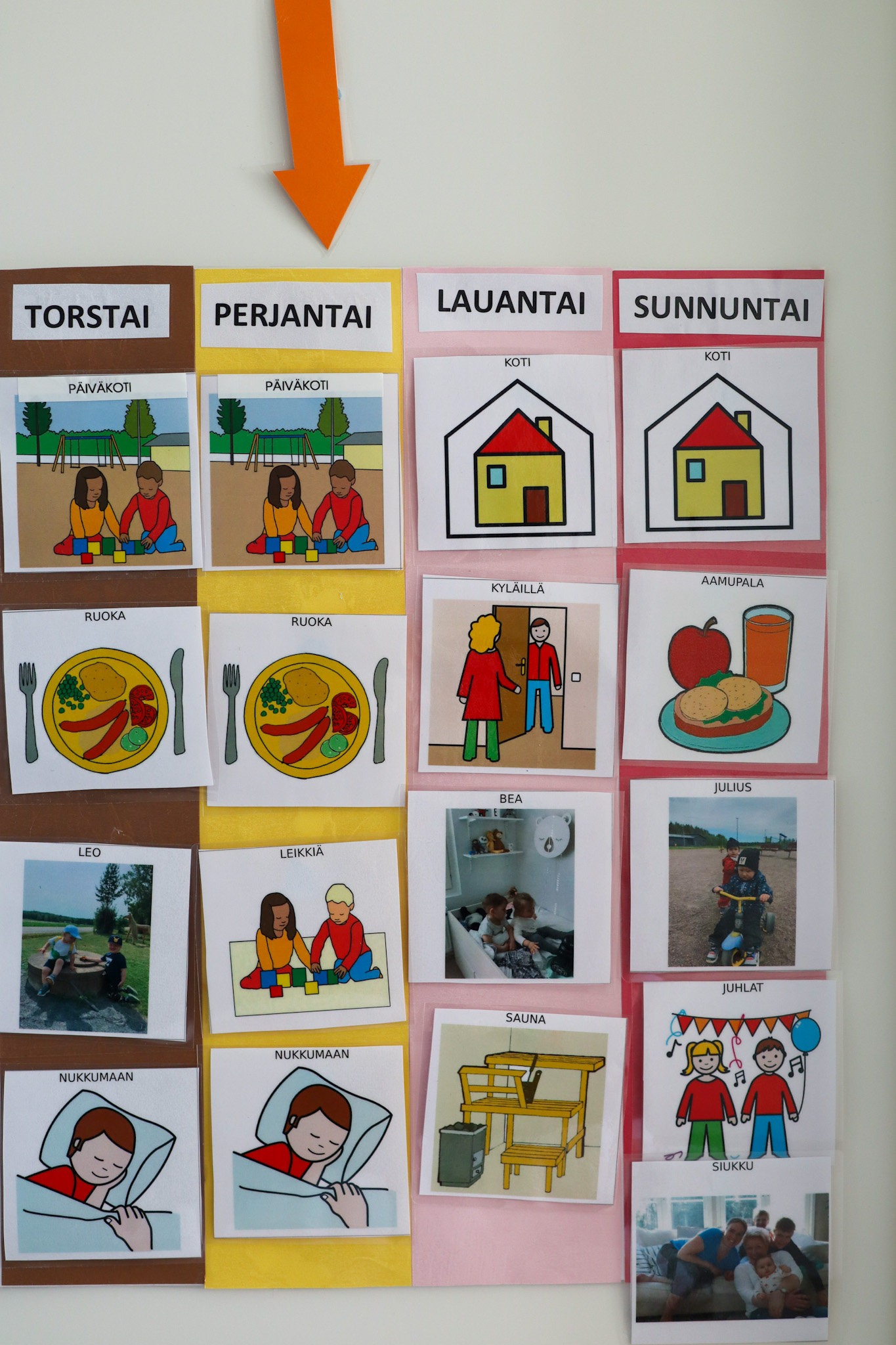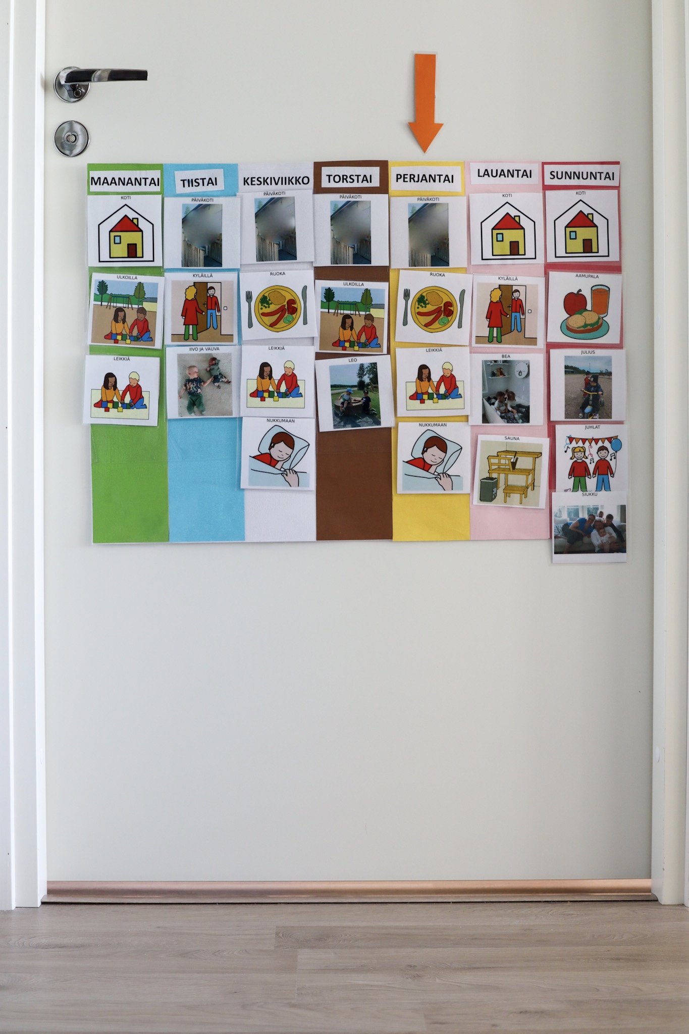 Viikkojärjestyksen voi tehdä itse. Minä ostin kartonkeja, joista tein pohjan. Päällystin sen kontaktimuovilla, jotta se olisi kestävämpi. Pohjan voi suunnitella omiin tarpeisiin, eli se voi olla suurempikin tai pienempi. Tulostin kuvia, jotka laminoin ja näin ne kestävät myös pitkään kovaakin käyttöä. Kuvia voi ottaa lehdistä, piirtää itse tai kuvata lapsen todellista ympäristöä ja tulostaa kuvat. Osalle saattaa toimia se, että näkee itsensä tekemässä asioita, kuten pesemässä hampaita tai leikkimässä ulkona. Kuvat voi olla todellisia paikkoja, kuva päiväkodista, kodista, läheisistä. Kannattaa tulostaa sellaisia kuvia, jotka ovat oleellisia teidän arjessa ja joiden luulet olevan hyödyksi ja jäsentävän teidän arkea. Usein tärkeitä on varmasti koti, koulu, päiväkoti, kaverit, sukulaiset, mummilat tms., harrastukset, yökylät, hoitajat, juhlat, lomat ja vapaapäivät. Lapset haluavat valmistautua ja tietää, jos arki poikkeaa tai viikko sisältää jotain erityistä. Lisäksi toistuvasti arkea haastavat tilanteet kannattaa kuvittaa.