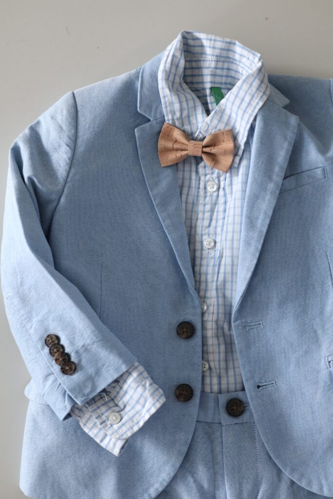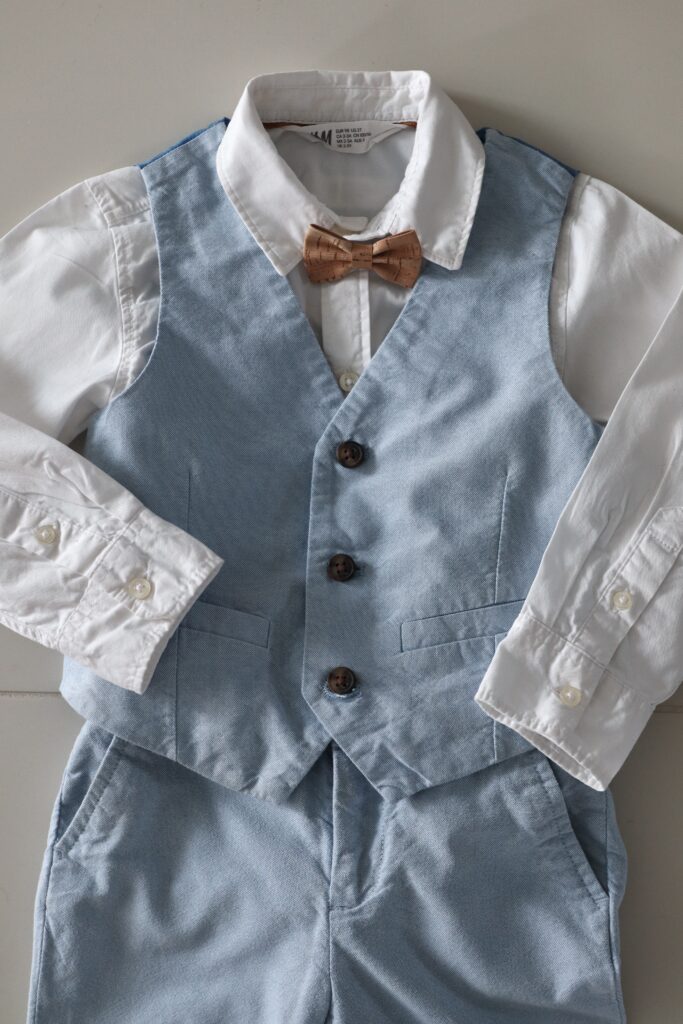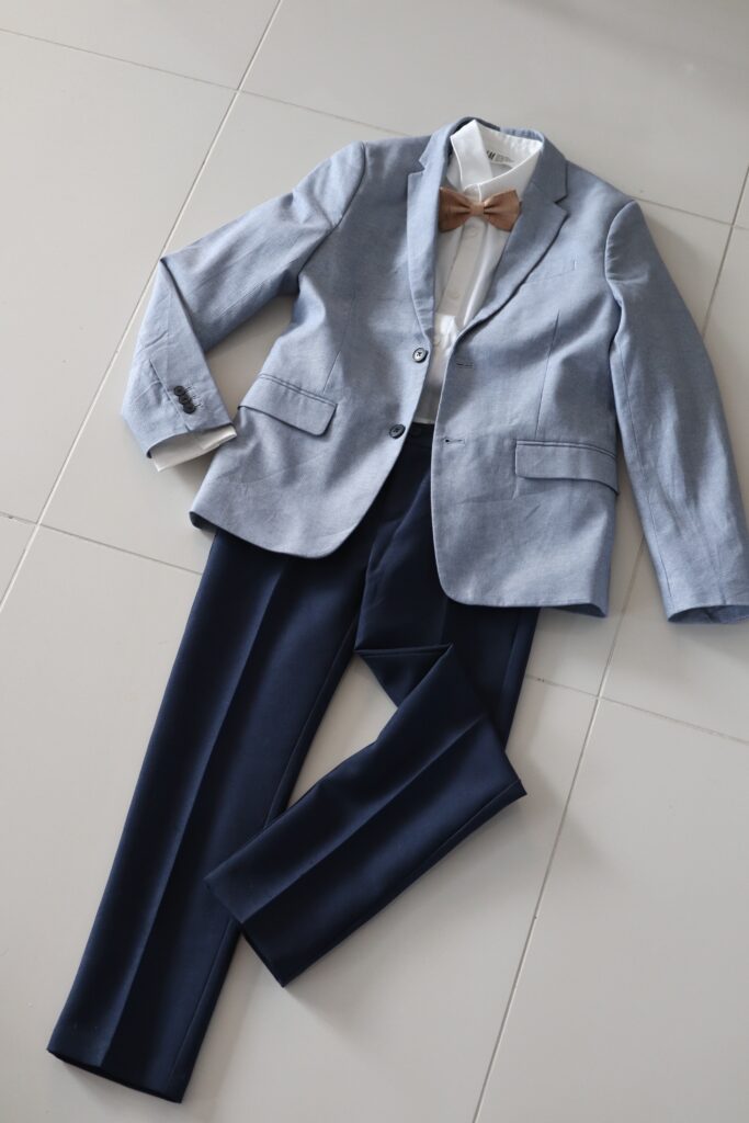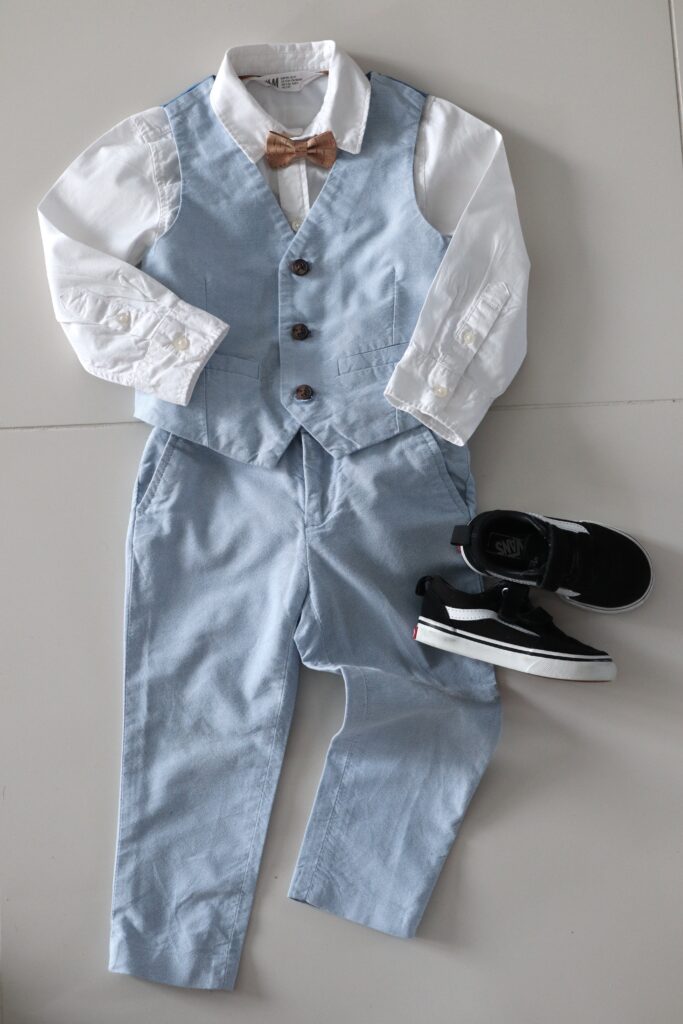 Esikoisen vaatteet ovat myös H&M merkin ja löytyivät käytettynä. Niistä maksoin yhteensä 40€, eli huomattavasti enemmän kuin pienempien vaatteista. Esikoisella on siistit tummansiniset housut, valkoinen kauluspaita ja vaaleansininen takki. Niin ja samanlainen rusetti kuin pikkuveljillä. Esikoinen on häiden aikaan 6v 11kk vanha ekaluokkalainen. Hänen vaatteensa ovat 128-134 kokoa.