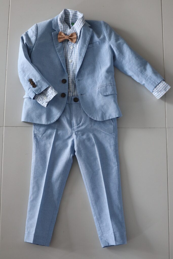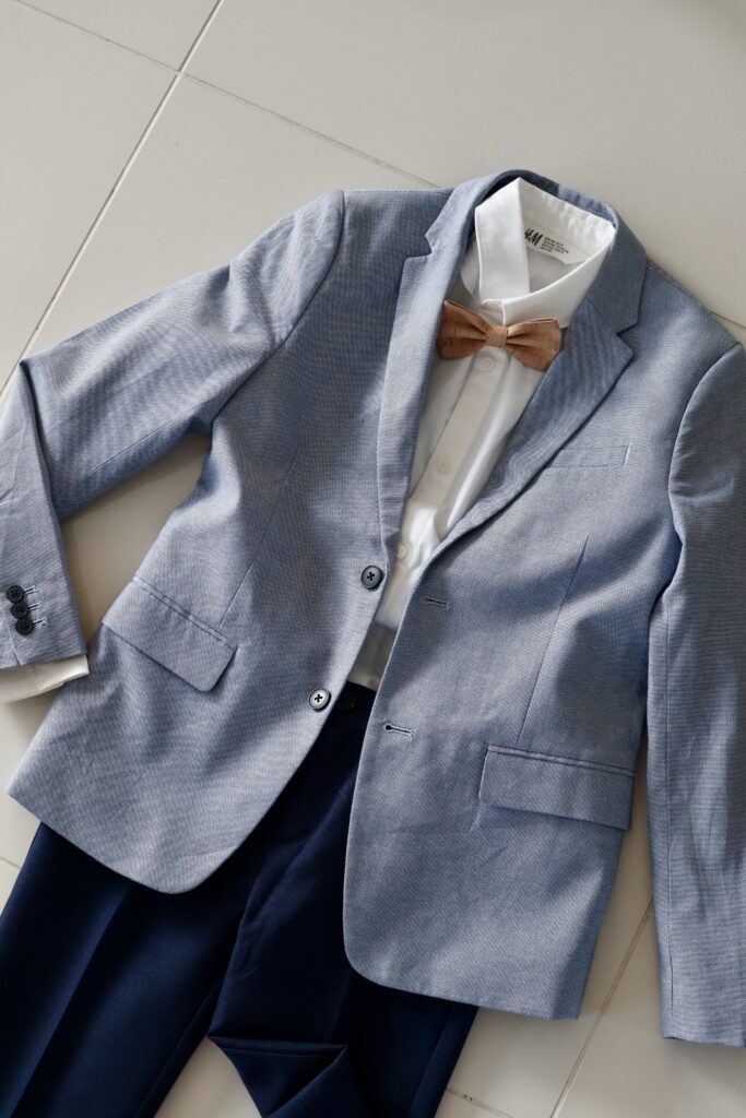 Ystäväni löysi keskimmäiselle H&M puvun kirpputorilta. Siitä oikeastaan kaikki lähti! Ystäväni löysi kuvan housut ja takin 5€ hintaan ja osti sen ajatuksella ”sopii tai ei, ostan, kun tämä on edullinen”. Tästä onnistuneena keksin, että kaikilla lapsilla voisi olla siniset asut. Niiden ei tarvitsisi olla juuri samanlaiset, mutta samaa sävymaailmaa. Mitään teemaväriä meillä ei häissä kuitenkaan ole.
