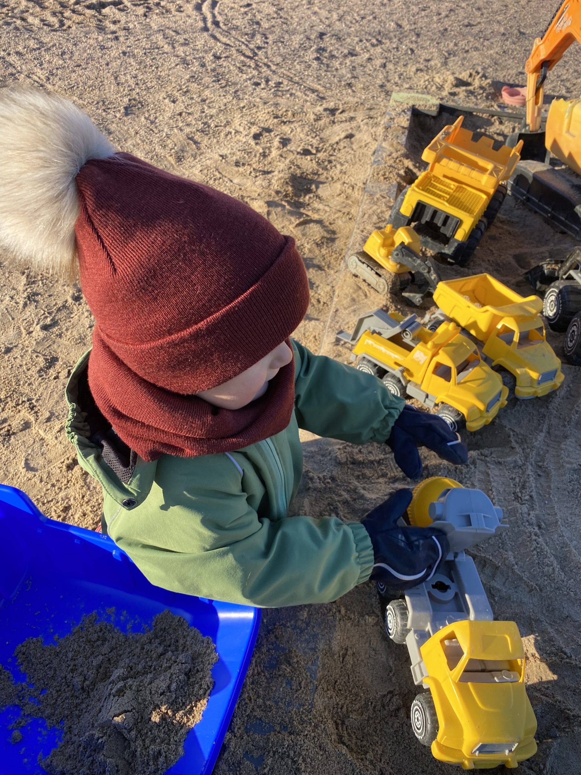 Perjantaina haen aina Eemin muita päiviä aikaisemmin kotiin. Iltapäivällä kävimme yhdessä kirjastossa ja ruokakaupassa. Leikimme ulkona hiekkalaatikolla ja teimme pitkän autotien hiekkalaatikon ympärille. Illalla saimme mummin ja Elli-koiran iltapalalle. Päivä oli todellinen hyvän mielen päivä!