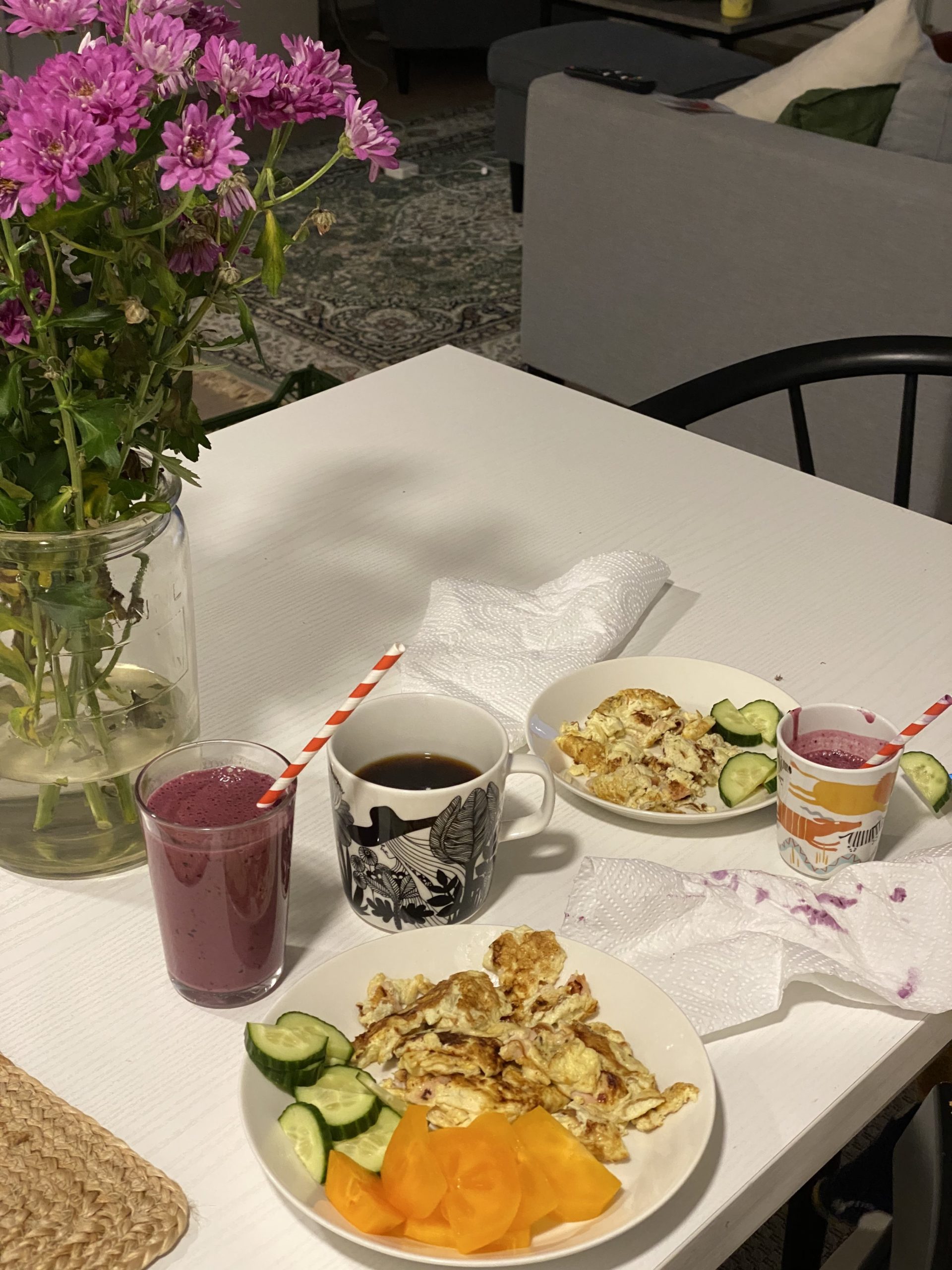 Torstaina tein taas tiivisti töitä kotona koko päivän. Päiväkodilla kuulin Eemin nukkuneen jälleen 30 minuuttia, mikä oli toki paremmin kuin keskiviikkona, joka oli kyllä aika suoritus. Päiväkodin aloituksen aikaan, tammikuussa, Eemi nukkui juurikin 20-40 minuuttia ensimmäiset kuukaudet. Hän heräsi joka liikkeeseen eikä oikein uskaltanut vaipua syvään uneen. Nyt aloin miettiä, että olisiko henkilökunnan maskivelvoite voinut pelottaa häntä ja luoda turvattomuuden tunnetta, jonka vuoksi hän ei ollut pystynyt nukahtamaan syvään uneen. Ymmärrän toki maskin käytön, mutta onhan se vanhempana todella hurjaa ajatella, että oma lapsi ei näe koko päivänä häntä hoitavien aikuisten kasvoja kunnolla, ei ilmeitä tai eleitä, ei suun liikkeitä, jotka ovat puheen kehityksellekin oleellisia.