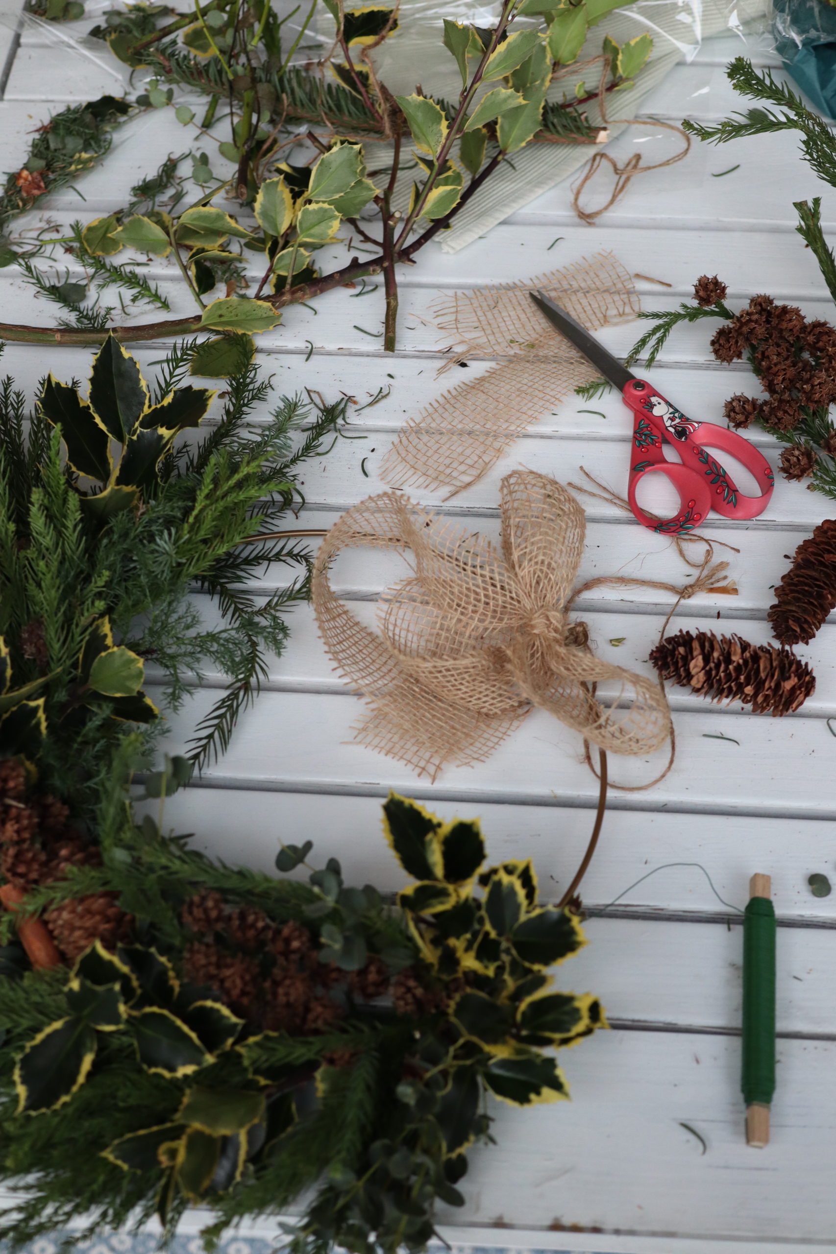 Innostuin kransseista todenteolla ja niinpä lähdin sukulaiseni tontille, jossa on metsää, hakemaan havuja. Mukaan tarttui oksia, varpuja, sammalta ja käpyjä. Auton takakontti oli täyteen lastattu metsän antimia ja kyllä nauratti. Koin kranssien tekemisen niin rentouttavana ja erilaisena tekemisenä, siinä pääsin uppoutumaan ihan muuhun ja unohtamaan kaiken. Samalla reissulla hain vielä Eurokankaasta kasan kankaita, jotka olivat -20% alennuksessa. Keksin alkaa ompelemaankin tässä kaiken keskellä, kuin tekemisestä olisi puutetta! Mutta ajattelin itse ommella vohvelikankaasta käsipyyhkeitä päiväkodin henkilökunnalle lahjaksi käsisaippuan kera.