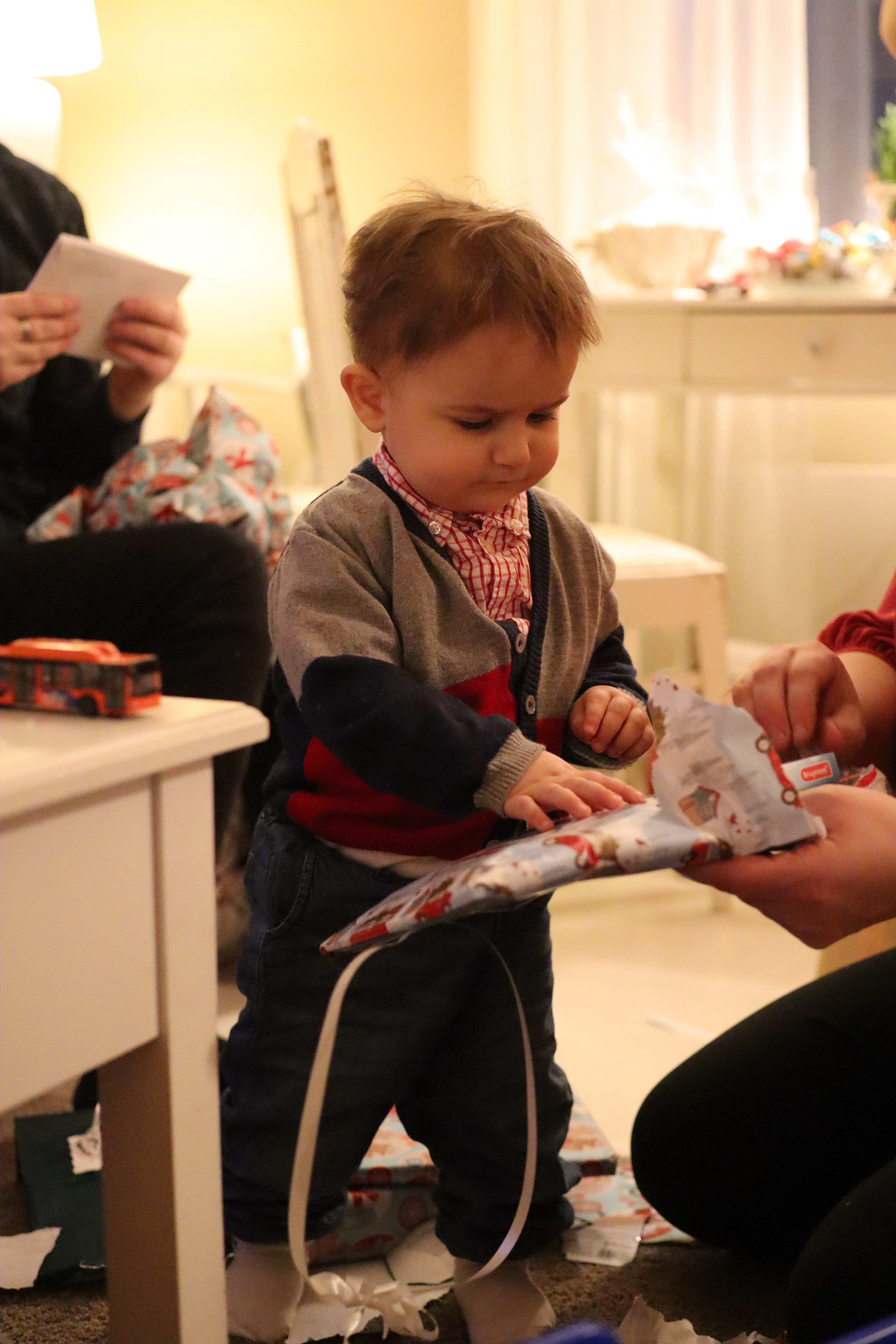 Vietimme Eemin kanssa toista joulua yhdessä. Viime vuonna hän oli juuri 3kk täyttänyt vauva. Silloin hän ei ymmärtänyt joulusta yhtään mitään. Nyt hän on 1v3kk ikäinen taapero ja ajattelin, ettei hän nytkään ymmärrä joulusta yhtään mitään. Ei hän ehkä joulusta mitään ymmärtänyt, mutta ne kaikki paketit! En olisi arvannut, että hän ymmärsi lahjojen päälle! Vielä 1v.synttäreillä hän ei ollut kiinnostunut lahjoista, mutta nyt avaaminen oli mahtavin juttu ikinä. Lahjamäärä pysyi onneksi kohtuullisena, Eemi sai lahjoja kummeilta ja mummilta. Kaikki oli oikein toivottuja ja osuvia lahjoja, jotka pääsevät käyttöön. Omien lahjojen jälkeen hän oli jo muiden paketeilla. Eemi toimikin innokkaana apulaisena.
