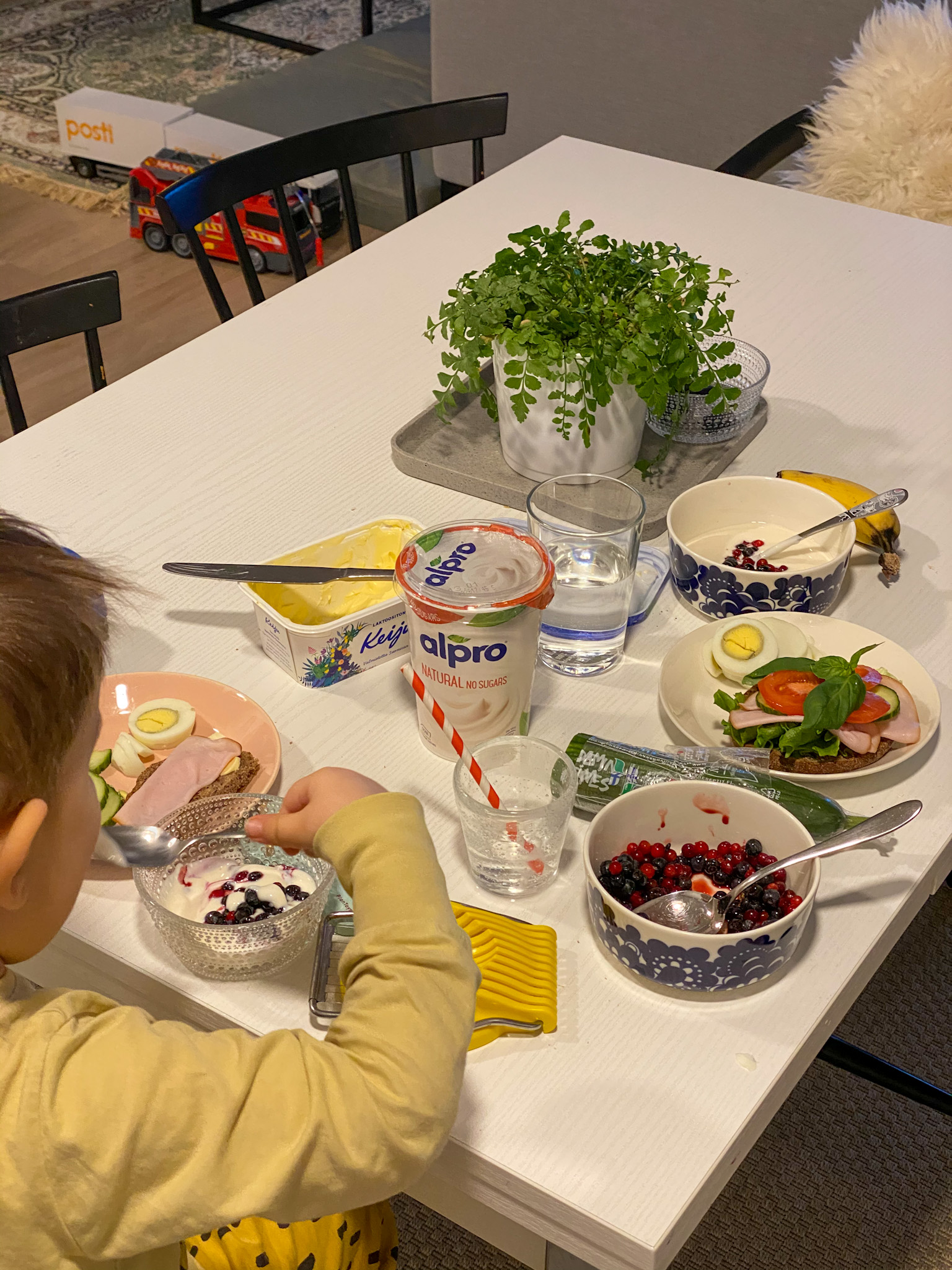 Olimme iltapäivän ystävien luona kylässä. Söimme siellä ruoaksi riisiä ja kanaa tomaattikastikkeessa sekä salaattia. Jälkkärinä me veimme kaurajugurtteja mukanamme. Lapsilla oli tosi kivat leikit jälleen yhdessä ja tietysti harmi tuli, kun oli alettava siivota. Ystäväni puoliso keksi kivan leikin siivoukseen. Lapset laittoivat kaikki autot ensin riviin ja siitä yksi kerrallaan ne ajettiin paikalleen lelulaatikkoon.