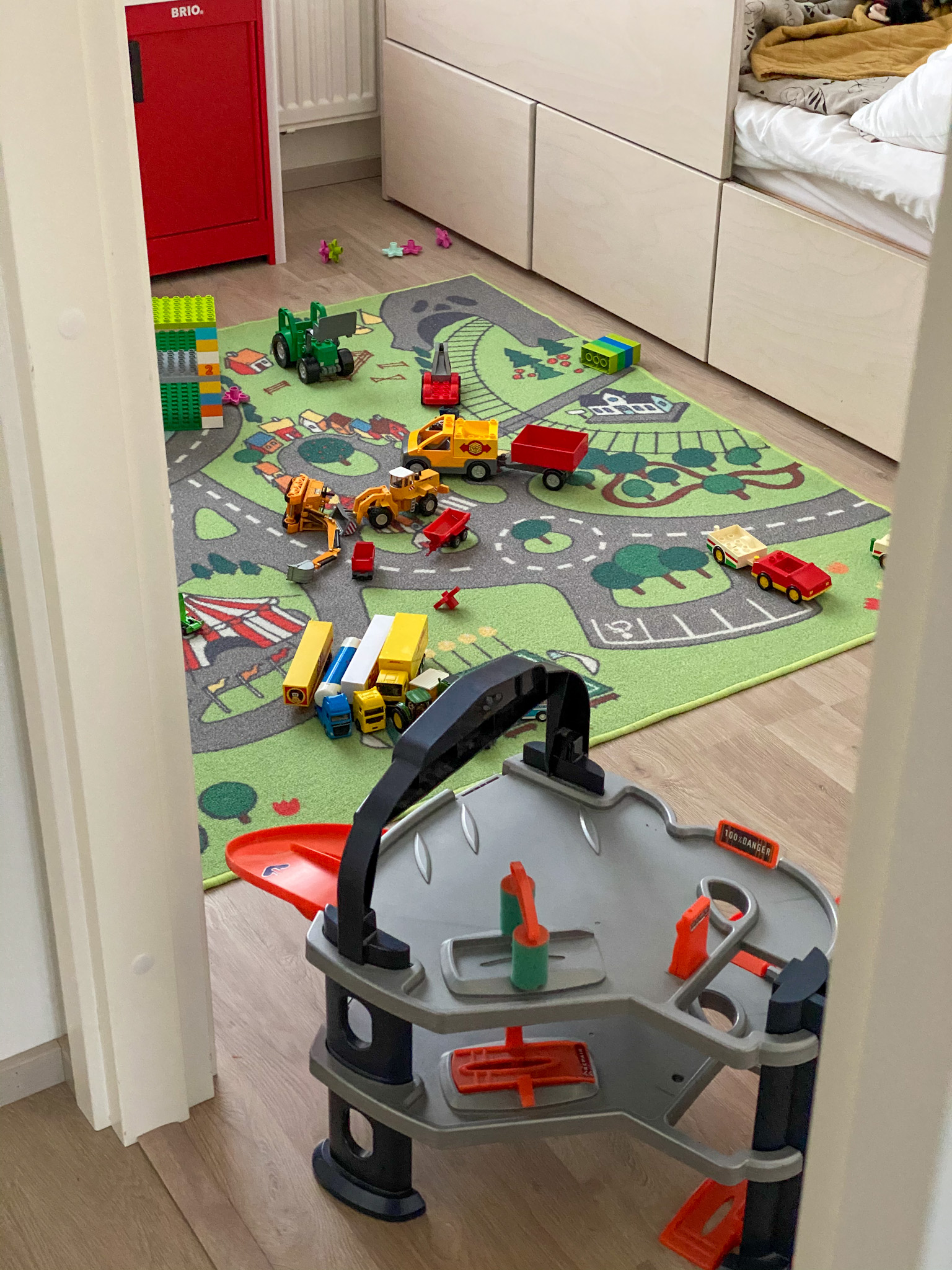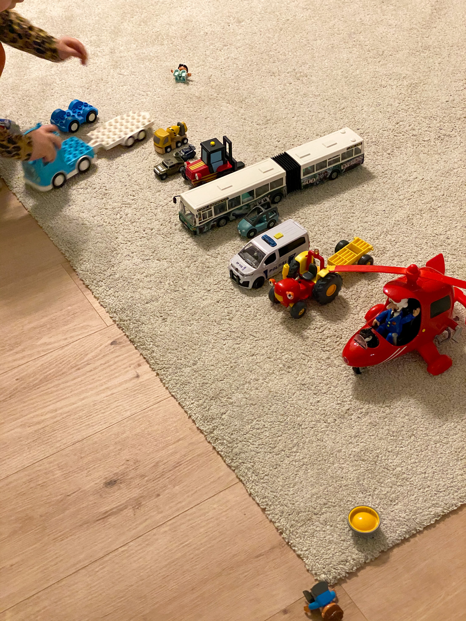 Tulimme sisälle noin klo 11.15. Laitoin ruoan uuniin ja odotellassa vielä leikittiin autoilla. Rakensimme Duploista autotallia pikkuautoille.