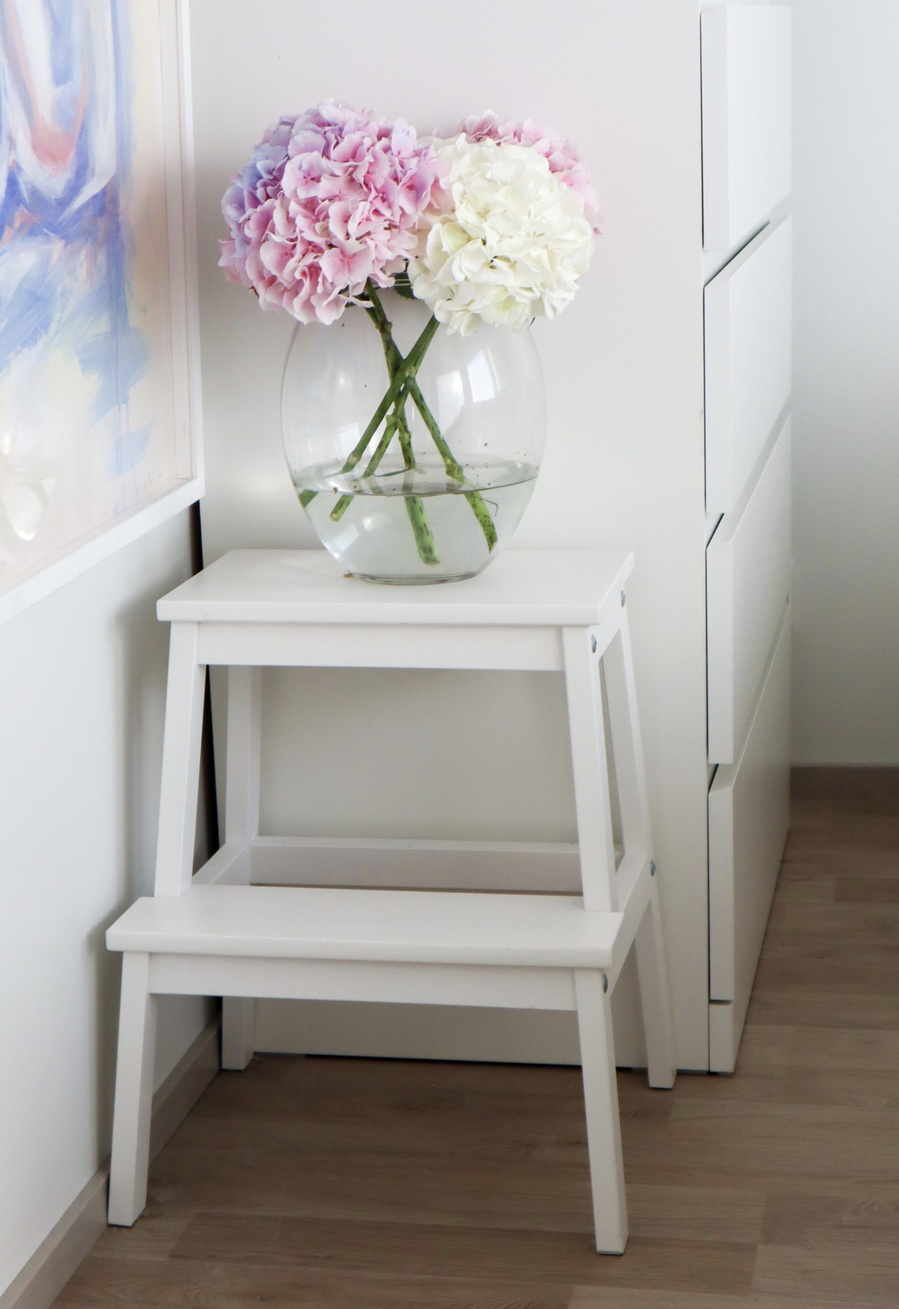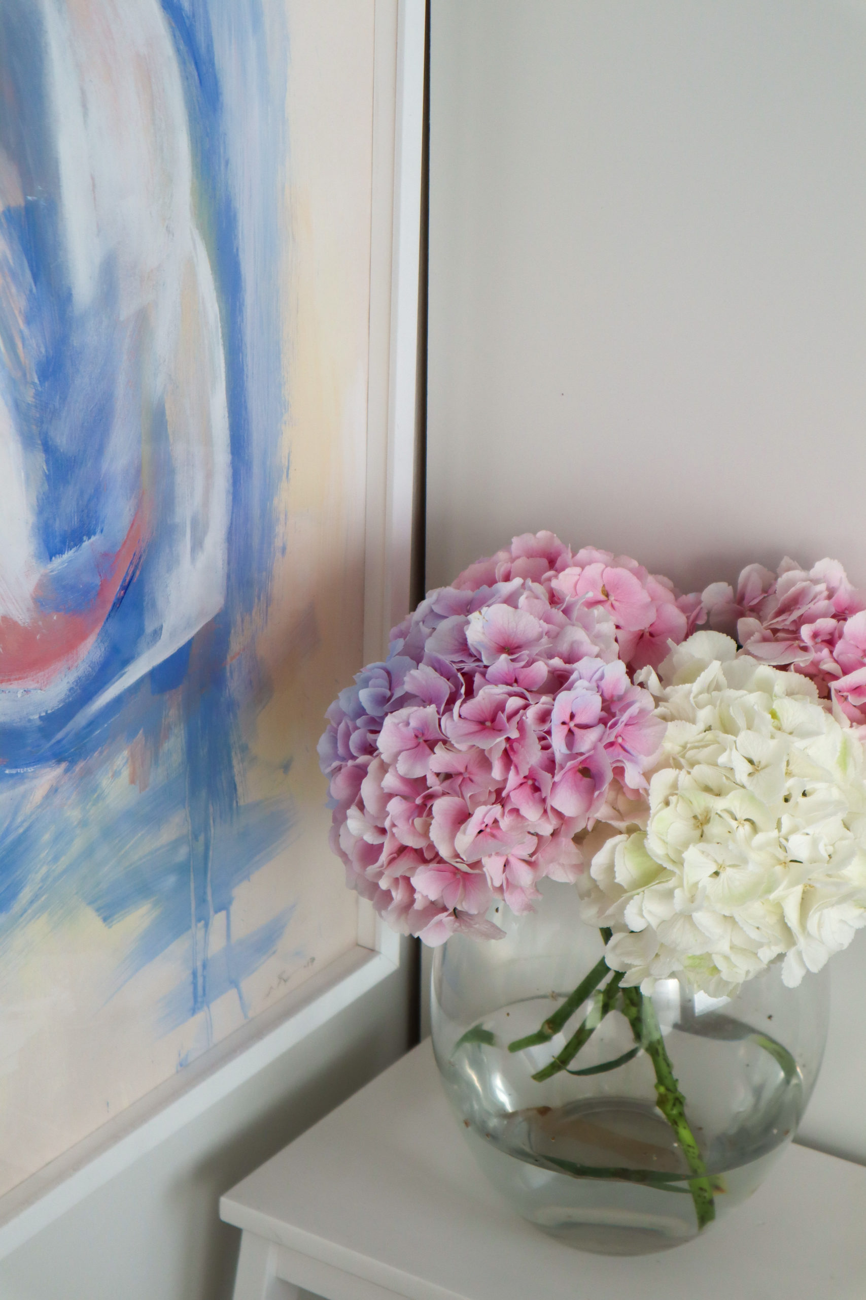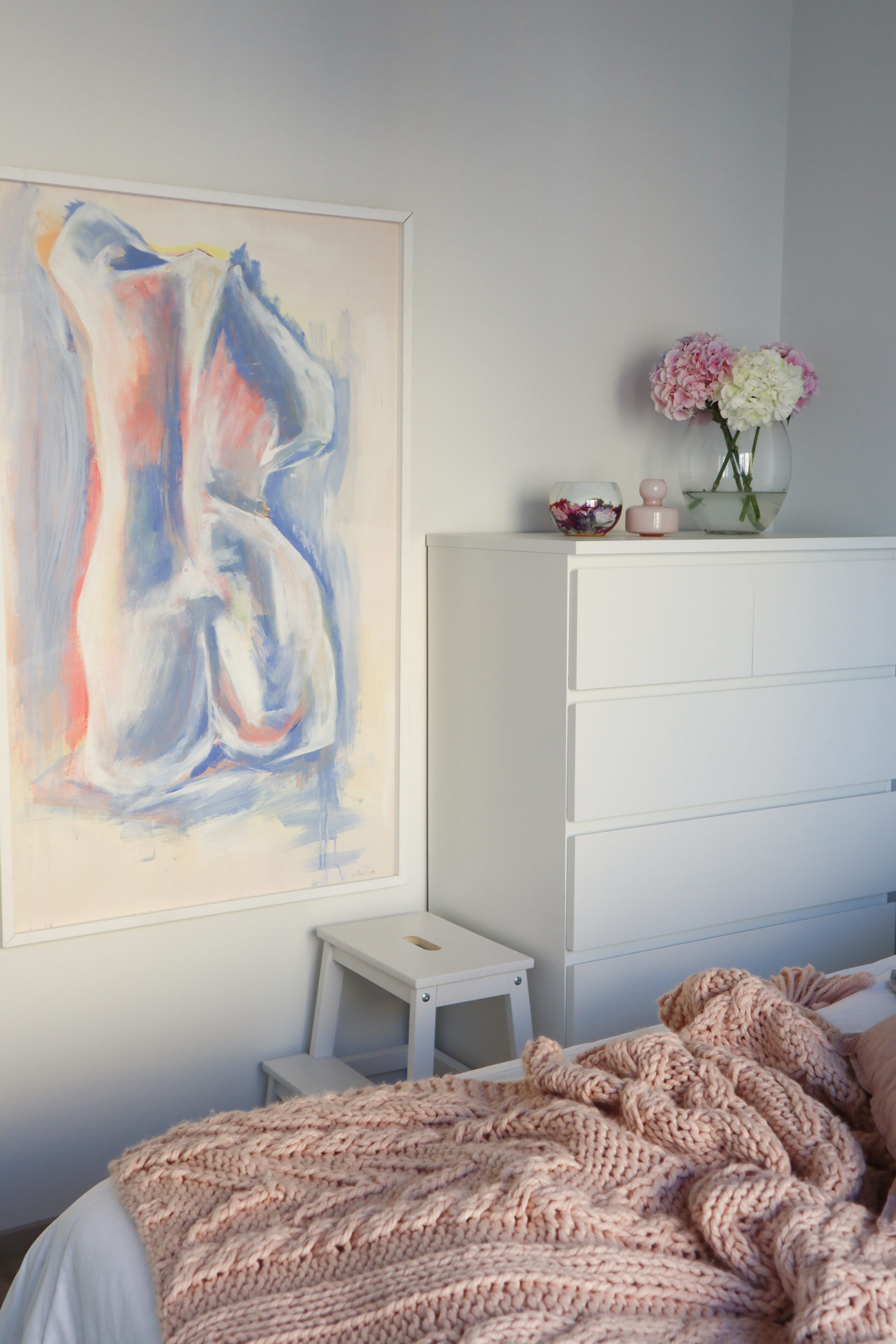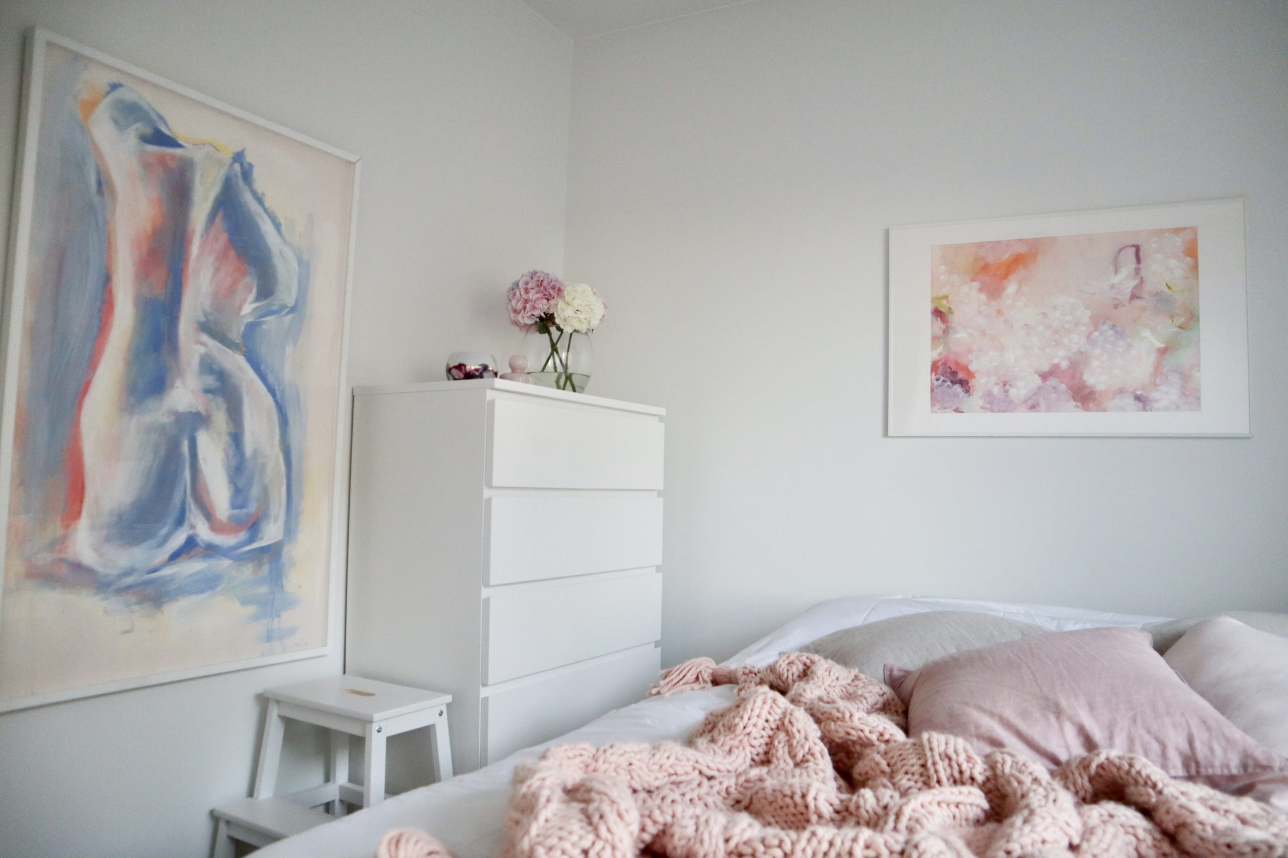 Toinen ihana taulu on Sanni Olasvuoren käsialaa ja tilasin sen häneltä tänä keväänä. Taululla on toistaiseksi väliaikaiset kehykset, sillä en vielä raskinut kehystyttää sitä. Olen seurannut Sannin Instagramia ja ihastellut hänen mielettömiä maalauksiaan. Viimein minulla on oma maalaus! Se on aivan mieletön, herkkä ja kaunis. Ja siis maalauksen sävyt ovat upeaita, aivan minun näköinen. Vaikka nämä huoneeni kaksi taulua ovat erilaisia, on niissä jotain samaa ja mielestäni ne sopii todella hyvin samaan tilaan.
