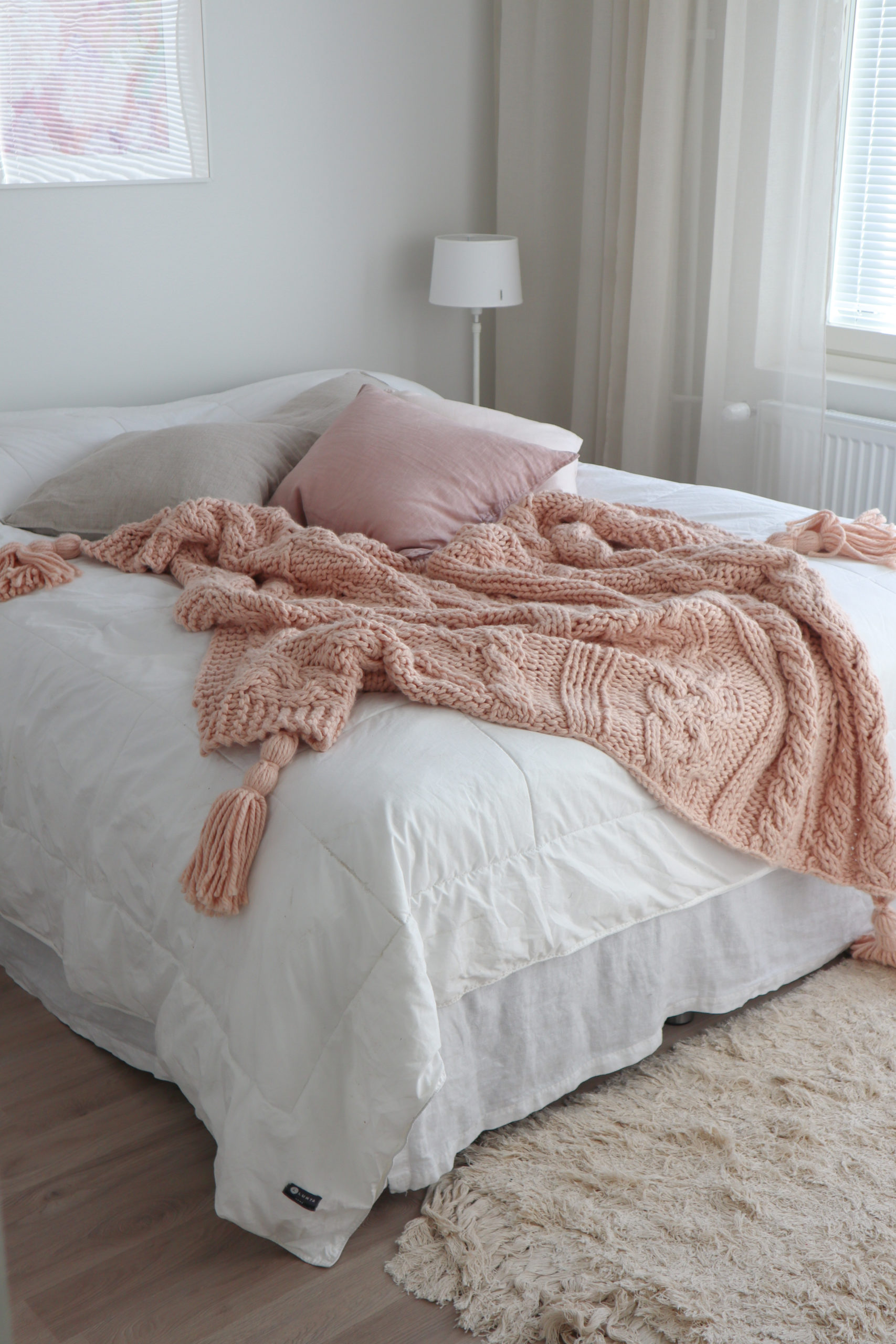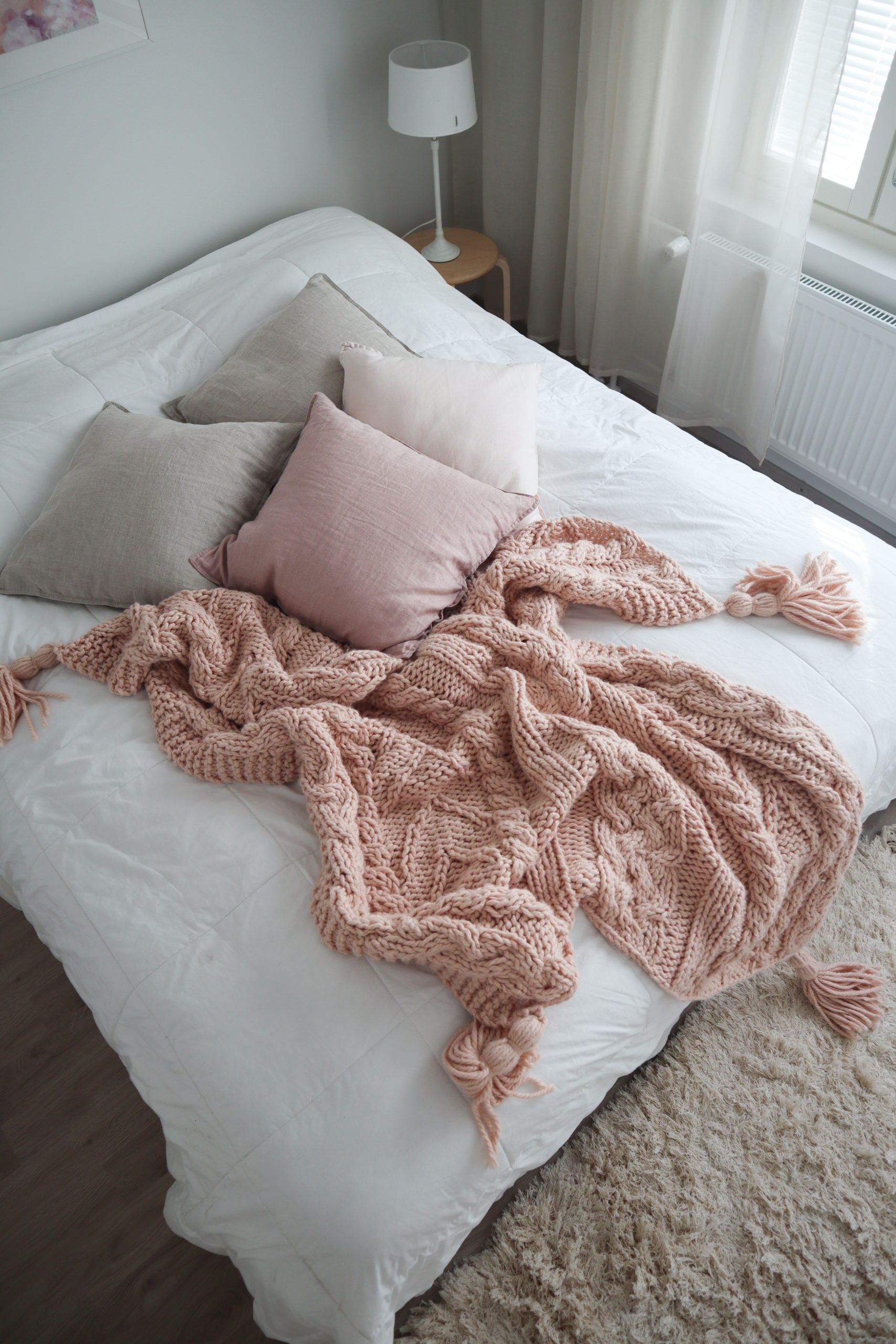 Sängyllä oleva kaunis viltti on ostettu Anuashop-verkkokaupasta. Koristetyynyt ovat H&M Home pellavatyynyjä yhtä lukuunottamatta, joka on Ikeasta. Tyynyt ovat olleet käytössäni jo vuosia. Minulla on useampia tyynynpäällisiä, sillä niillä saa helposti vaihdettua kodin ilmettä. Pellavainen helmalakana on myös H&M Homen.